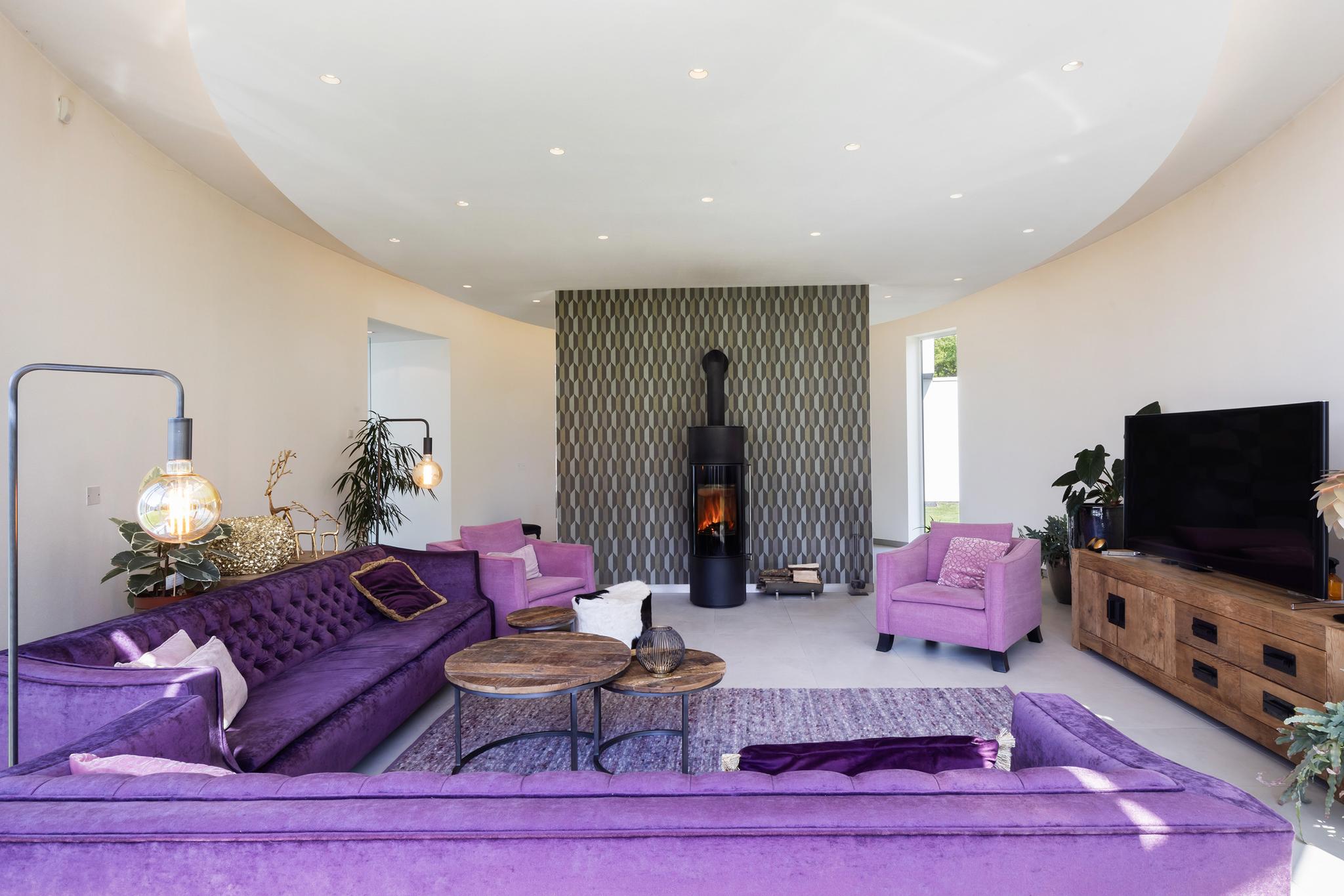On the left-hand side of the hall is an oval room, currently serving as a second lounge, with a seating area around a wood-burning stove and an adjoining television room. French doors and tall windows offer access to the garden.