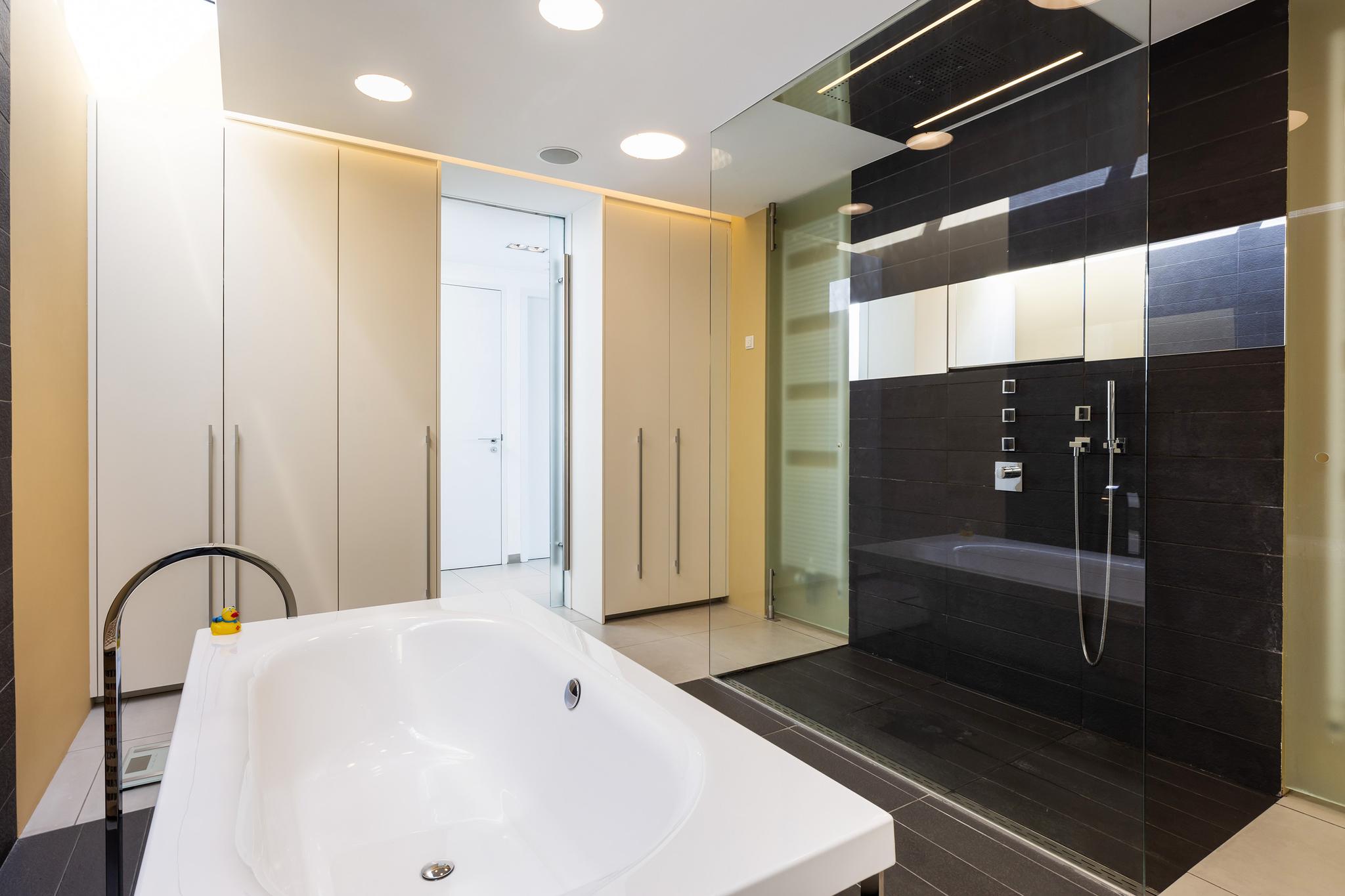 The master suite on the waterside is both spacious and refined, with sweeping views, a large walk-in wardrobe and an elegant bathroom. This includes a freestanding bath, twin basins with vanity unit, walk-in rain shower and ample storage. A separate WC with washbasin completes the suite.