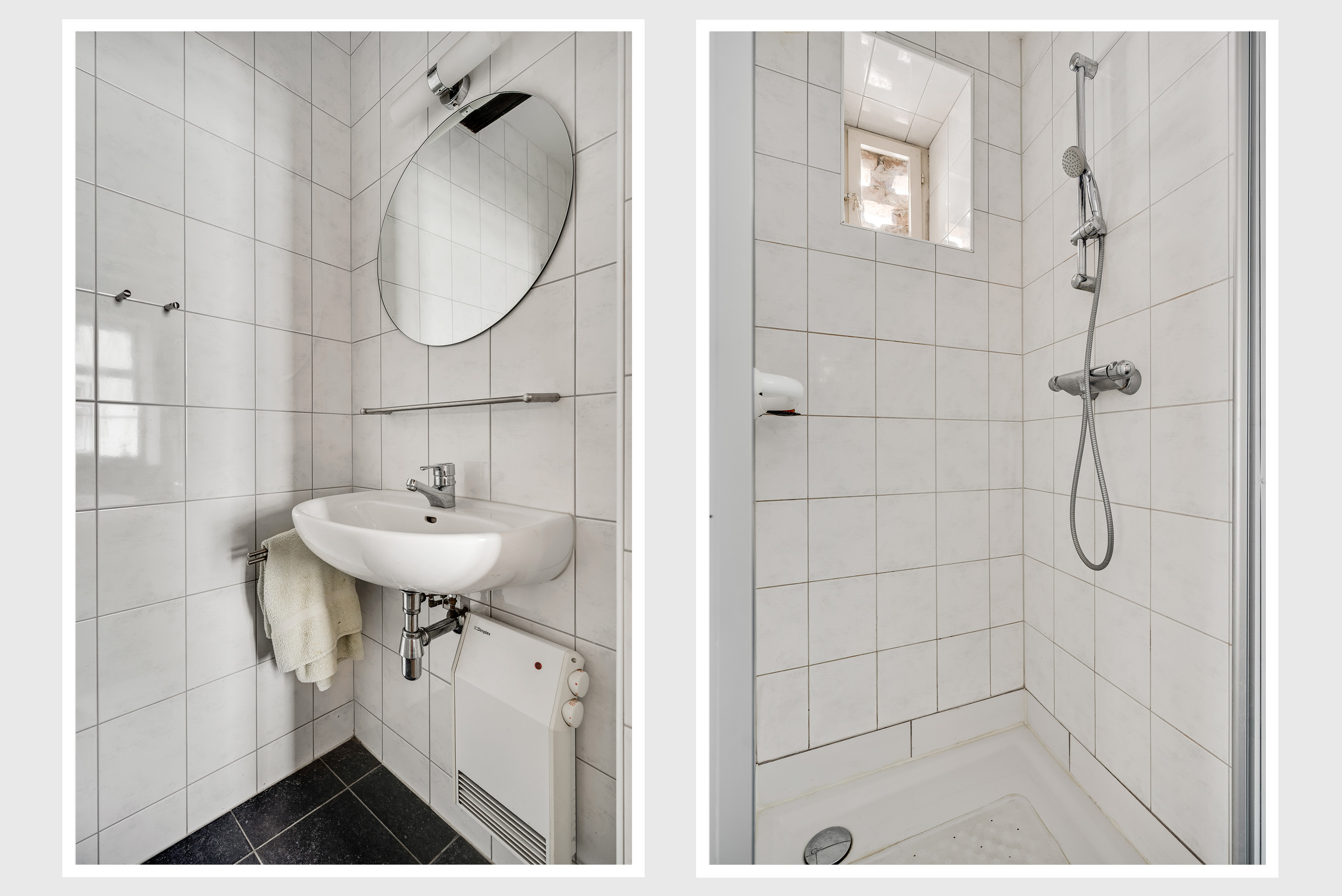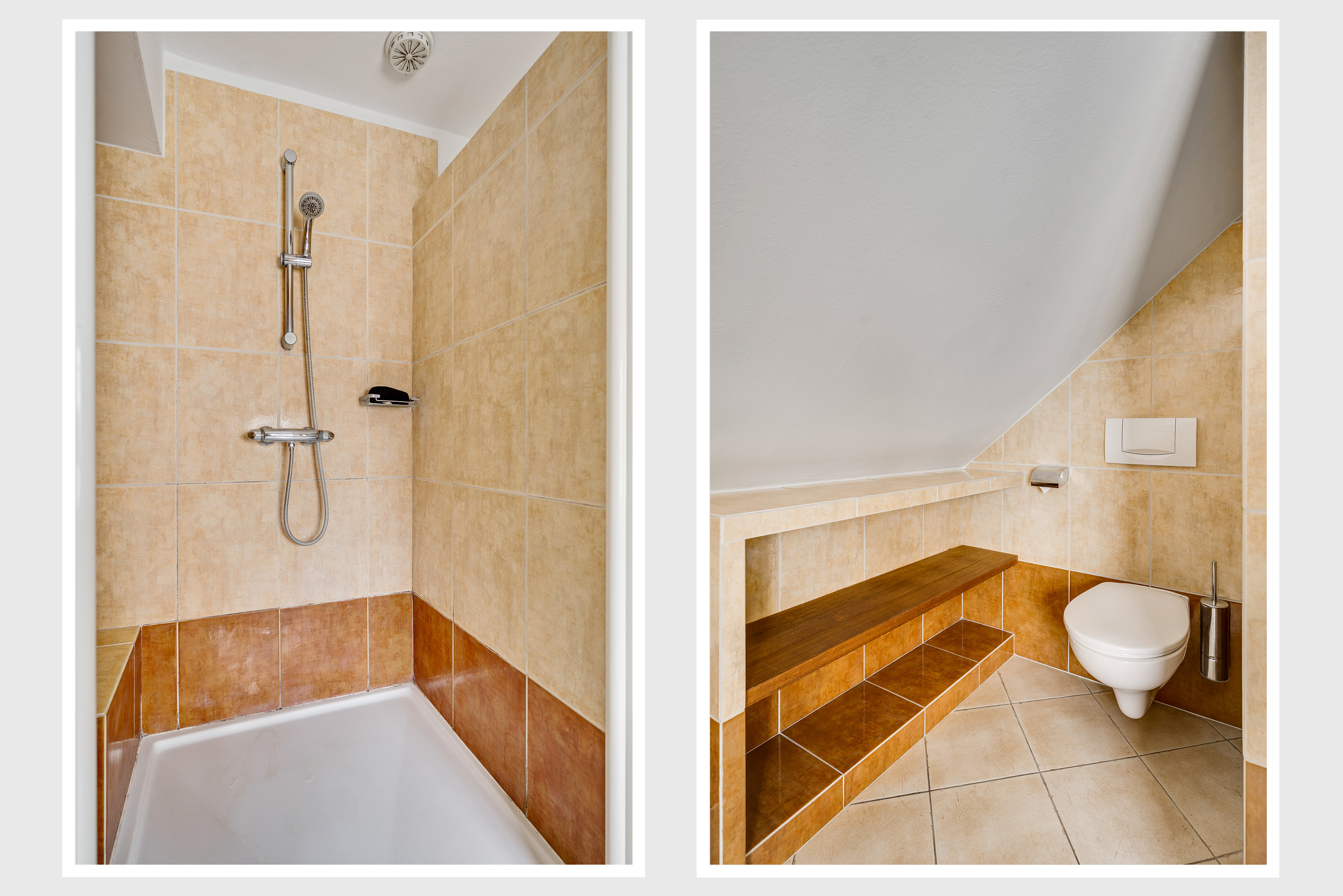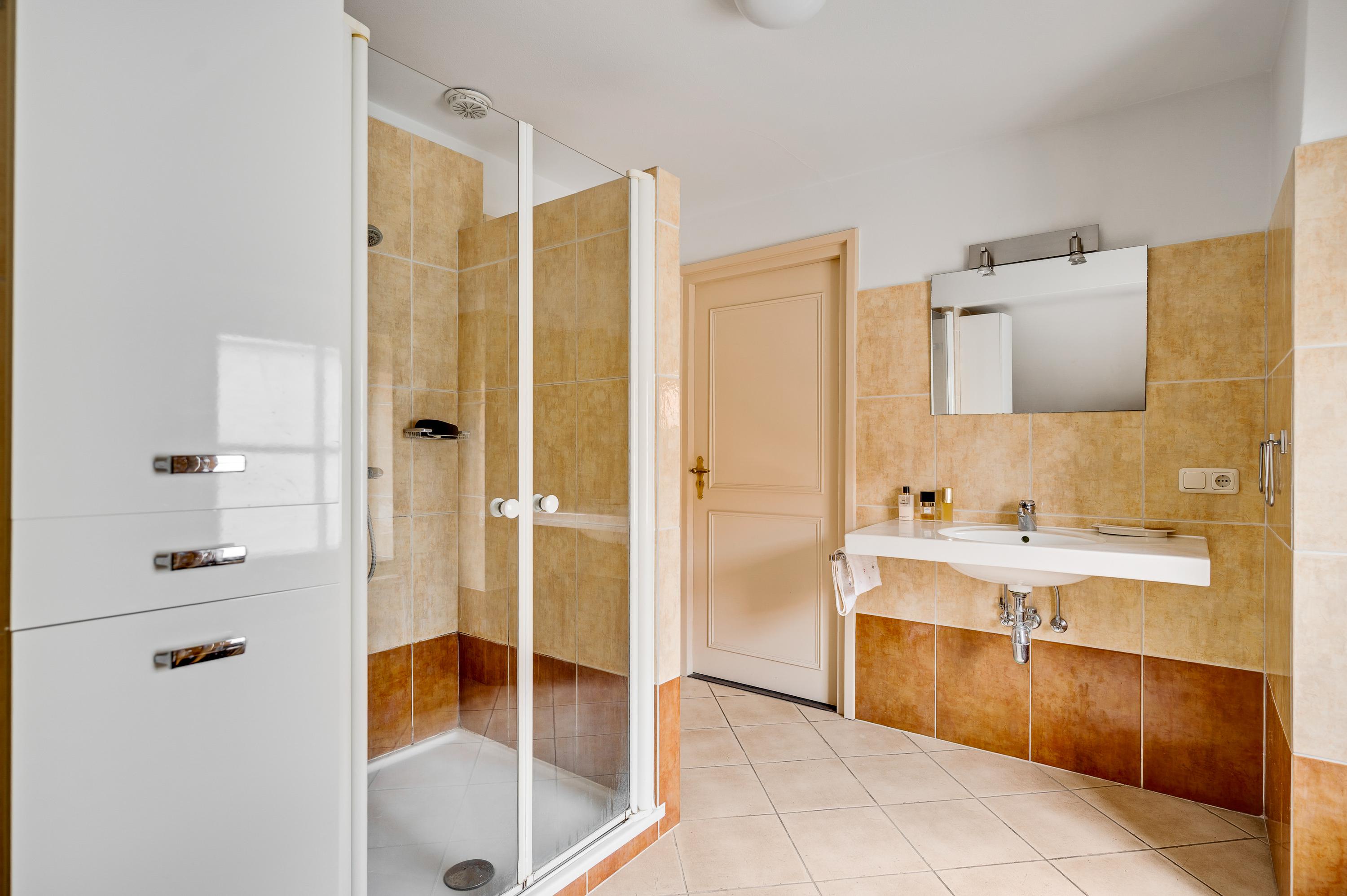 The spacious hall with a fireplace and meter cupboard provides access to the toilet, a bedroom with a separate bathroom, and the kitchen. The stairs to the first floor are also accessible from the hall. The hall also served as the B&B's former living room. This space can be used for various purposes.