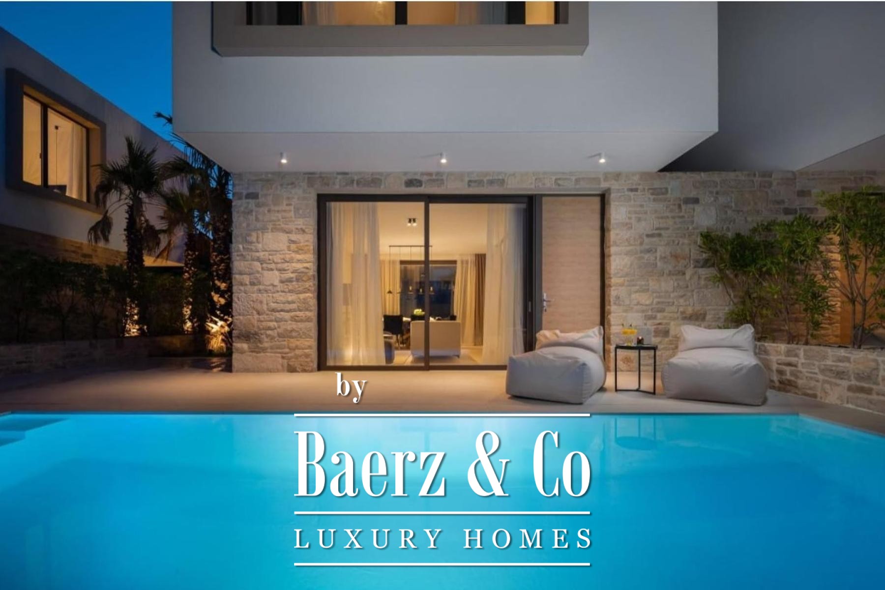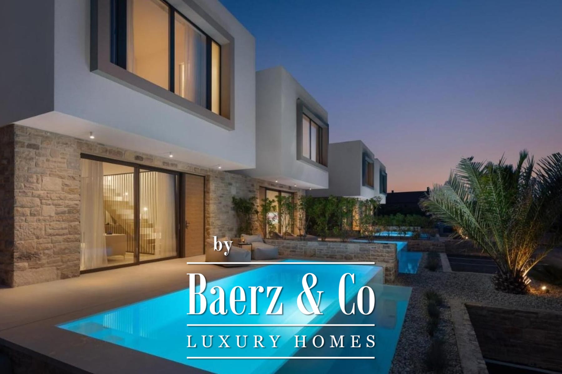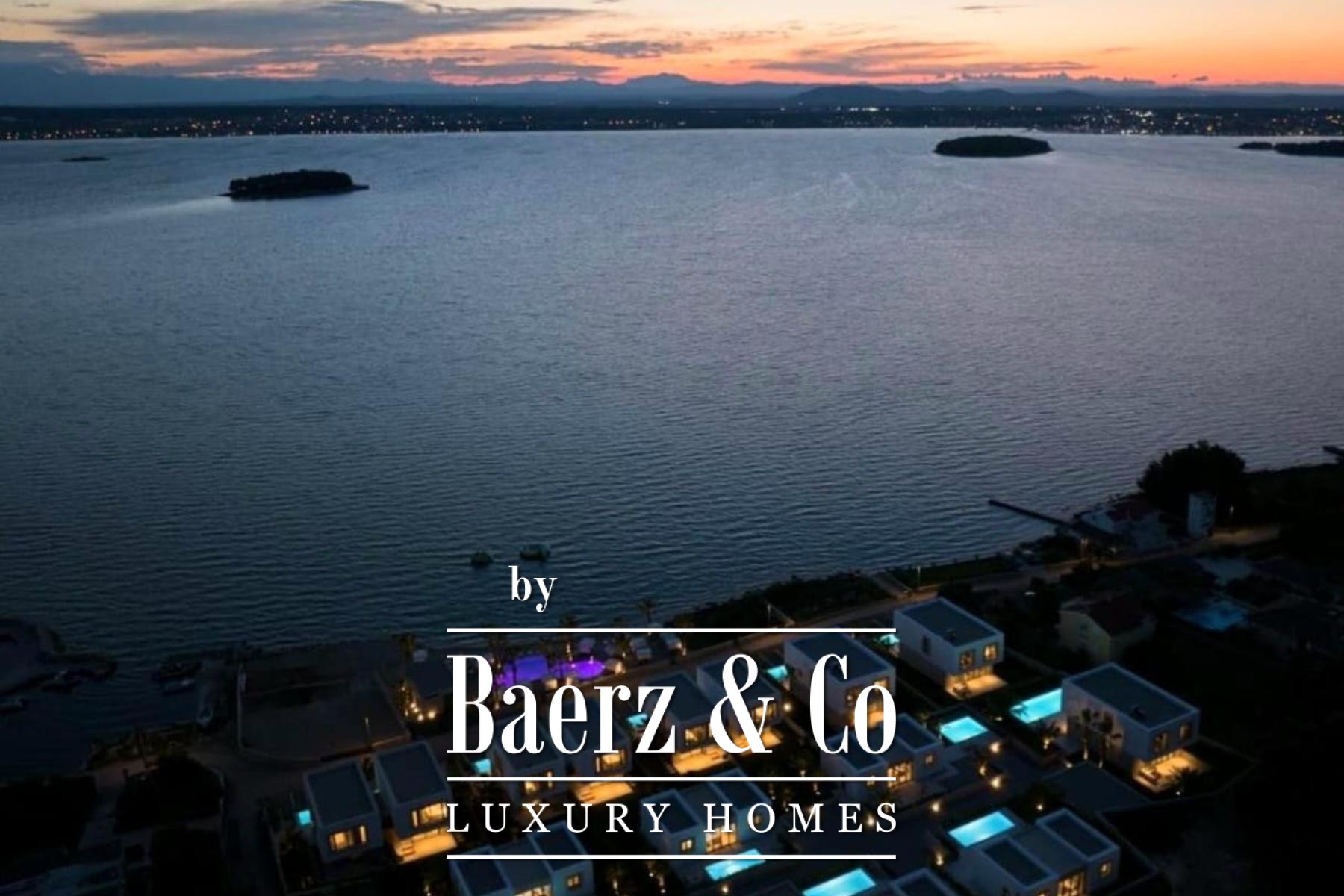 Townhouse Tkon stands within the Palm resort on the island of Pašman, Croatia, presenting a refined modern villa experience with prominent sea views. This townhouse Tkon is set on a 301 m² plot and offers 160 m² of living space arranged over two levels. The first floor welcomes with an entrance area, guest toilet, and a fluid open-plan kitchen, dining, and living space that extends to a terrace overlooking the Adriatic Sea.