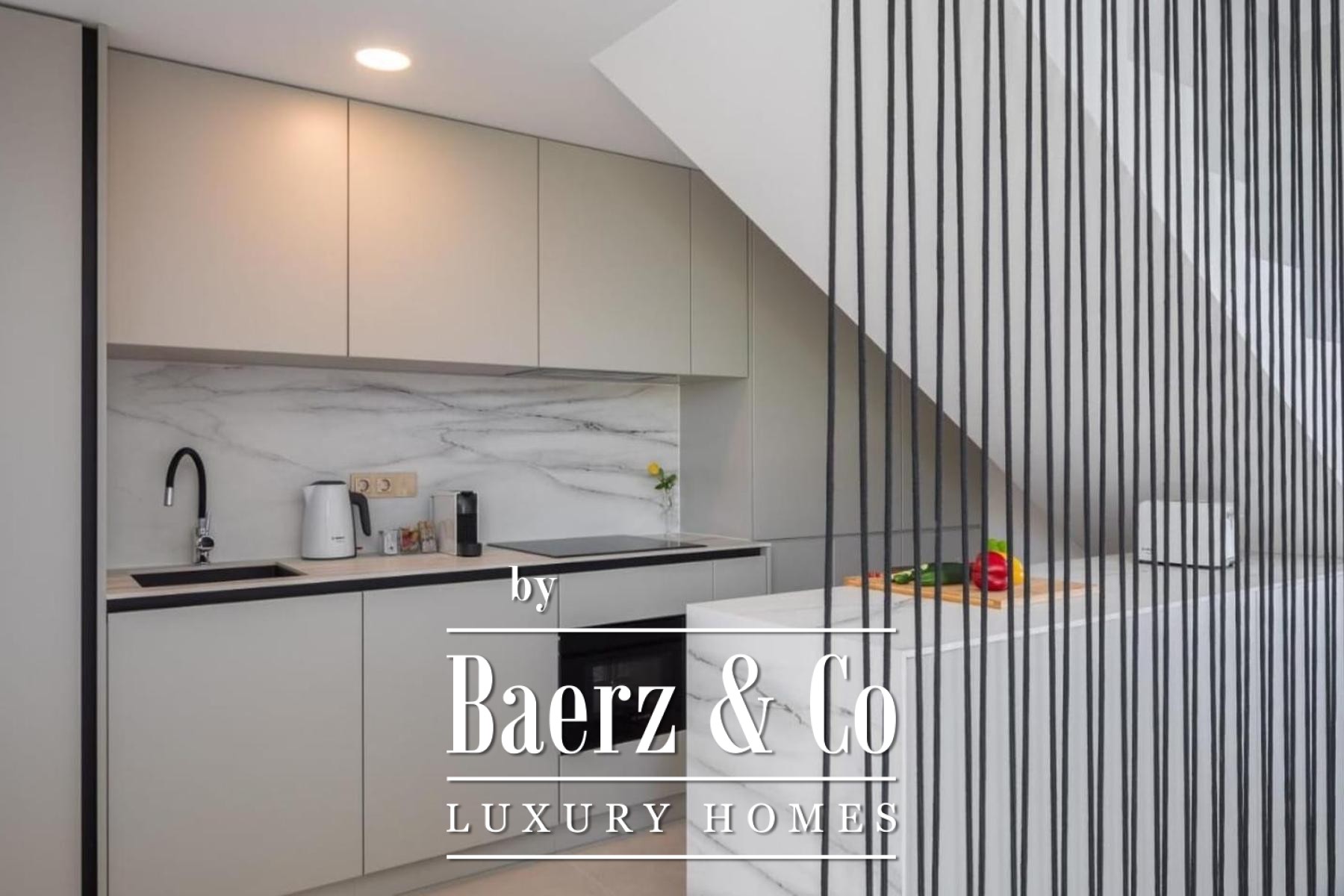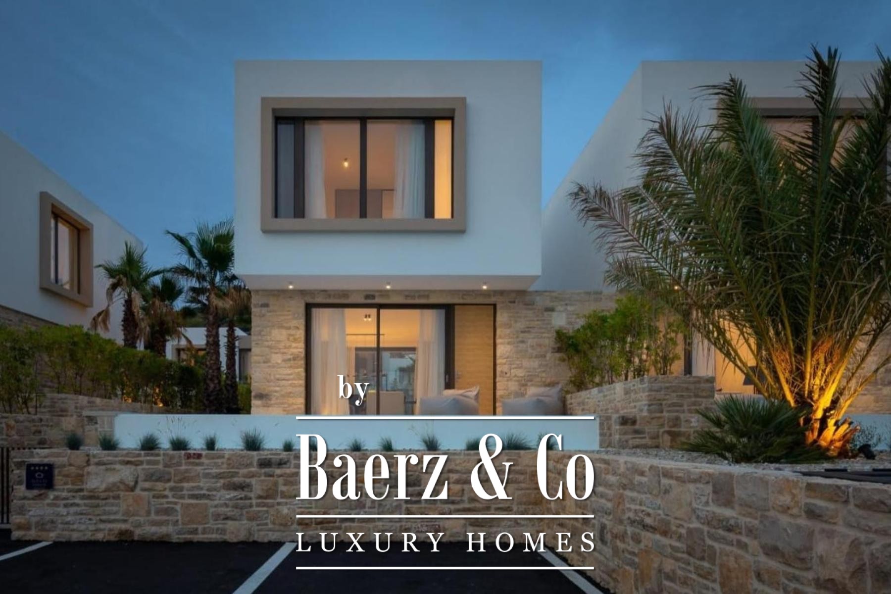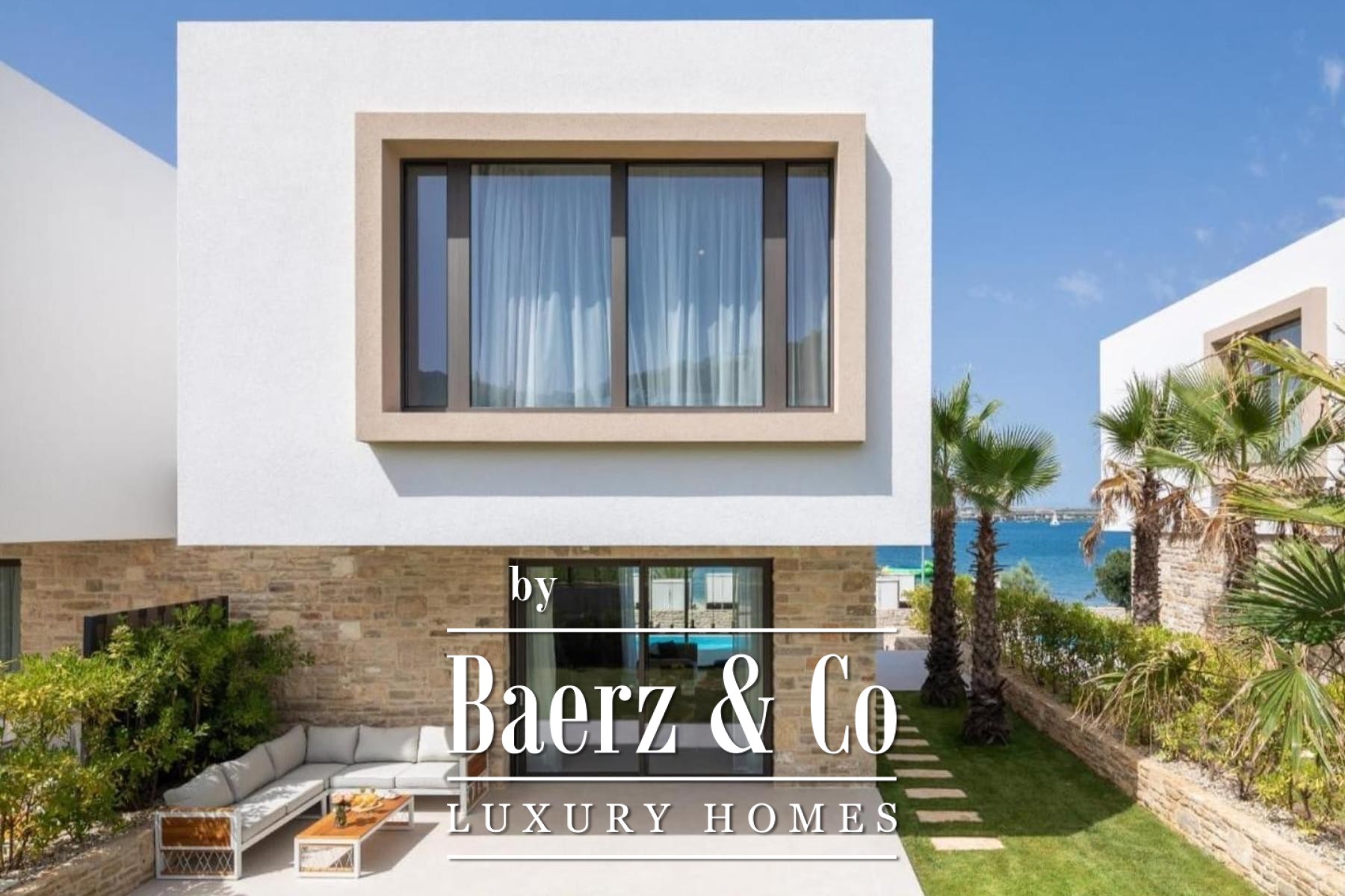 Ascend an internal staircase to the upper level, where the master bedroom features an en suite bathroom, joined by two further bedrooms, each with sea views, and an additional bathroom. Throughout, the design is understated and contemporary. Outside, a landscaped garden frames a terrace, sunbathing area, and pool measuring 17 m², providing serene private spaces for relaxation.