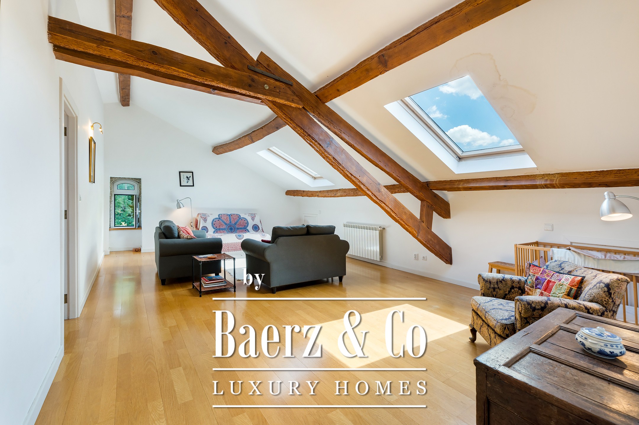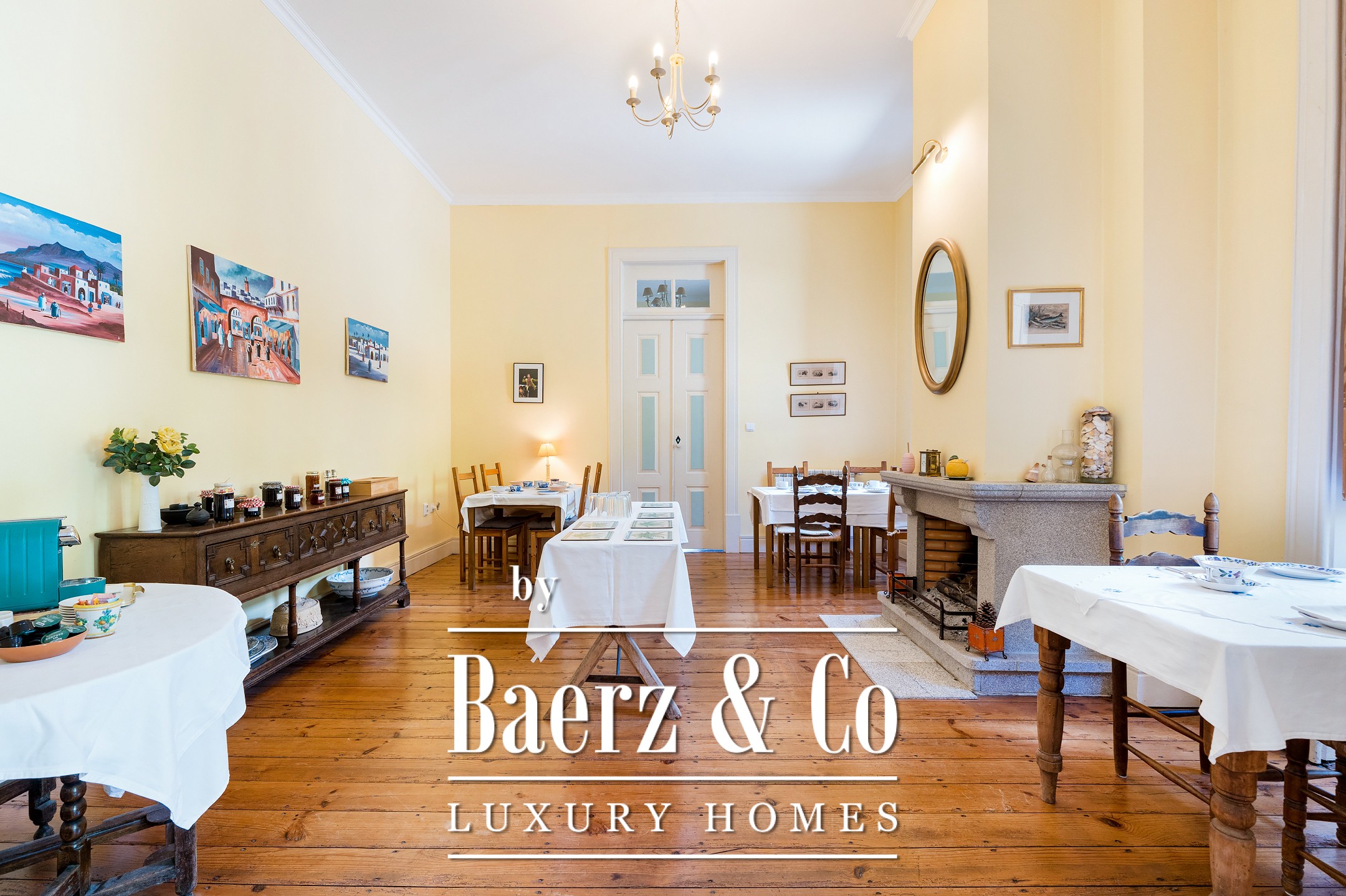 The house spans 800 m² across three thoughtful floors. Six suites anchor the living experience, with four offering private salons for retreat and reflection. Communal spaces unfold with a generous ground-floor living room overlooking the countryside, a fireplace at its center, and a kitchen with dining area illuminated by tranquil garden views. Substantial double-glazed windows frame vistas of the mountains, river, and vine-laden slopes.