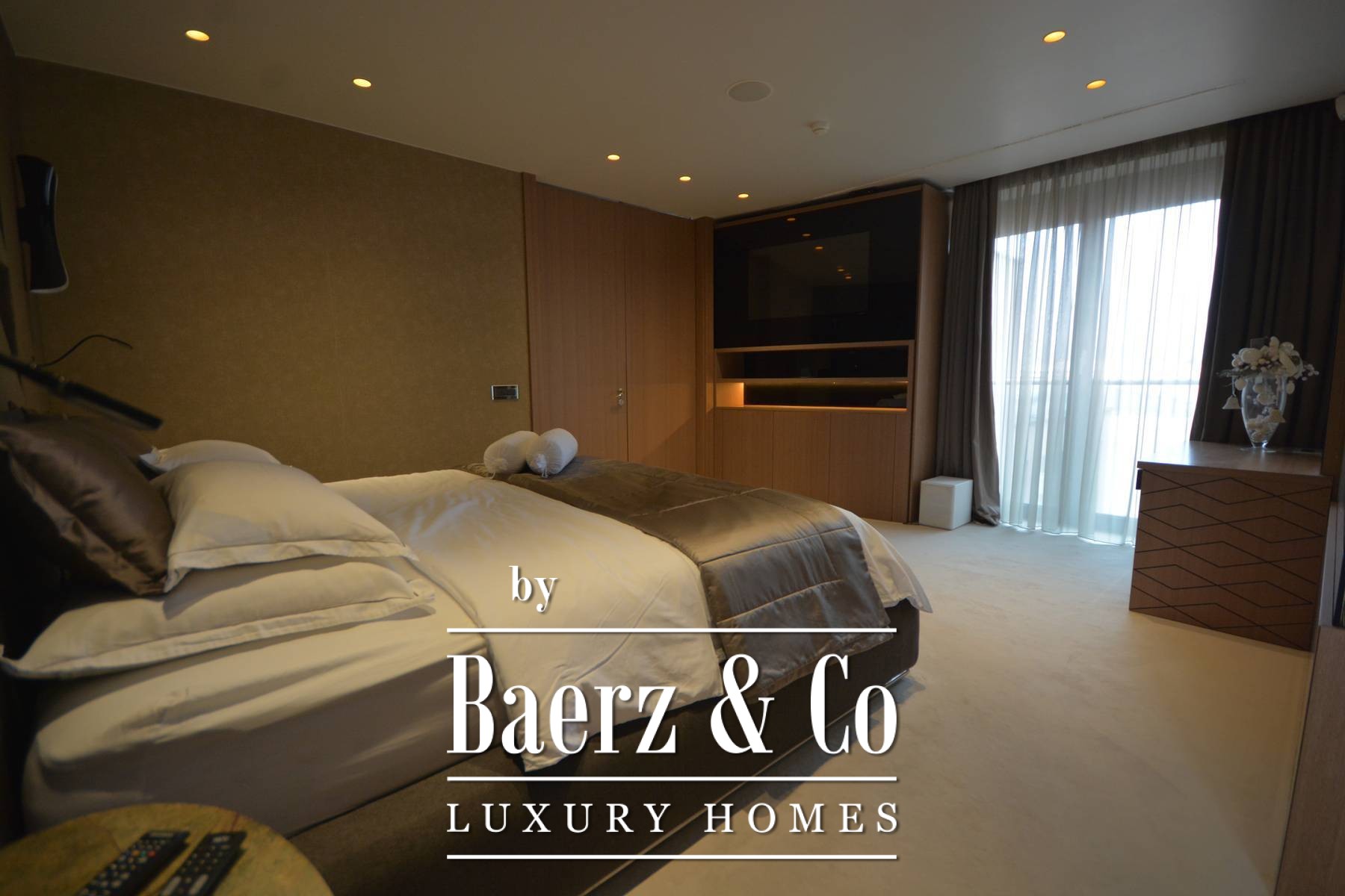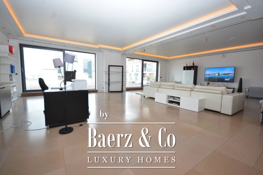 Apartment Trnje stands at the western edge of Zagreb, offering a refined living experience close to the city’s business district and main thoroughfares. This apartment, with a living area of 288 m² and a vast 213.20 m² terrace, commands sweeping views across the capital. Located on the fifth floor, the residence comprises two spacious bedrooms, each with en suite bathrooms, along with a distinctive master suite featuring a private sauna, hydromassage tub, and a walk-in wardrobe. The living room, dining space, and kitchen flow seamlessly out to the terrace, forming the heart of the home and immersing the interior in natural light through floor-to-ceiling windows.