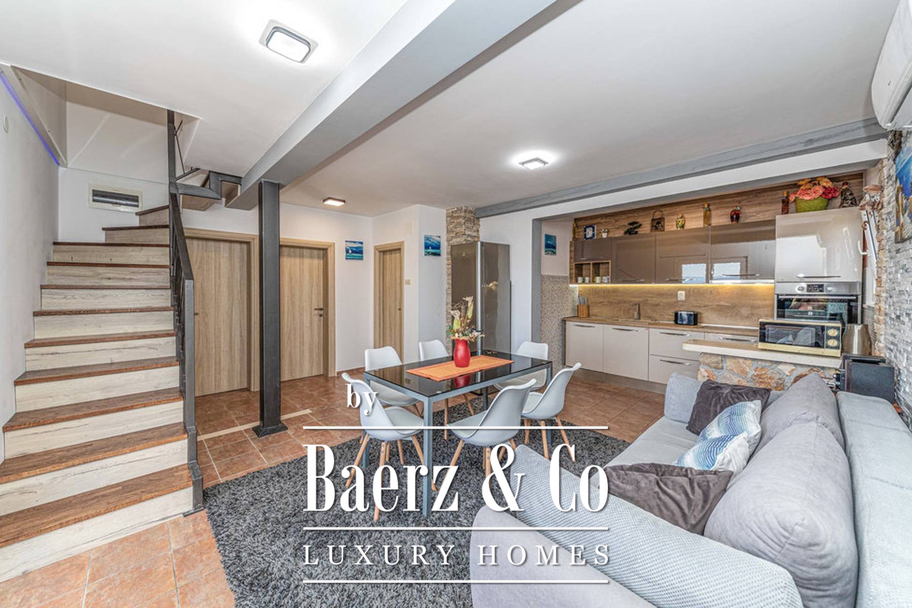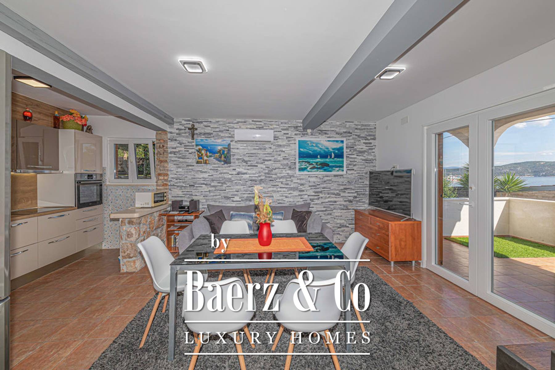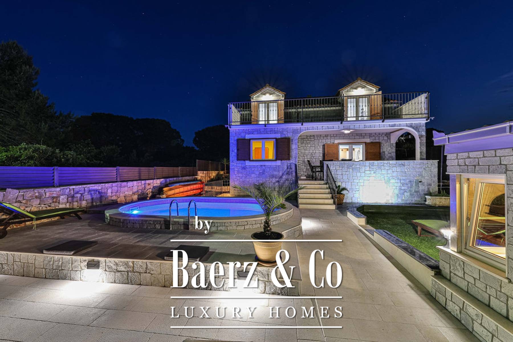 Otok Drvenik villa first row by the sea, an elegant stone-clad villa in a traditional Dalmatian style, located in a unique position first row by the sea with an open view of the sea.Plots of 483 m2 are 3 buildings, the main large building is a villa on 2 floors of 88m2, connected by an internal staircase. It consists of a high ground floor and attic, has 4 bedrooms. The ground floor has a terrace, kitchen and dining room, spacious living room, 2 smaller rooms and one shared toilet, upstairs are 2 large rooms each with its own bathroom and a large terrace with open sea views.Basement with sauna and wine corner and pantry.Auxiliary building by the sea of 49m in which there are 2 rooms with shared bathroom, large fireplace, kitchen and space for socializing. To this building which is a canopy with a jacuzzi, a large yard with an outdoor pool of 16m2, with a sun deck and a children's playground with artificial grass.The whole complex is surrounded by a stone wall combined high with a fence that gives complete intimacy.Behind the main part of the villa as a separate unit is another additional auxiliary building. Small house decorated for living of 46m2, and consists of a bedroom, kitchen with dining area, bathroom with toilet, canopy and water tank.The house was built in 2007. and 2021.g. has been expanded and made the last adaptation