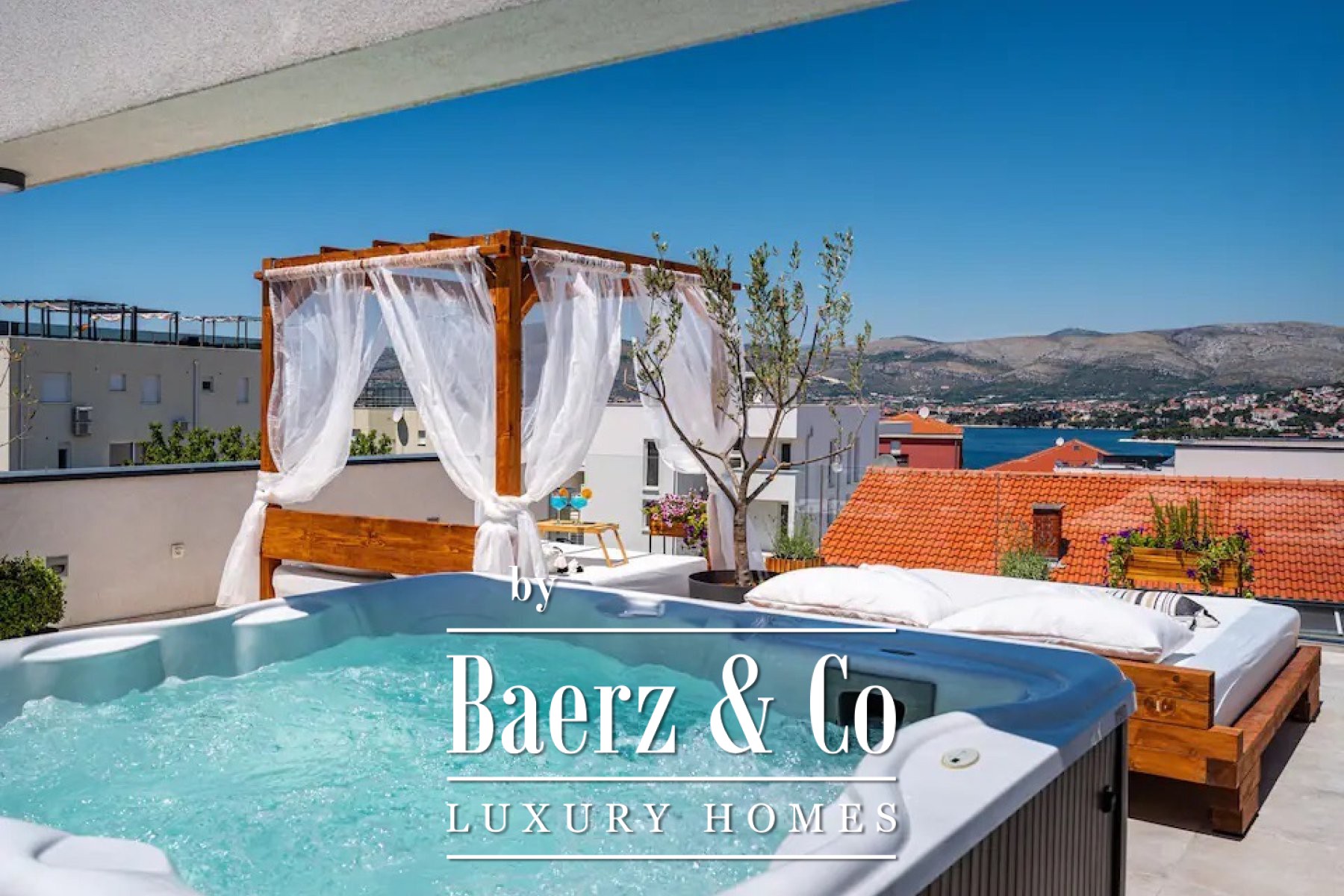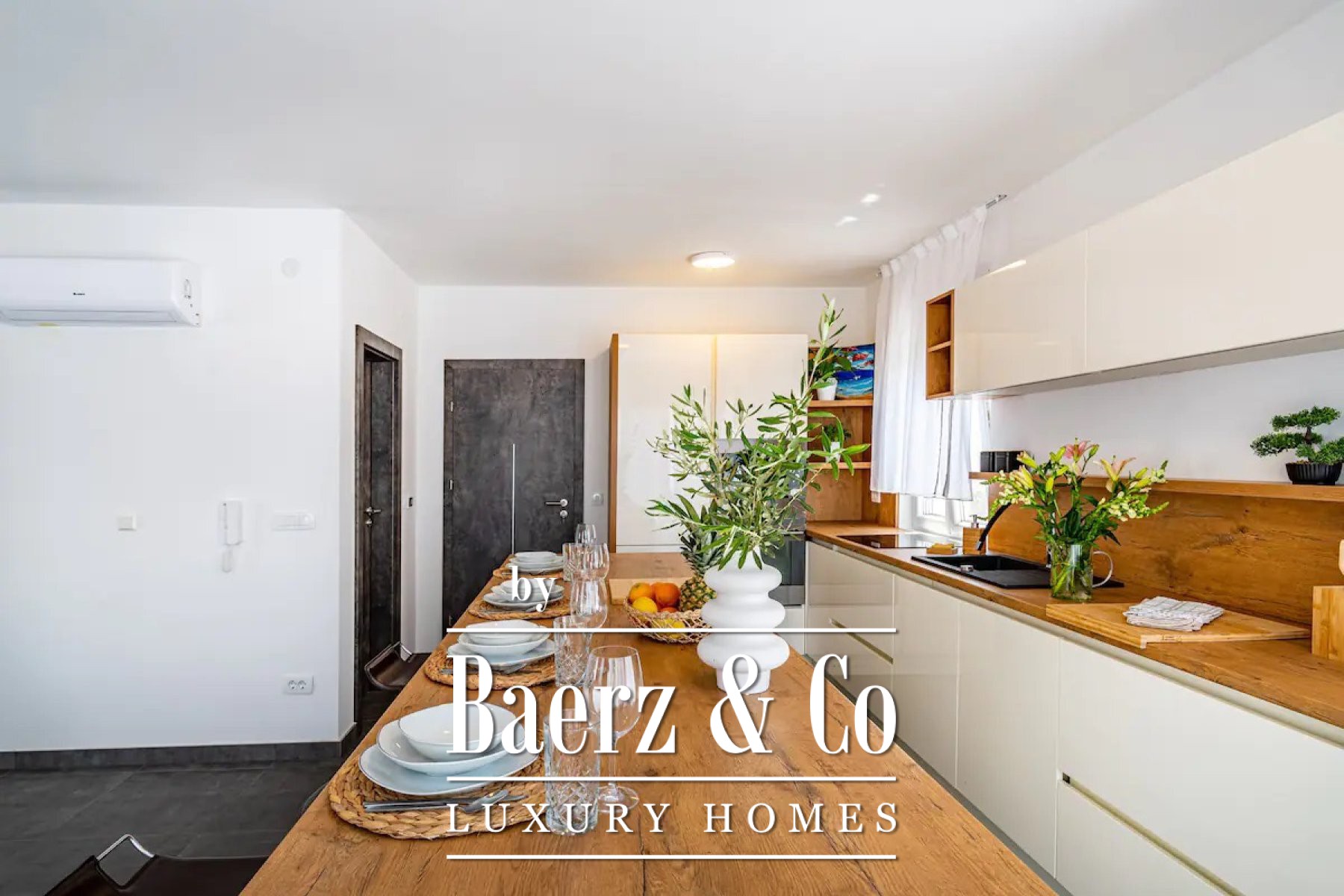 the first floor is a comfortable apartment with one bedroom, a spacious living room, a large kitchen and 2 bathrooms.The main advantage of the house is the roof terrace with summer kitchen, outdoor shower, jacuzzi, barbecue and relaxation area.In front of the house there is parking for 5 vehicles.The house has a view of the sea and is excellent as an investment through tourist rental.Other information on request.