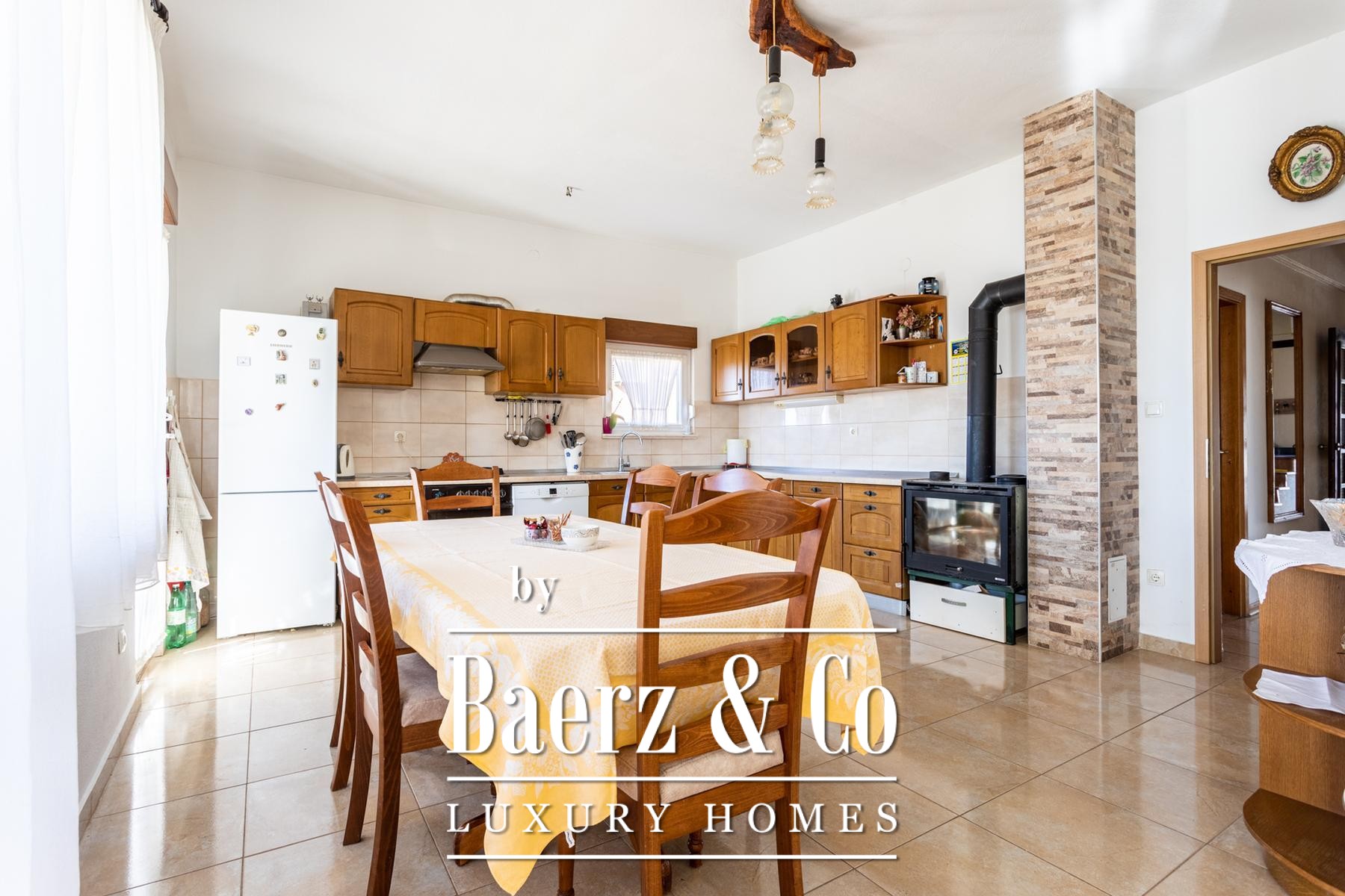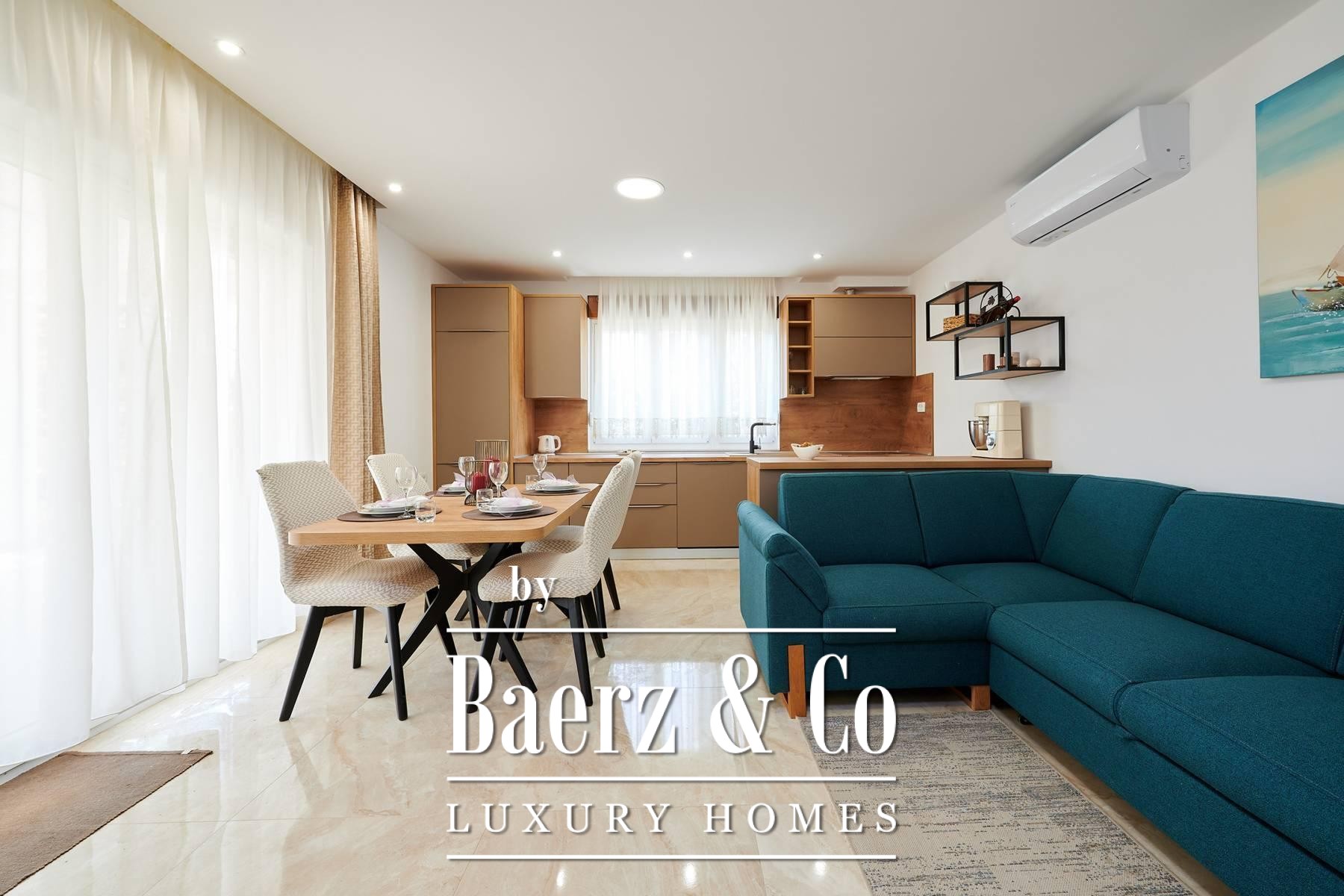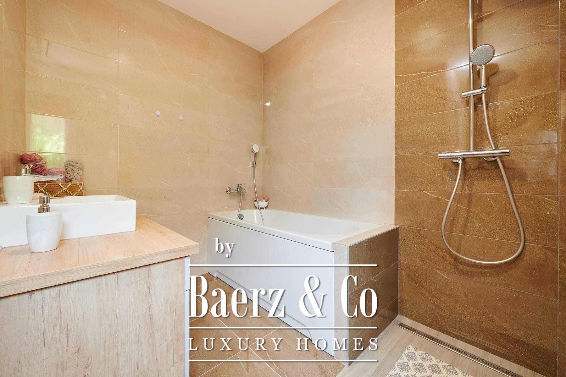 The ground floor features two apartments, each with separate entrances. The first, renovated in 2021, covers 80 m² and includes one bedroom, a kitchen, dining area, living room, and two bathrooms. Its modern finish is complemented by underfloor heating and air conditioning, opening to a covered terrace that connects seamlessly to the outdoors. The second ground-floor apartment, at 55 m², offers two bedrooms and is well-suited for both short or long-term stays.