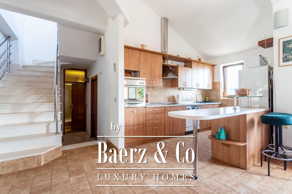 Three levels shape the spatial experience. The light-filled basement houses an independent 55 m² apartment with two rooms, a kitchen and dining area, bathroom, and private entrance. Practicality unfolds further with a garage for two cars, two generous storage rooms, and a dedicated boiler room. Ascend to the main ground floor, where an open kitchen and living area segue into a double-height dining space, delivering panoramic sea views. Two bedrooms, a bathroom, and an elegant hallway complete the flow. Internal stairs continue to the upper floor, hosting two additional rooms, a gallery, and a bathroom.