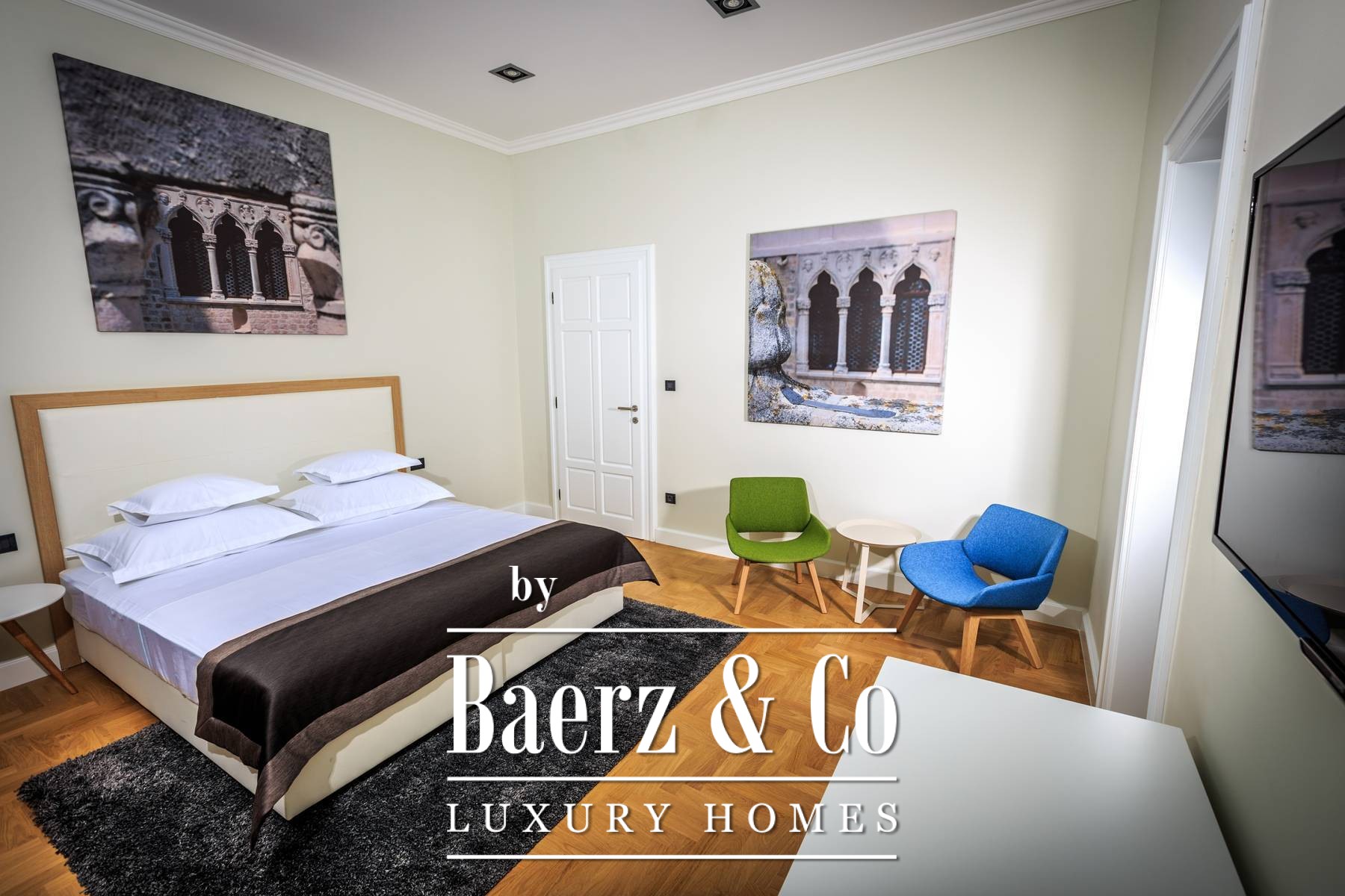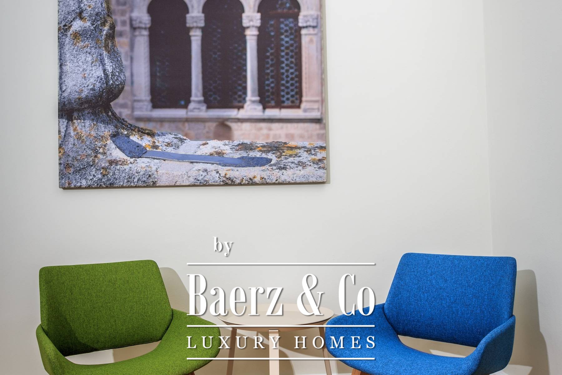 Apartment Trogir is set within a building dating to 1928, located in the heart of the city. The residence encompasses a total of 321 m², with a refined 142.66 m² of interior living space, 12.49 m² of open balcony, and a remarkable roof terrace of 151.42 m². This apartment is composed of three bedrooms, a study, a kitchen, a dining area, a living room, two bathrooms, a guest toilet, a dressing room, and a pantry. Light enters each room with an original rhythm, highlighting the building’s historical quality while shaping moments of privacy and openness.