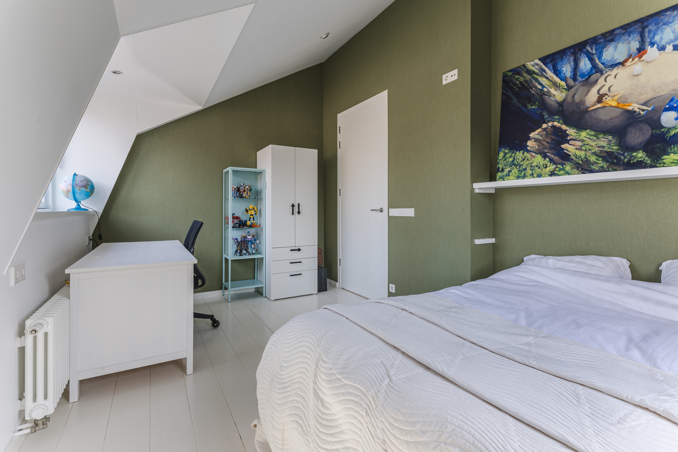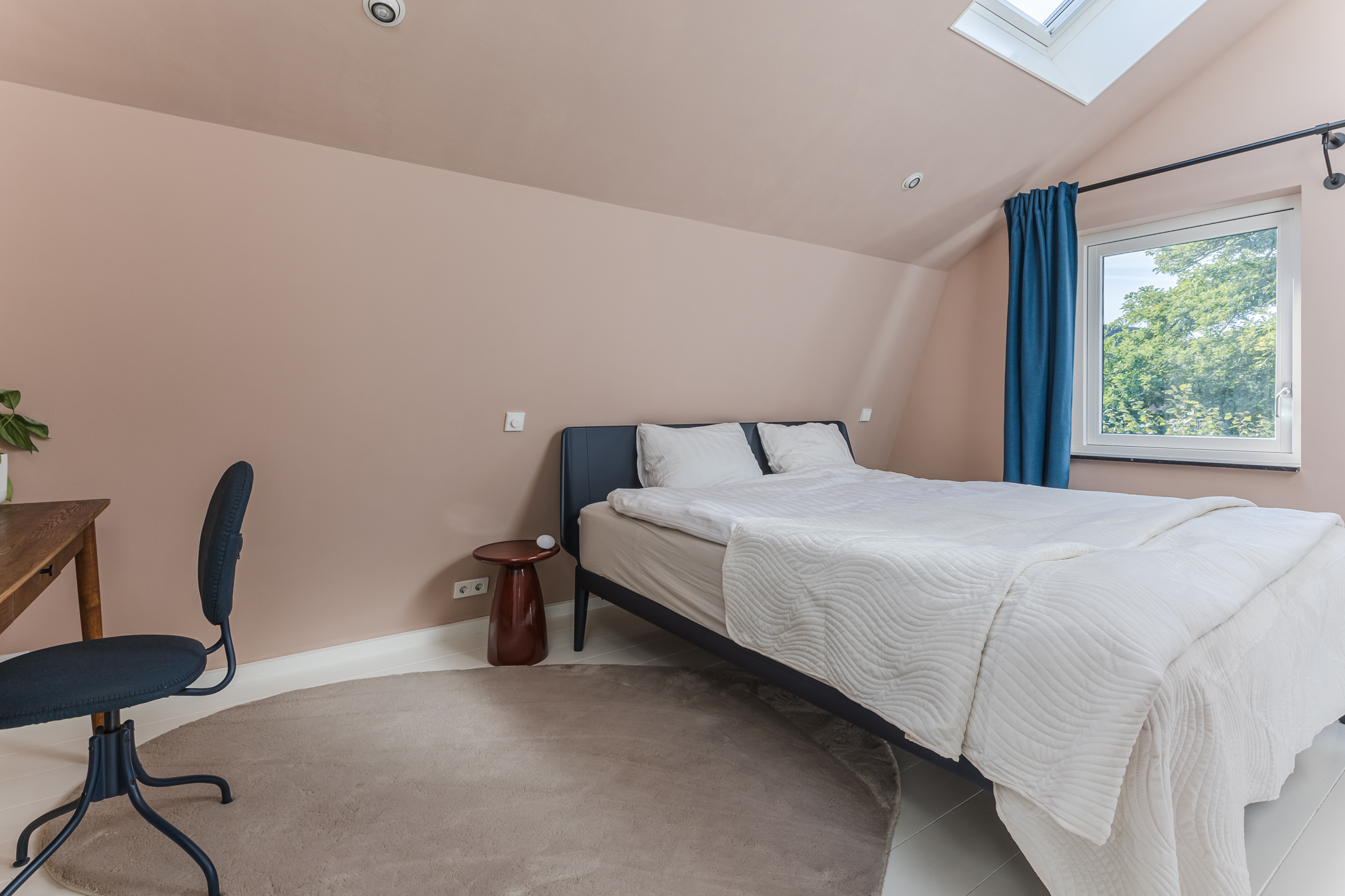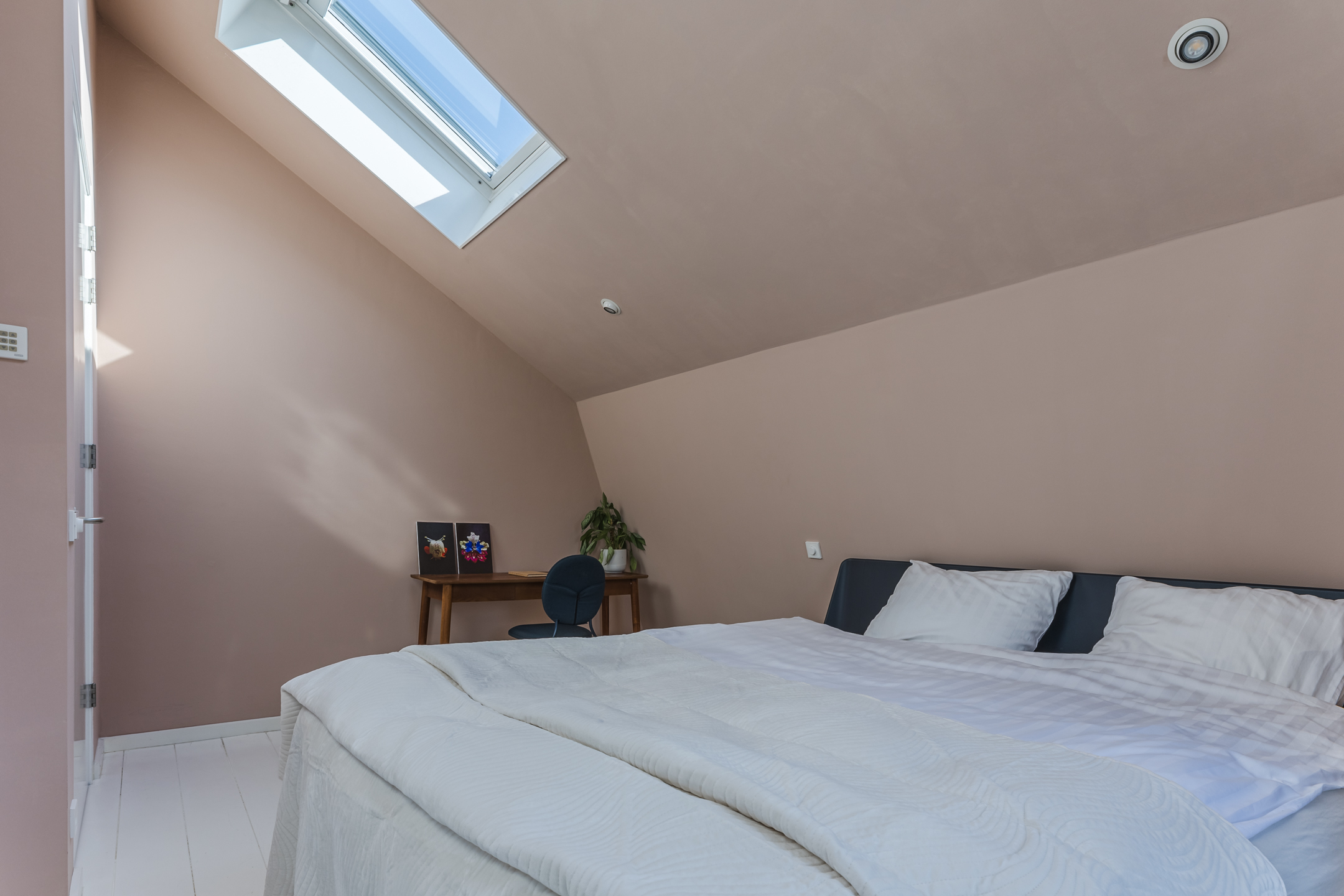 The spacious living area benefits from abundant natural light, underfloor heating, and a gas fireplace. The living room connects openly to the kitchen-diner but can be separated by elegant pivot doors. A practical cellar provides additional storage, and the unique raised room (opkamer) offers access to the first floor.