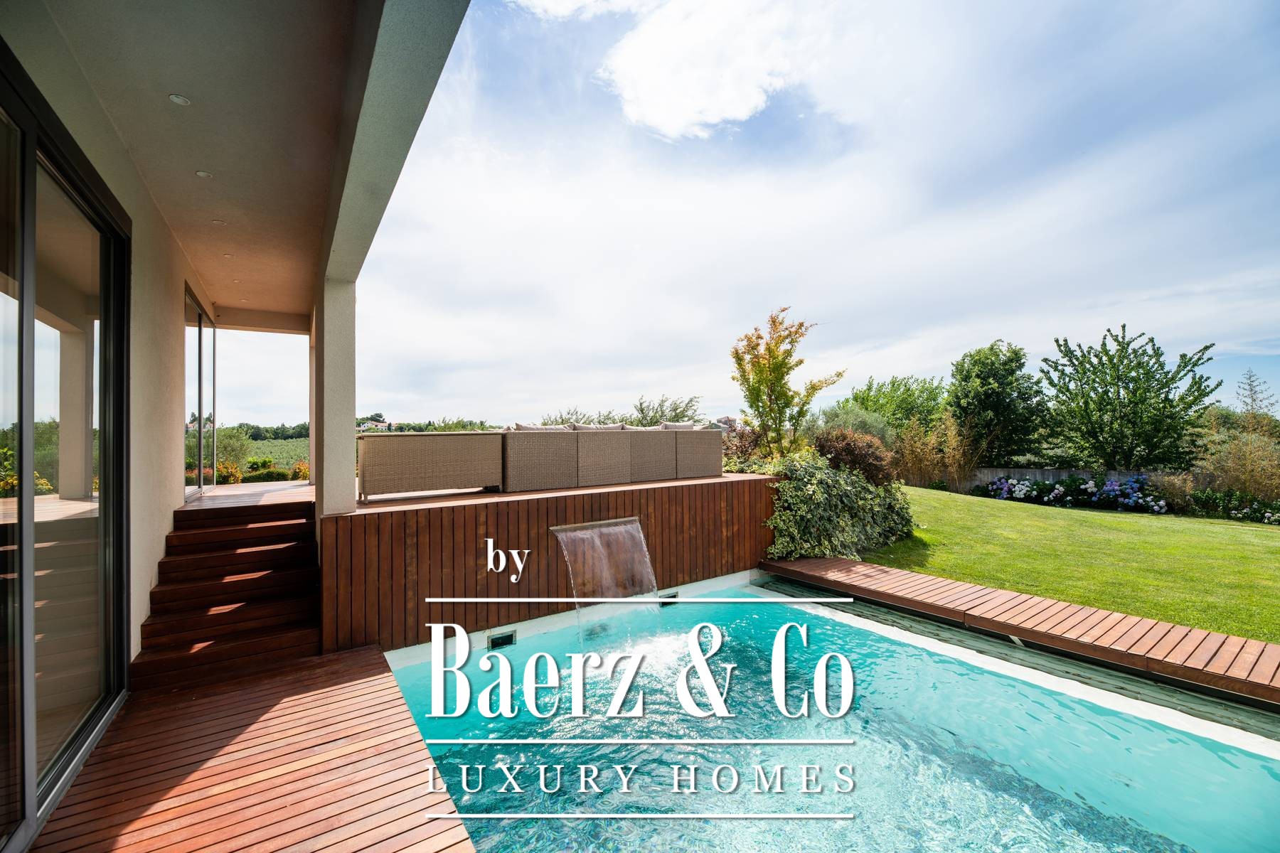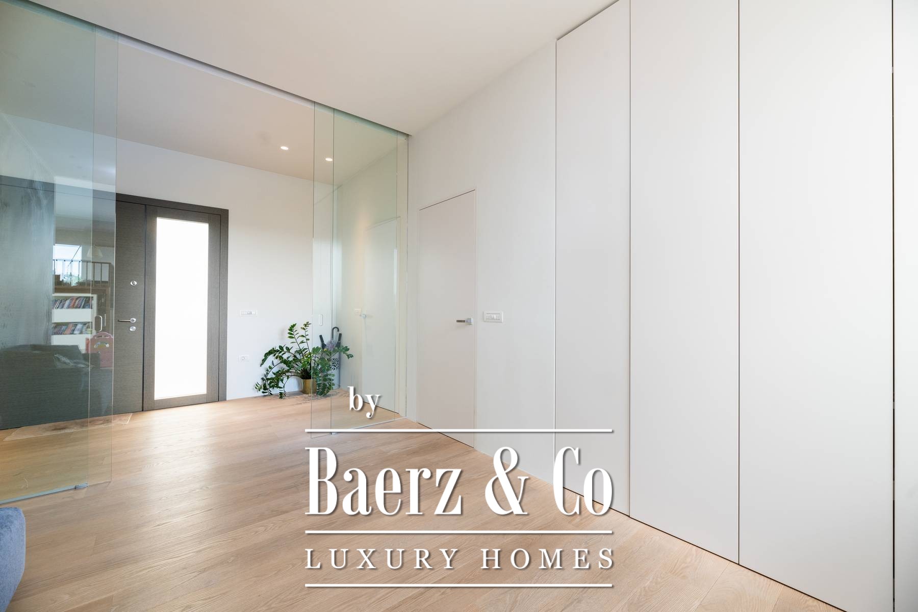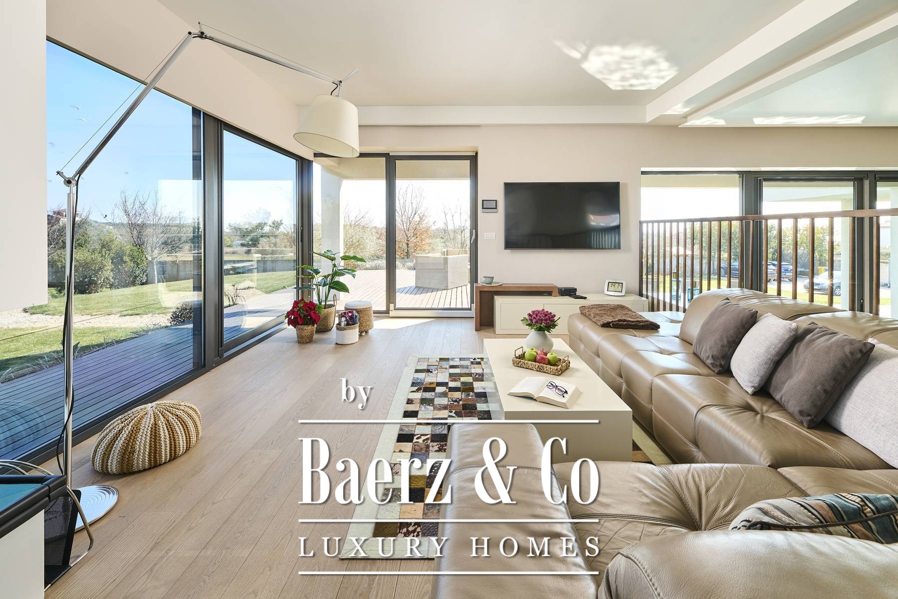 Modern smart house with 4.956 m2 land surrounded by olive groves just 400 meters from the favorite beaches of Umag. The architecture merges elegant design and stone as a traditional building element into an attractive villa with pool that provides the highest standards of modern living.The main entrance and driveway to the building are located on its west side, on the existing street, and the space for a garage with storage and a multimedia hall in the basement of the building.The ground floor consists of an entrance hall on the west side, a guest room with bathroom on the north side of the building and a unique living room, kitchen and dining room which is connected to the south facing terrace facing the sea, and north to the garden and outdoor terrace.In the entrance area, which is accessed west through the windshield, there is a garden on the north side of the house. The guest room is connected to the entrance area via an entrance hall from which one enters the bathroom. In the western part of the building, in addition to the mentioned windshield, there is a toilet to the north, and to the south there is an economic space related to the kitchen. On the west side of the south terrace, connected to the kitchen and the economic part, there is a summer kitchen covered with the volume of the upper floor.A staircase