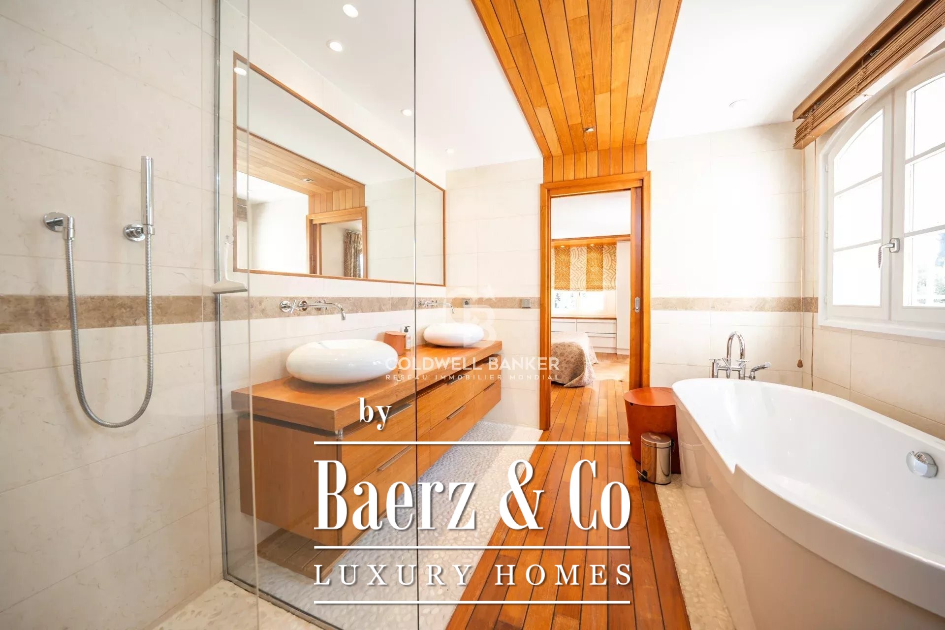 The main villa’s rhythm unfolds through an entrance hall, a generous living room with fireplace opening onto a covered terrace, formal dining area, and a spacious fitted kitchen. There is a scullery, pantry, laundry, and a study providing functional clarity, while six en-suite bedrooms, including a master suite with terrace and sea view, ensure privacy across the upper and garden levels. Further, a garden-level living room with bar and playroom, a private cinema, comprehensive gym, sauna, Jacuzzi, and a wine cellar create a deeply layered experience.