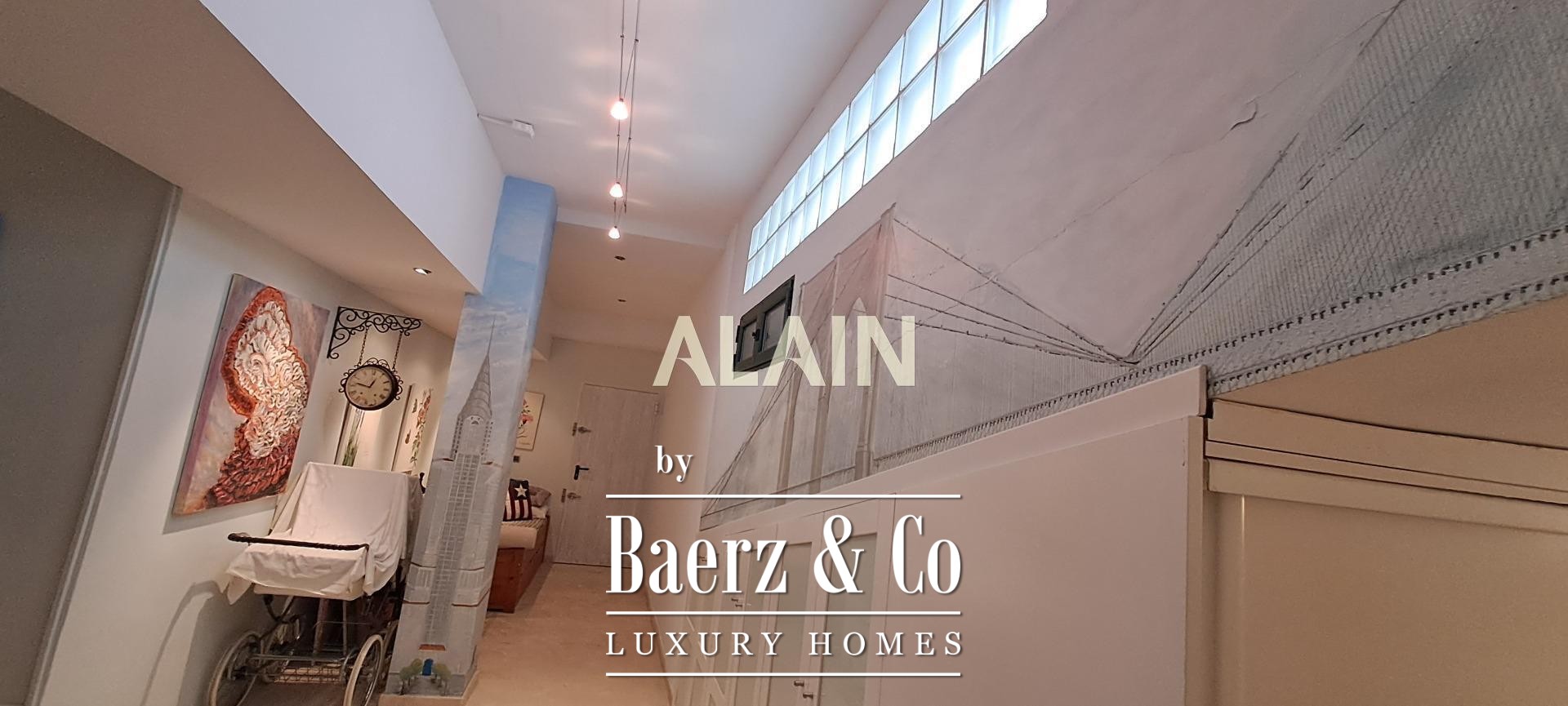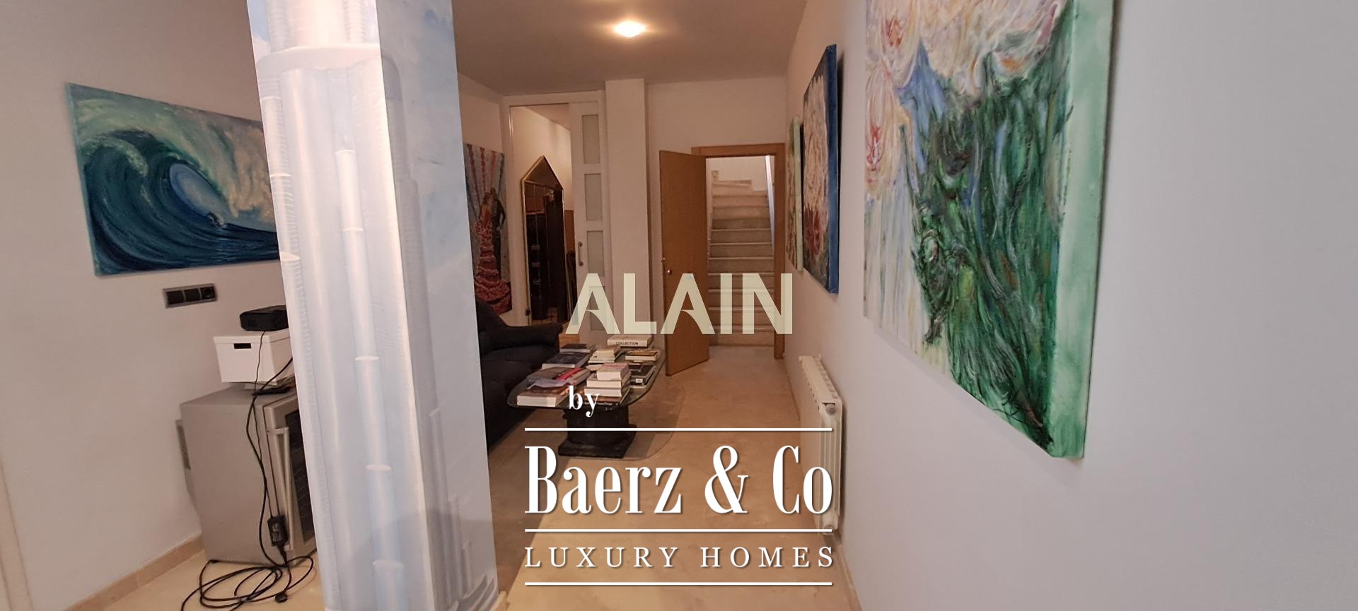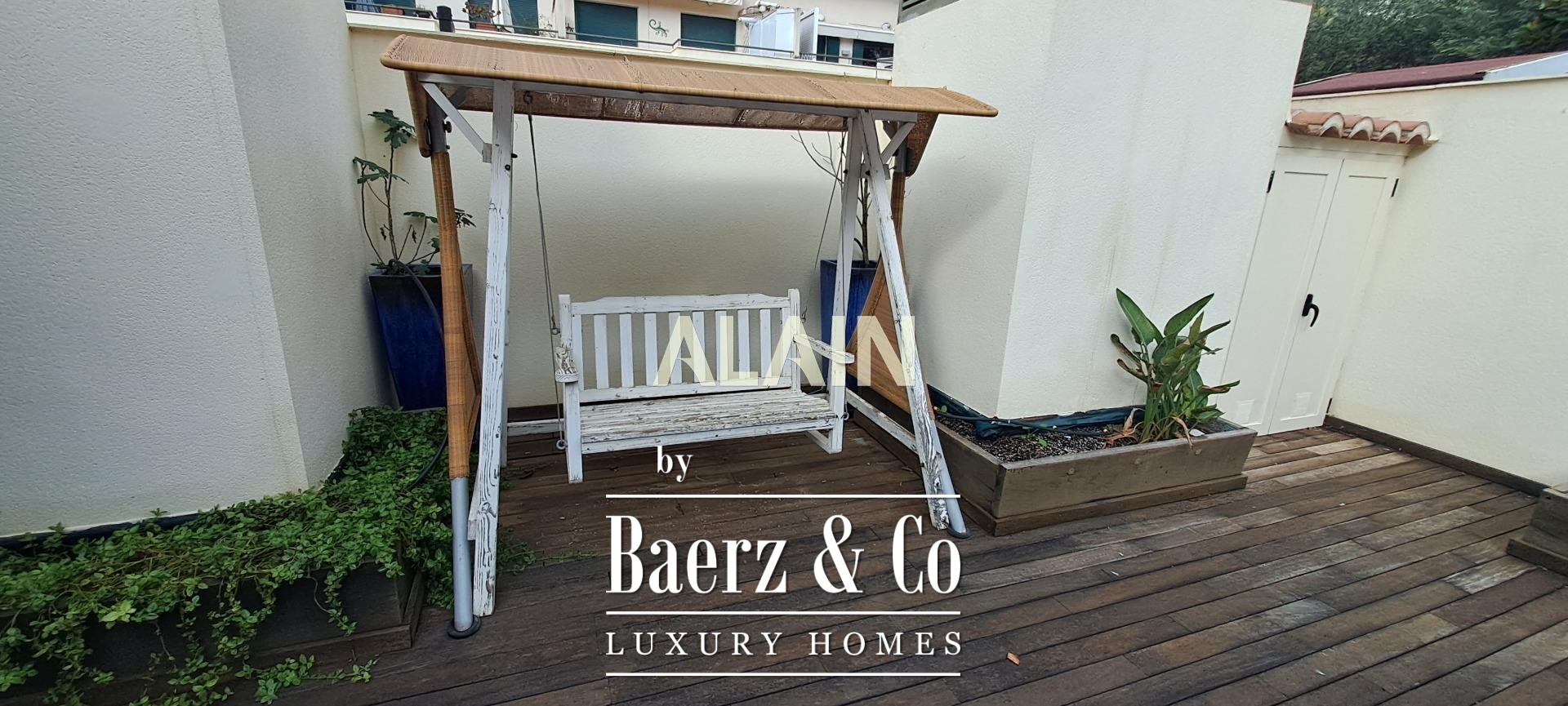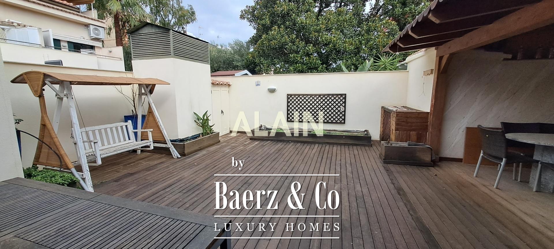 Meticulously renovated, the interiors blend high ceilings, cross ventilation, and contemporary finishes. The private chill-out area and barbecue kitchen invite informal gatherings and quiet evenings alike. Two reserved garage spaces accompany the property, while built-in wardrobes, heating, air-conditioning, and curated furnishings add thoughtful layers of comfort.