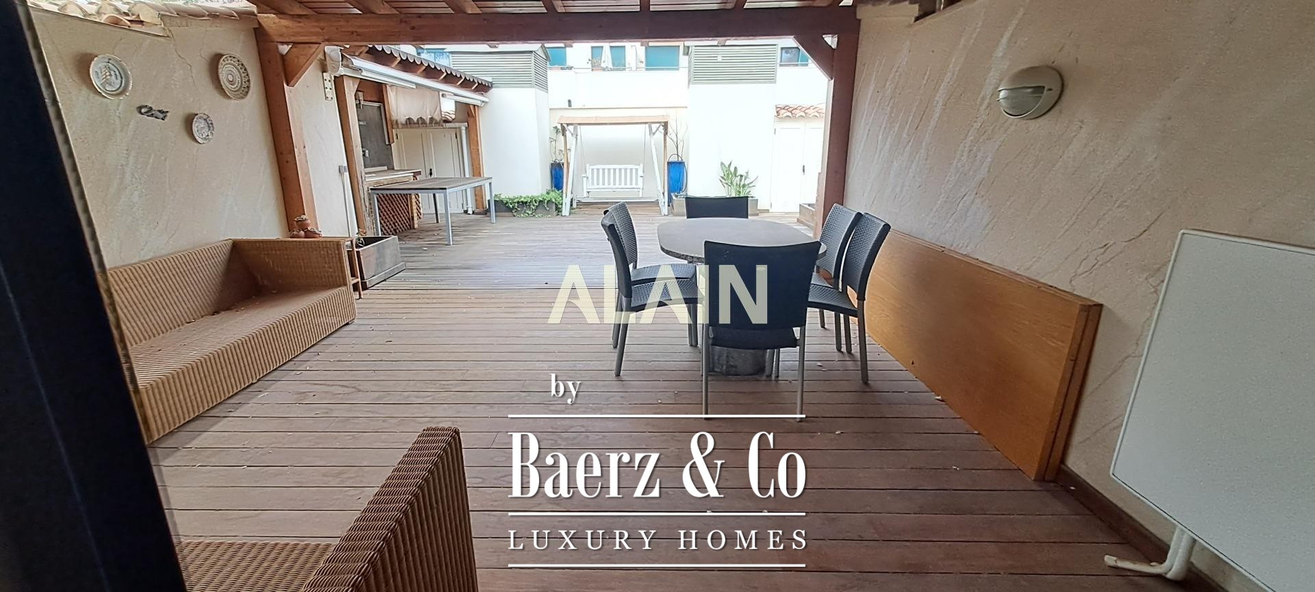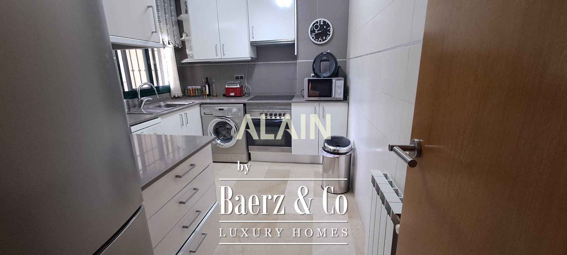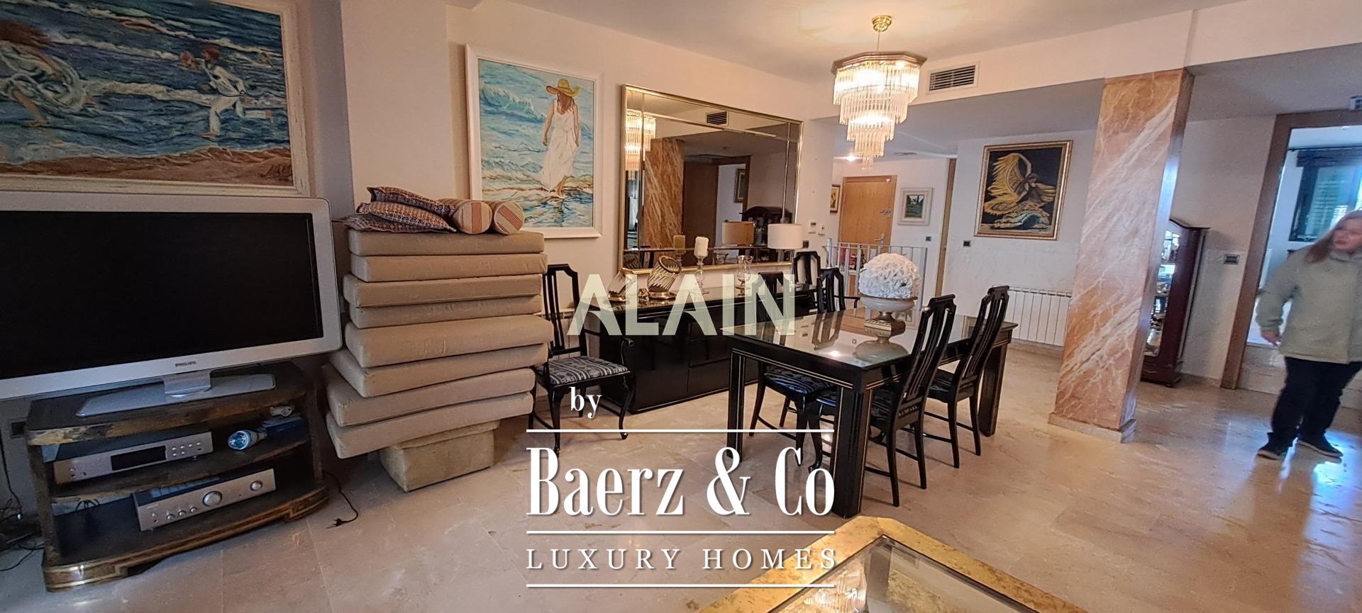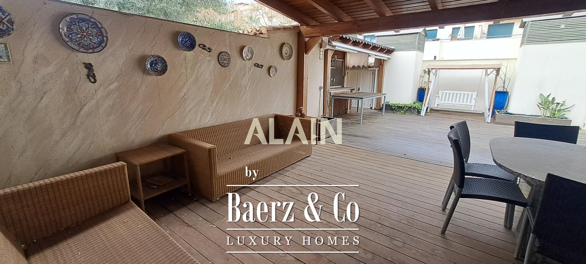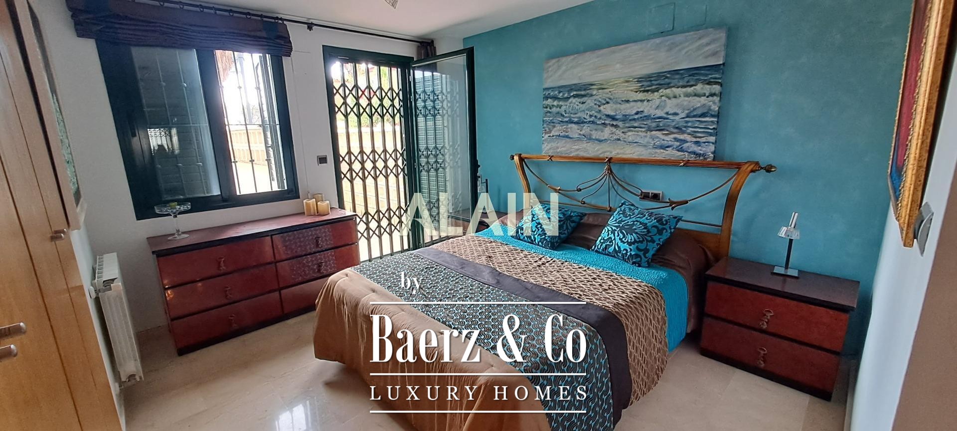 Meticulously renovated, the interiors blend high ceilings, cross ventilation, and contemporary finishes. The private chill-out area and barbecue kitchen invite informal gatherings and quiet evenings alike. Two reserved garage spaces accompany the property, while built-in wardrobes, heating, air-conditioning, and curated furnishings add thoughtful layers of comfort.
