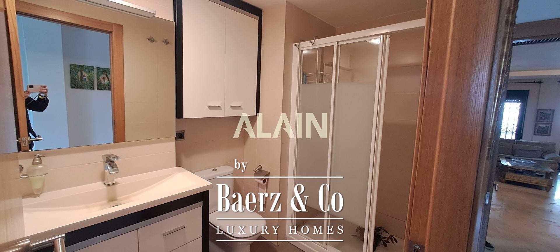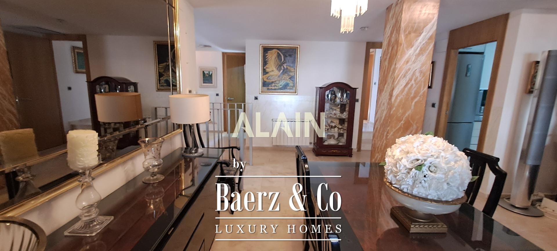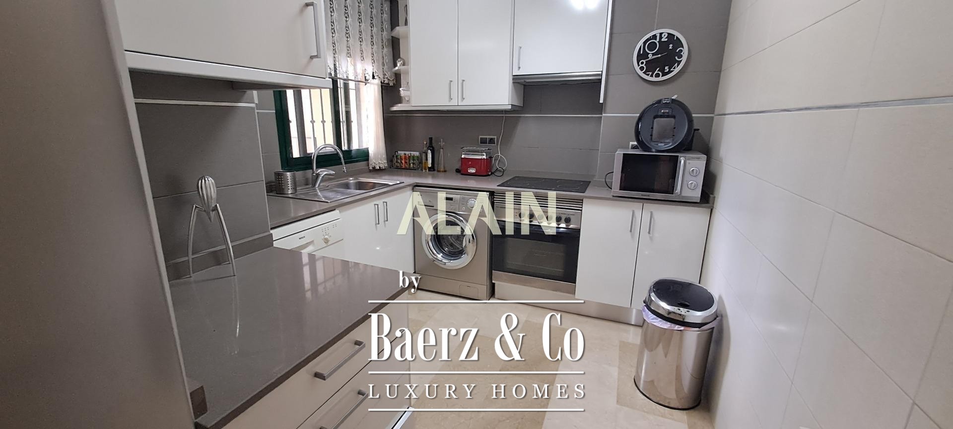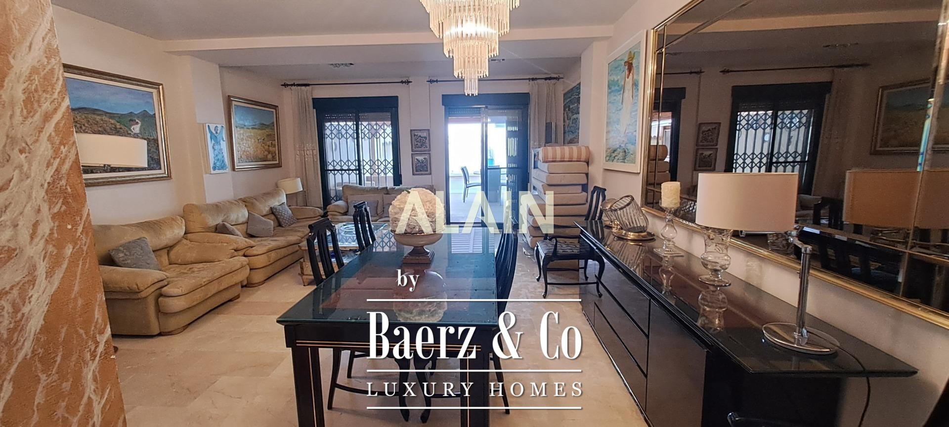 Meticulously renovated, the interiors blend high ceilings, cross ventilation, and contemporary finishes. The private chill-out area and barbecue kitchen invite informal gatherings and quiet evenings alike. Two reserved garage spaces accompany the property, while built-in wardrobes, heating, air-conditioning, and curated furnishings add thoughtful layers of comfort.