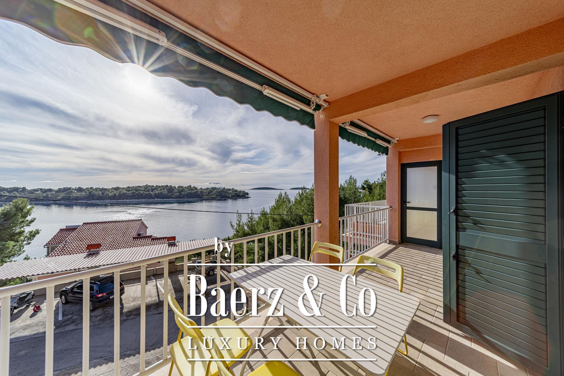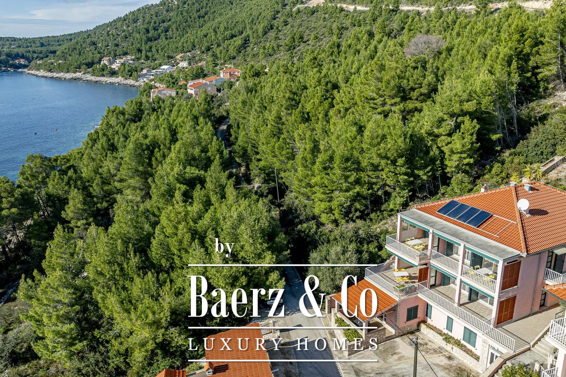 Korčula Island, Vela Luka, house with 5 apartments, 2nd row from the sea in Karbuni BayThe property is located in Karbuni Bay, along the paved road 30 m from the sea. The house has an outdoor uncovered parking lot with 4 parking spaces. Access to the sea is ensured by a spacious promenade that leads you to the arranged pier. The orientation is south and the terraces offer an unobstructed view of the open sea, the islets along the coast and the island of Lastovo. The house is three-storey and divided into 5 apartments that are fully furnished and ready to use. Each apartment is equipped with heating/cooling air conditioning. The house is connected to the water supply and electricity network.In the basement there is an apartment and rooms used as storage, 4 parking spaces and behind the house there is a small yard with a built-in barbecue. The apartment has an area of 58 m2 with an adjoining terrace of 11 m2. It consists of a kitchen with