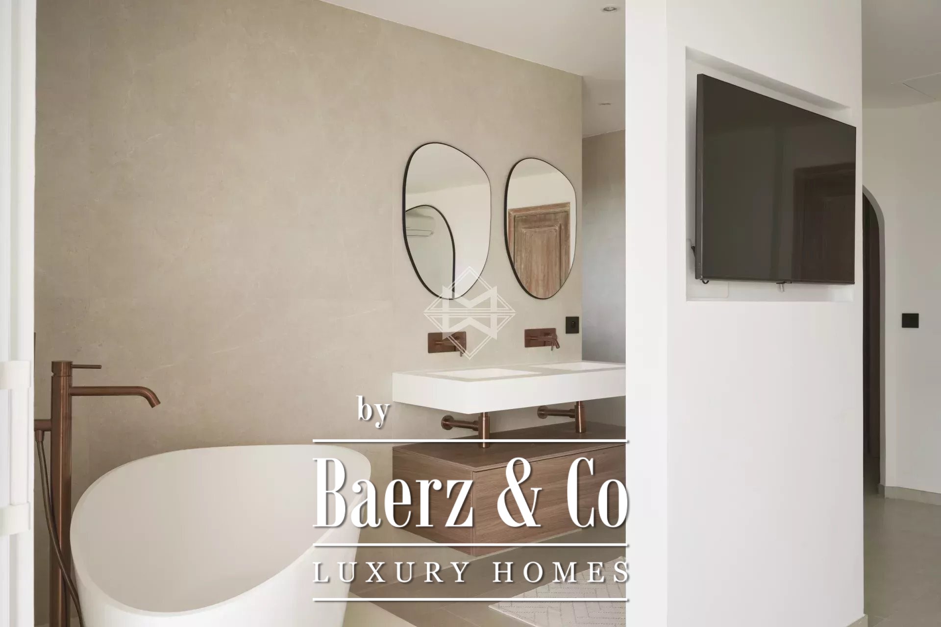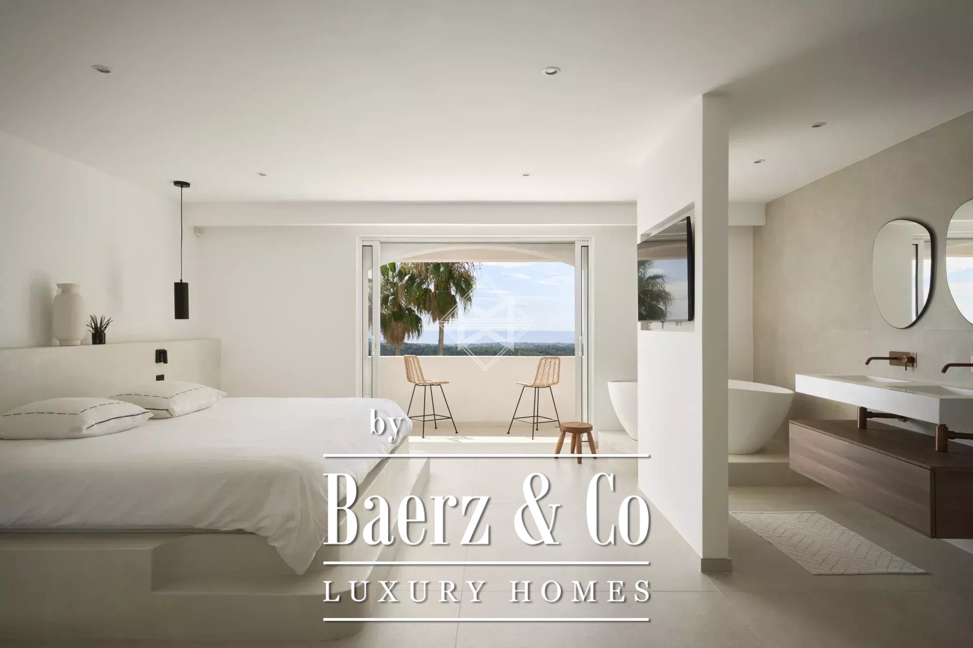 Located in one of the most sought-after areas of Vence, in a commanding position, L'Hacienda stands on a preserved hillside and offers an exceptional panorama: the Mediterranean stretching as far as the eye can see, from Cap Ferrat to Cap d'Antibes, with the majestic Baou de Saint-Jeannet as a backdrop. Completely renovated in 2025 with elegance and refinement, the 260 m² villa, bathed in light, is spread over three levels. On the ground floor, a beautiful entrance hall leads to a large living room opening onto a terrace facing the sea, extended by a dining room and a spacious kitchen. Two bedrooms, a bathroom, a cloakroom, a laundry room, and a guest
