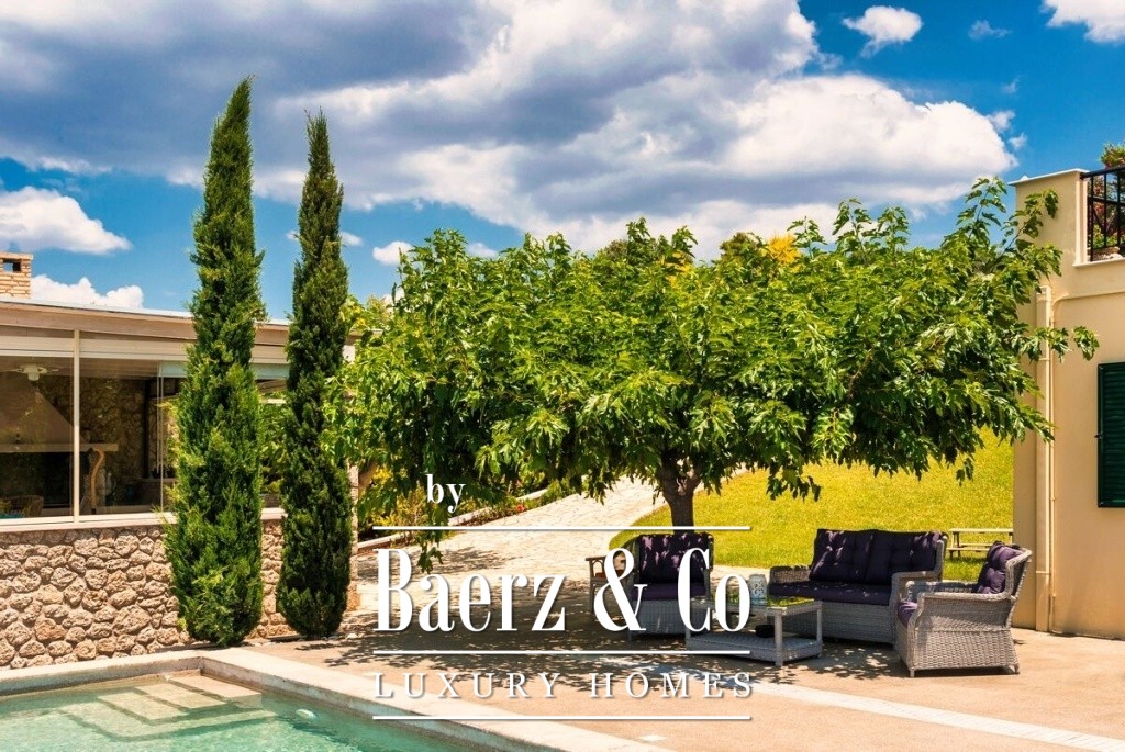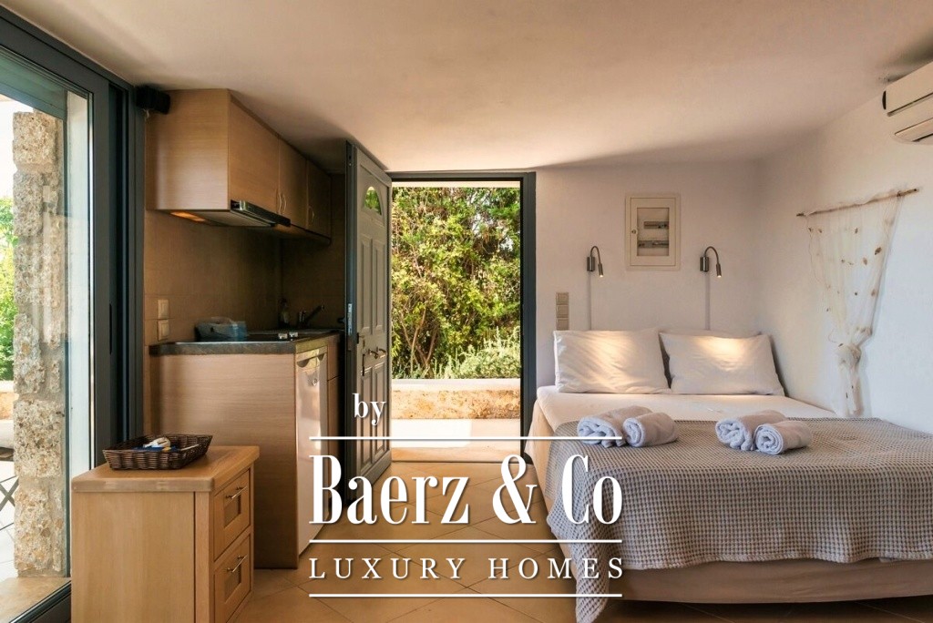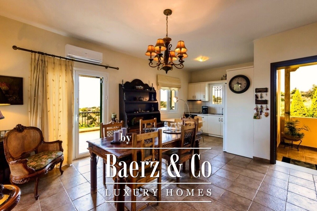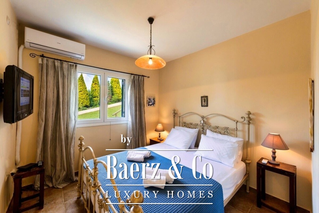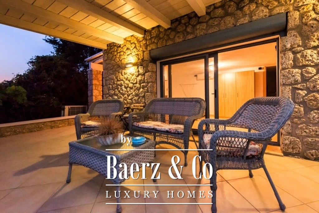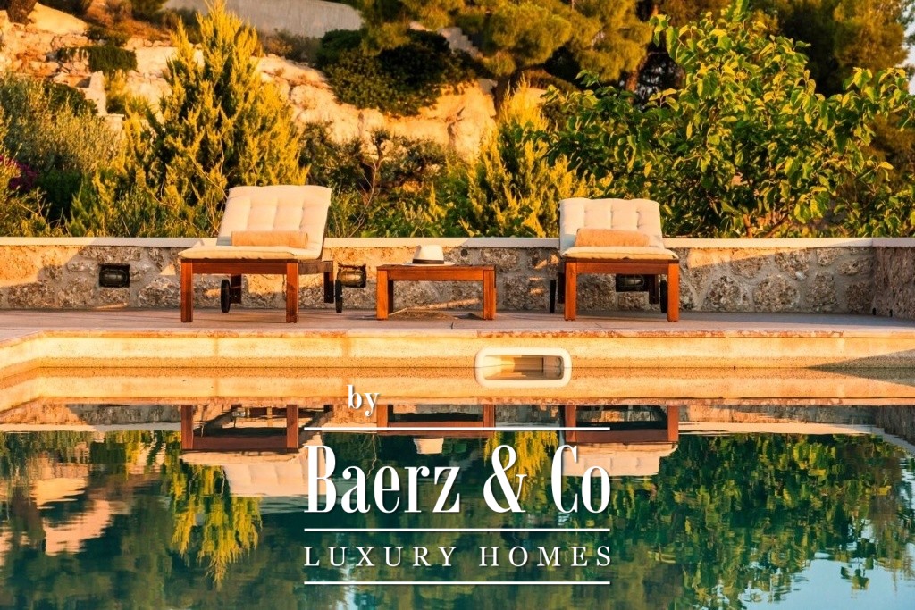 asphalt road. The plot is fenced and has a remote controlled gate. It is also beautifully landscaped with ornamental trees and plants and is leveled with stone terraces. For better and easier passage, paved paths and stairs have been created in the outdoor area which, in combination with tree planting, offer beautiful social spaces. Notable points of reference are the variable depth swimming pool 44m² with the unobstructed view and the beautifully designed surrounding areas, from where we can enjoy the uniquely beautiful sunset, as well as the fully functional, equipped and covered barbecue that has air conditioning and a view towards the sea and the pool. The distance from the largest and pine-covered beach of the area, Ververonda, is approximately 1km (800 m in a straight line). Along it we find umbrellas, a cafe-bar, a restaurant, but for the most part it is unexploited, thus offering multiple options. As an example, we mention that the residence is located 3 km from the center of Portoheli and the port, 7 km from the port of Costa that connects us with the picturesque island of Spetses, 7 km from Kranidi with its shops, banks and the health center and 200 km from Athens International Airport.
