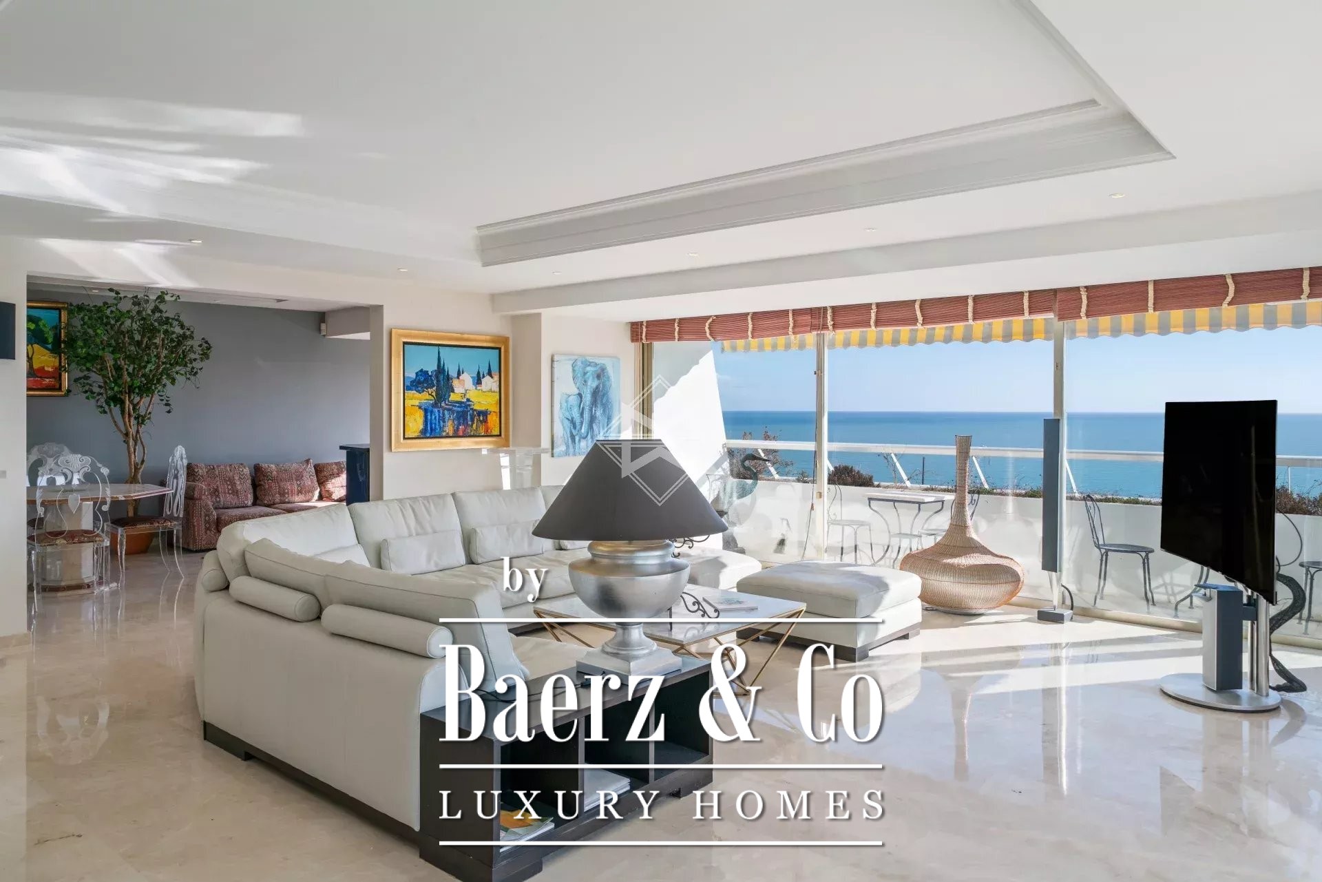 Apartment Villeneuve-Loubet offers 204 m² of modern living high above the coastline, set within a classified heritage residence. This residence, built in the 20th century and comprised of 686 lots, is positioned for breathtaking panoramic views over the Baie des Anges and the Marina port. The first impression is marked by a private entrance and a welcoming hall that unveils a luminous living space. A vast lounge and dining area flow seamlessly onto a 120 m² terrace and a south-facing balcony, framing an ever-changing seascape.
