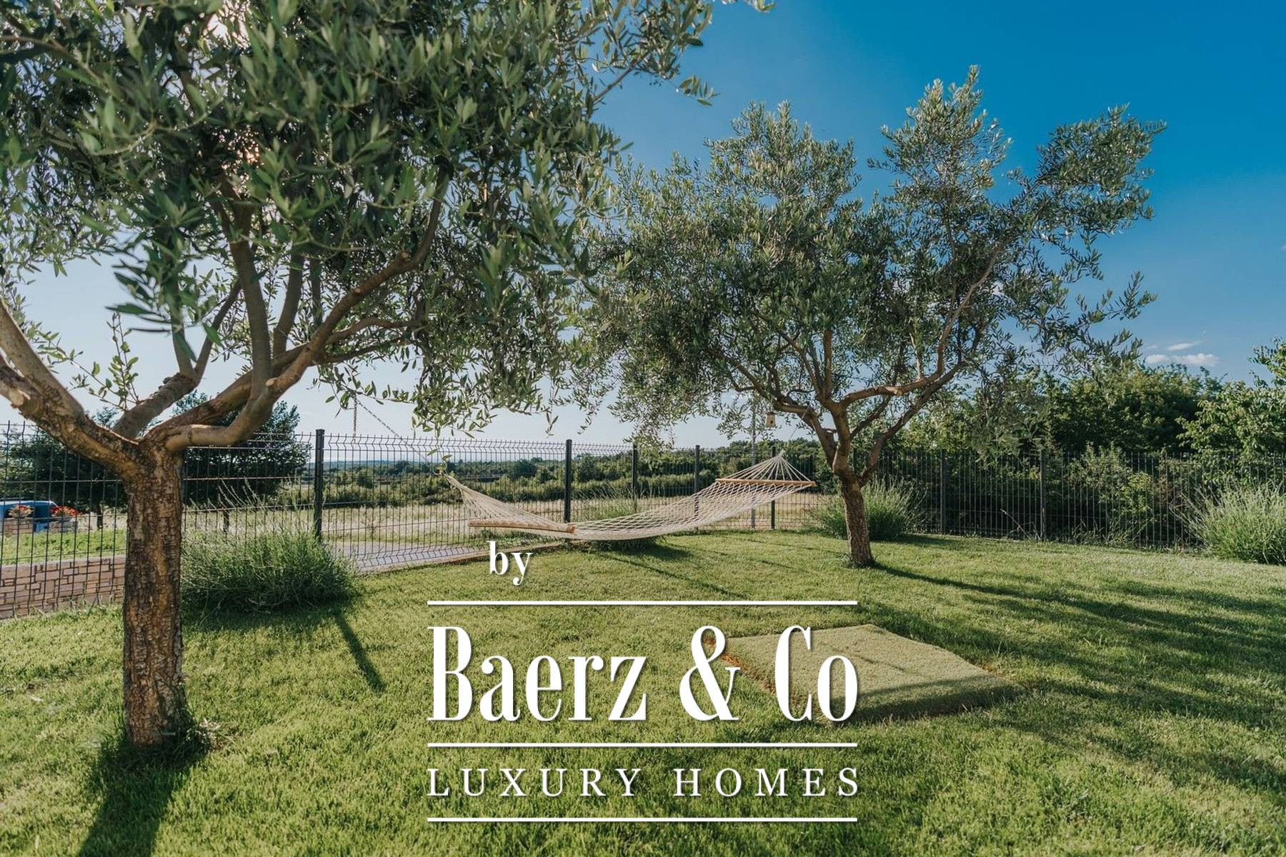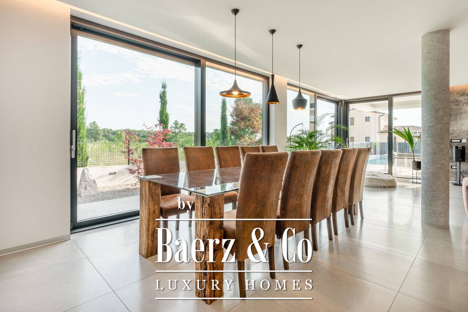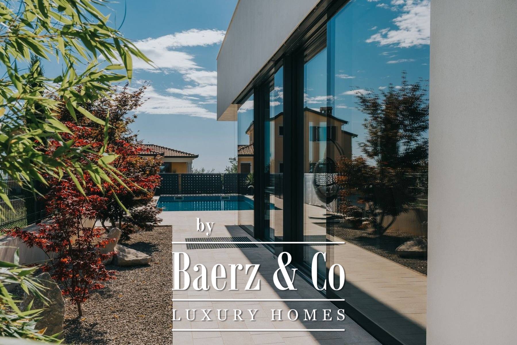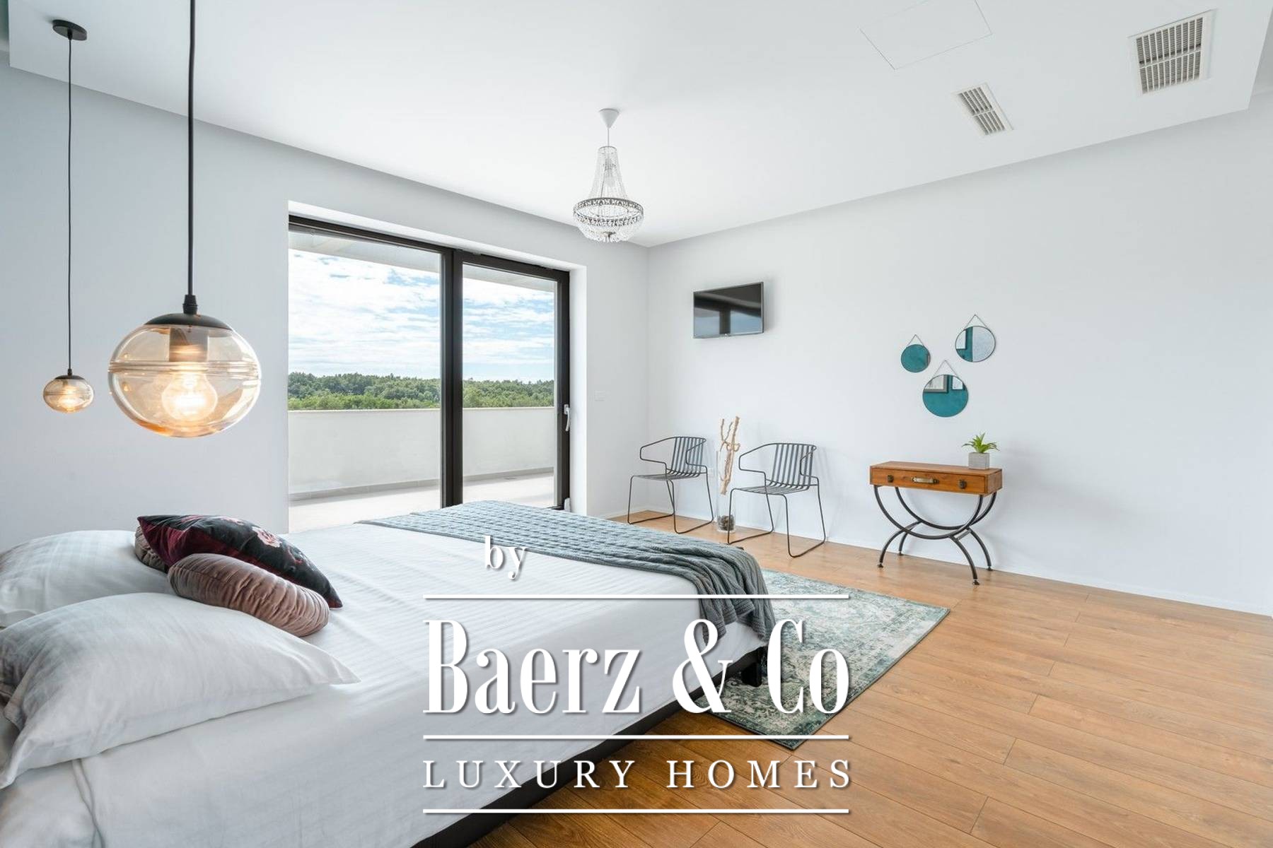 In Višnjan, near Poreč, a beautiful modern villa with a private pool is for sale.A masterpiece of modern architecture, it is equipped for a relaxing holiday in Istria. Situated on a small hill, in front of the villa there is a magnificent view of the sea and the lovely landscape.The spacious and open layout is accompanied by large windows and French doors, which let in plenty of natural light throughout the day.It consists of 4 bedrooms that are all decorated in their own style, from charmingly romantic to urban