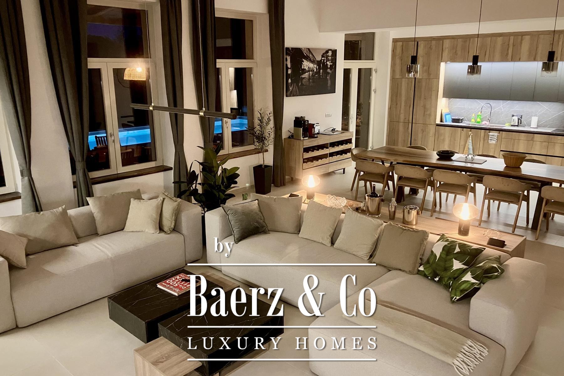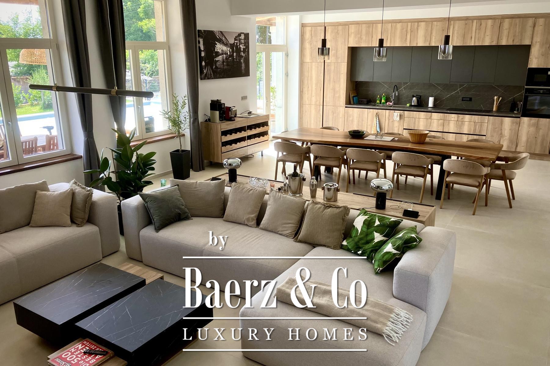 The renovated villa is a large one-story house of 454m2, where you will enjoy a wonderful open space kitchen, dining room and living room with access