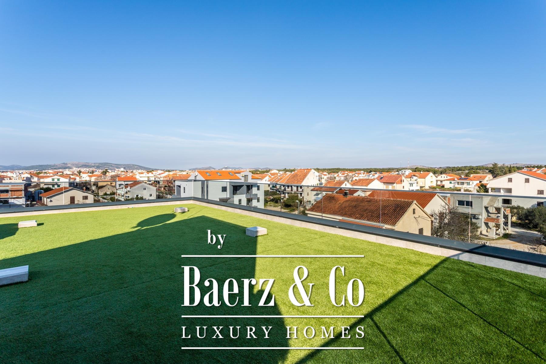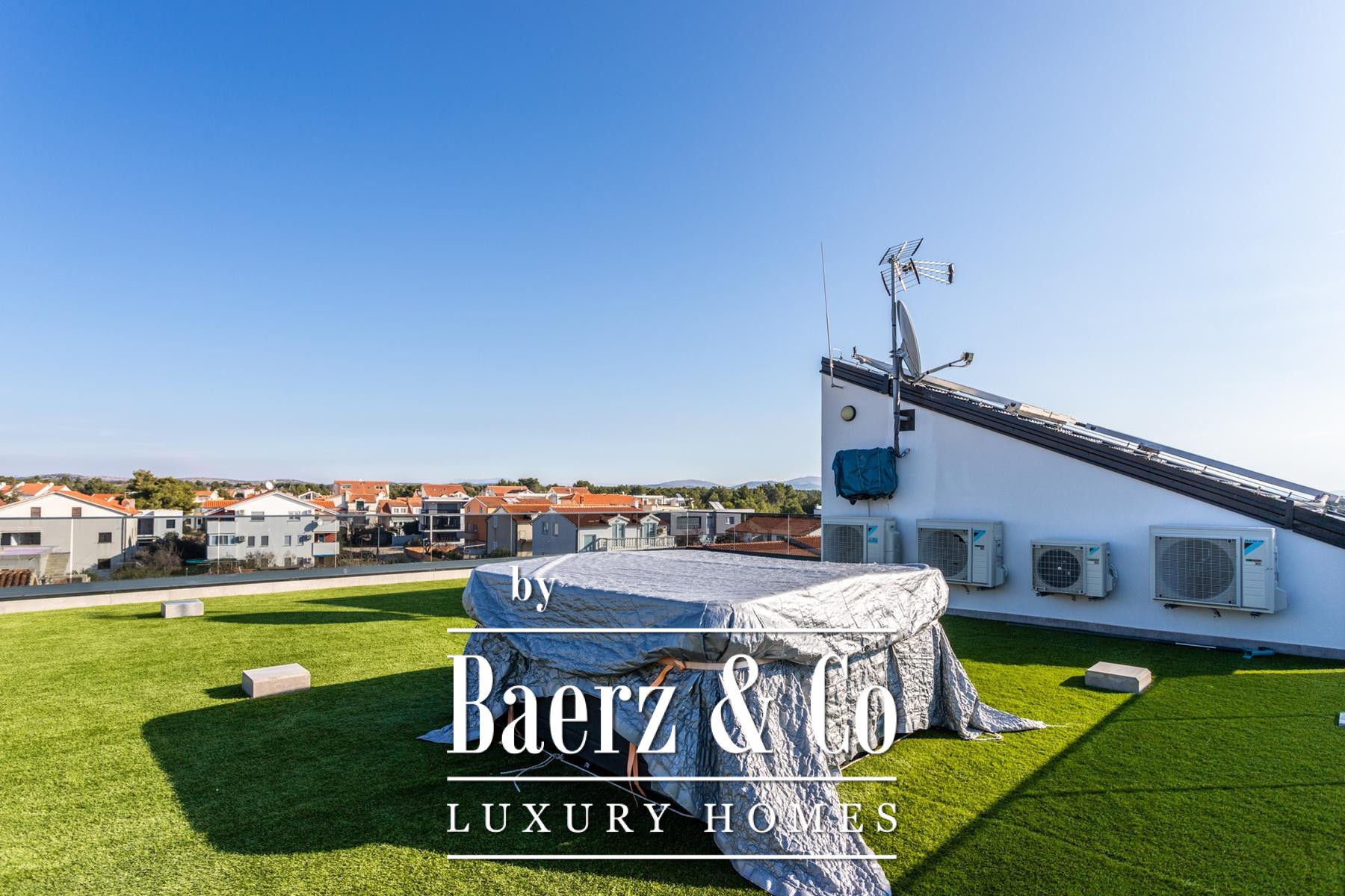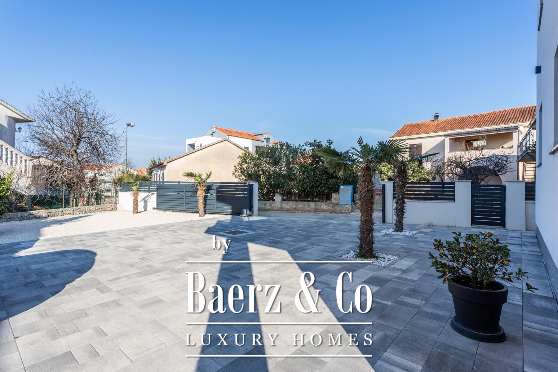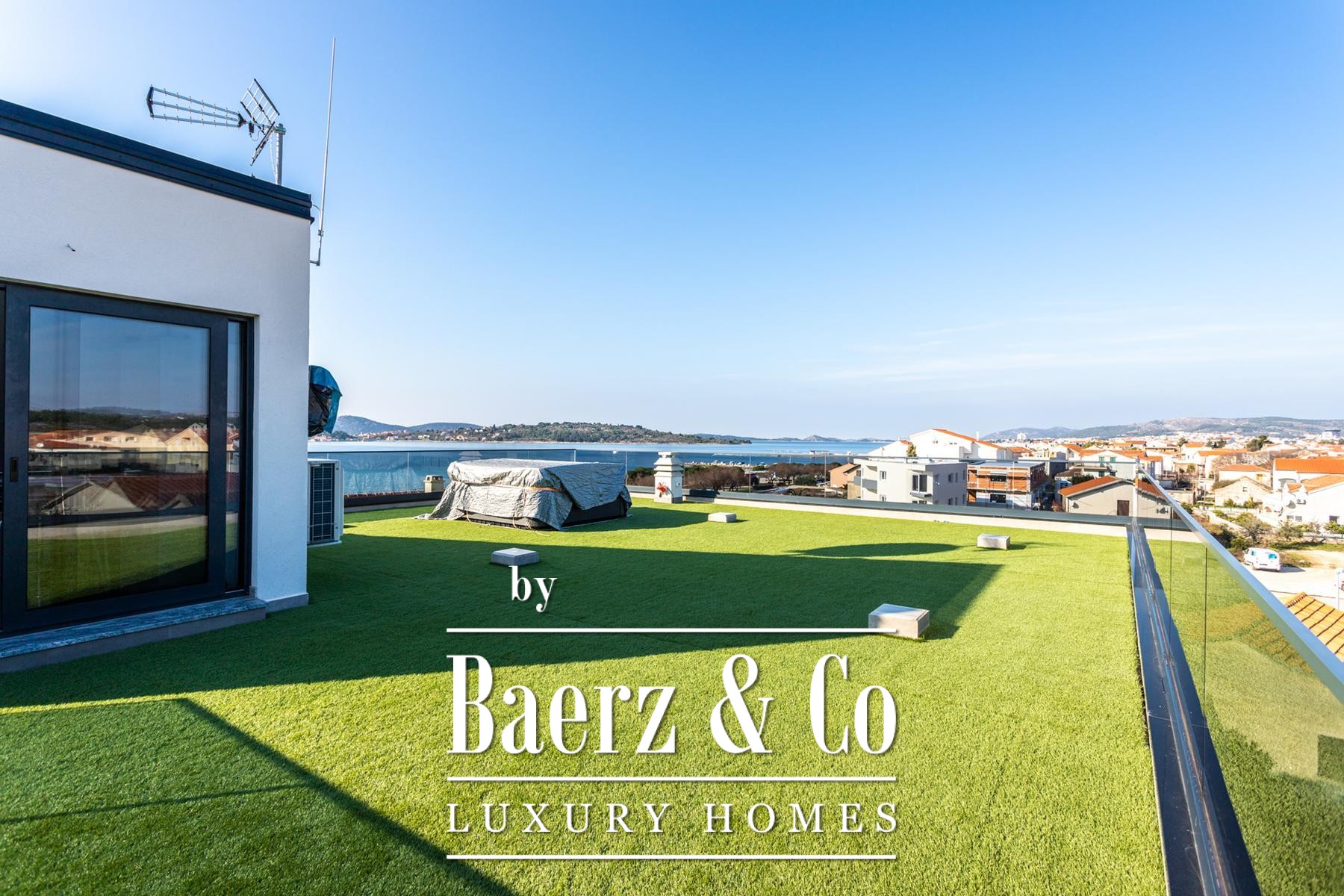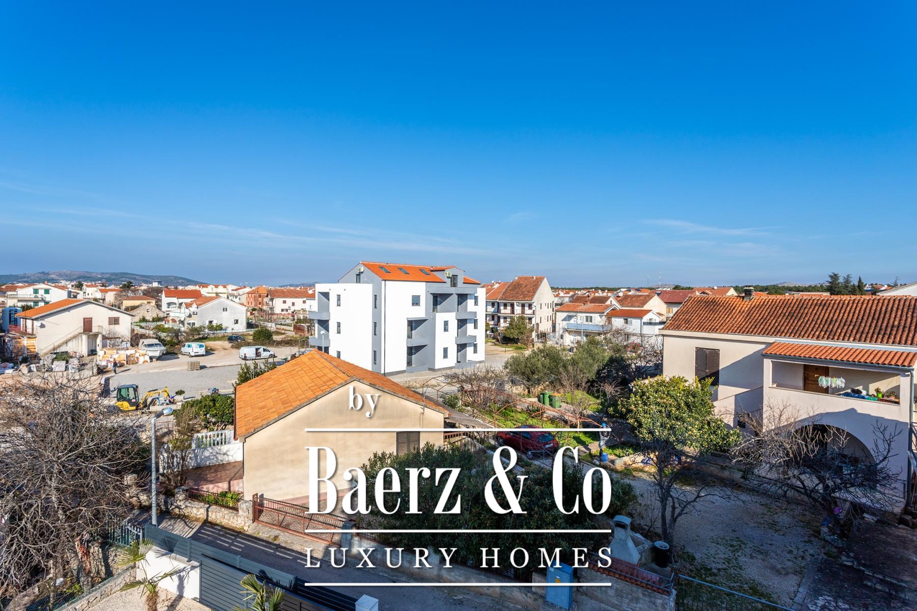 Outdoor living is elevated by generous terraces, including a private rooftop terrace of 110 m² exclusive to the second-floor apartment, extending the living area and drawing in natural light. On the grounds, there are multiple dedicated parking spaces, providing convenience within the private yard. This property offers a flexible layout, nestled in the sought-after setting of Vodice, Croatia.