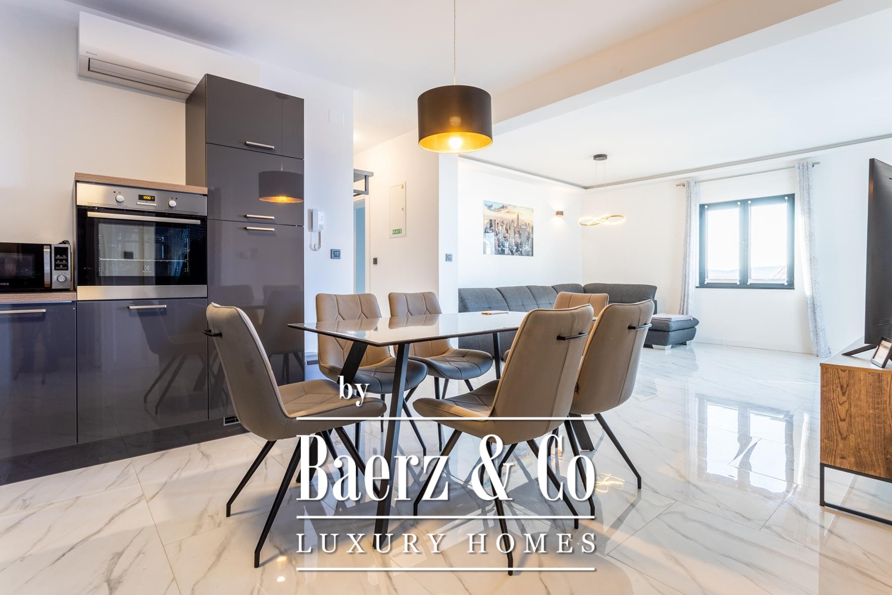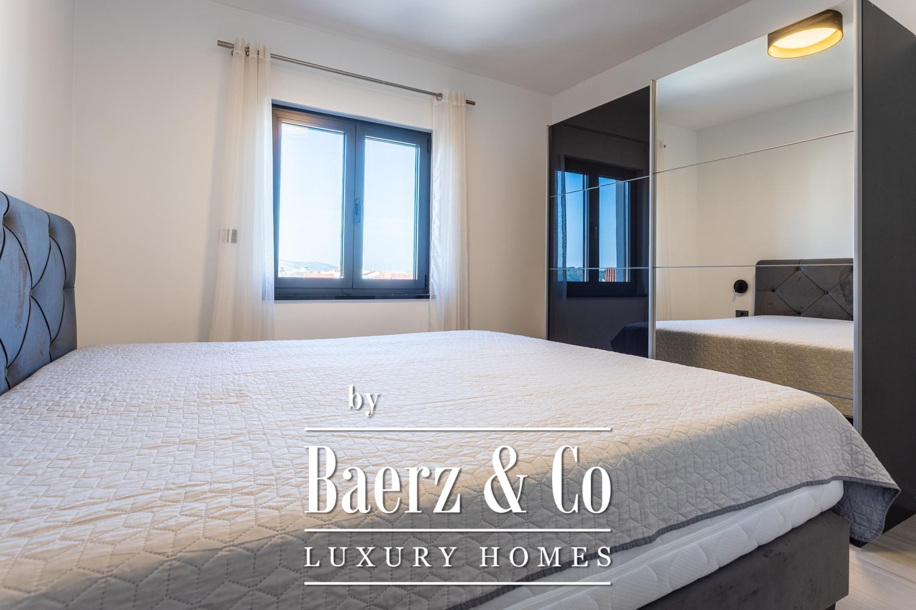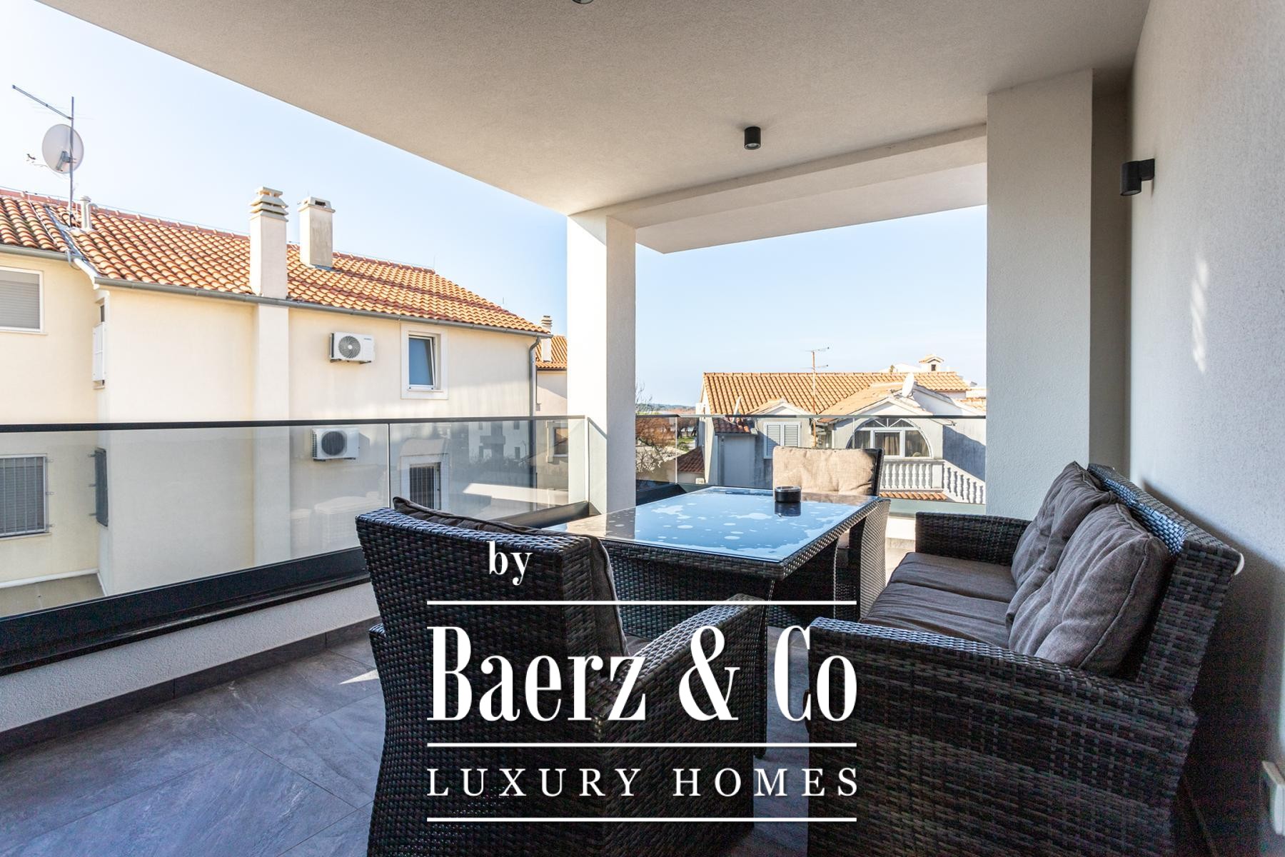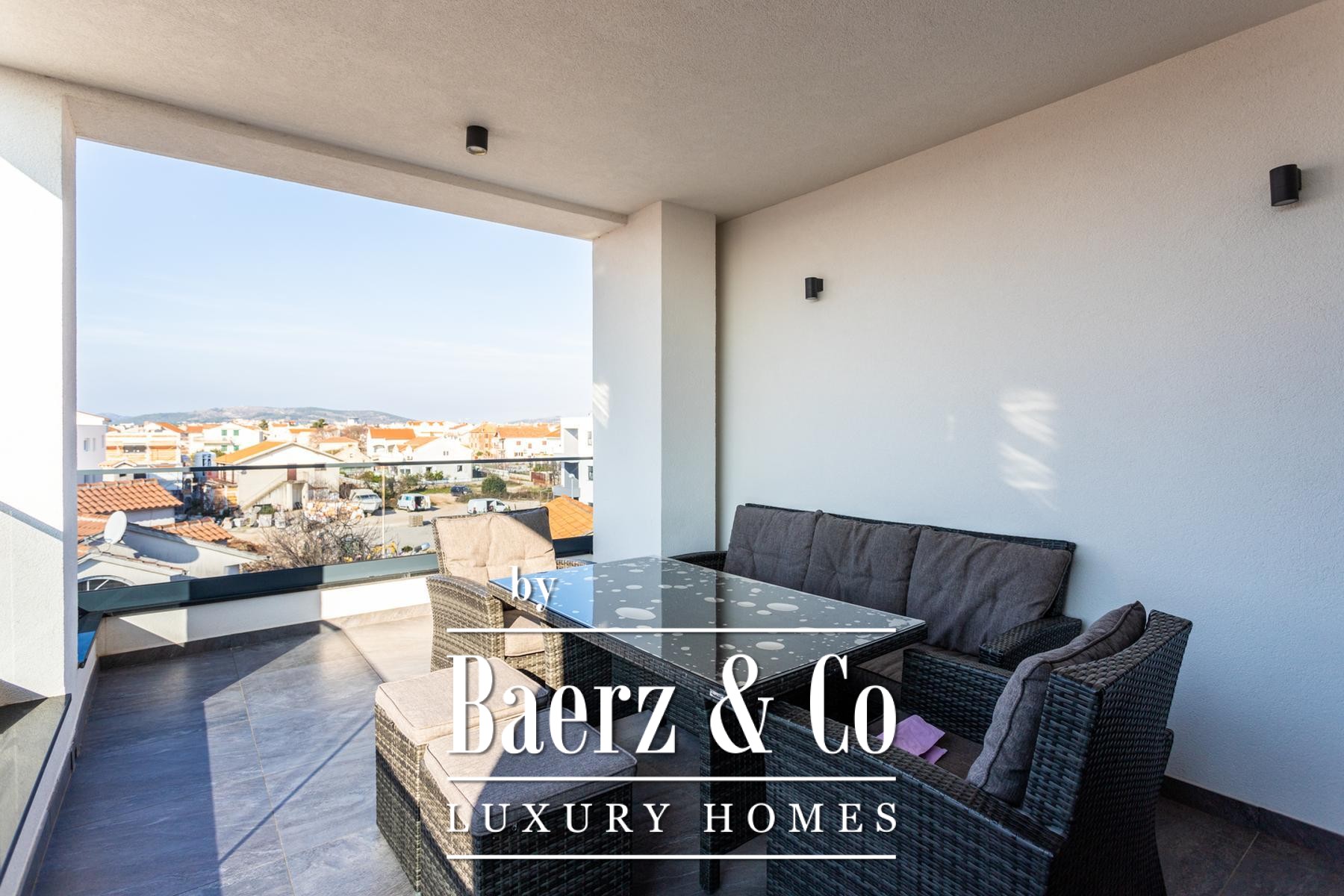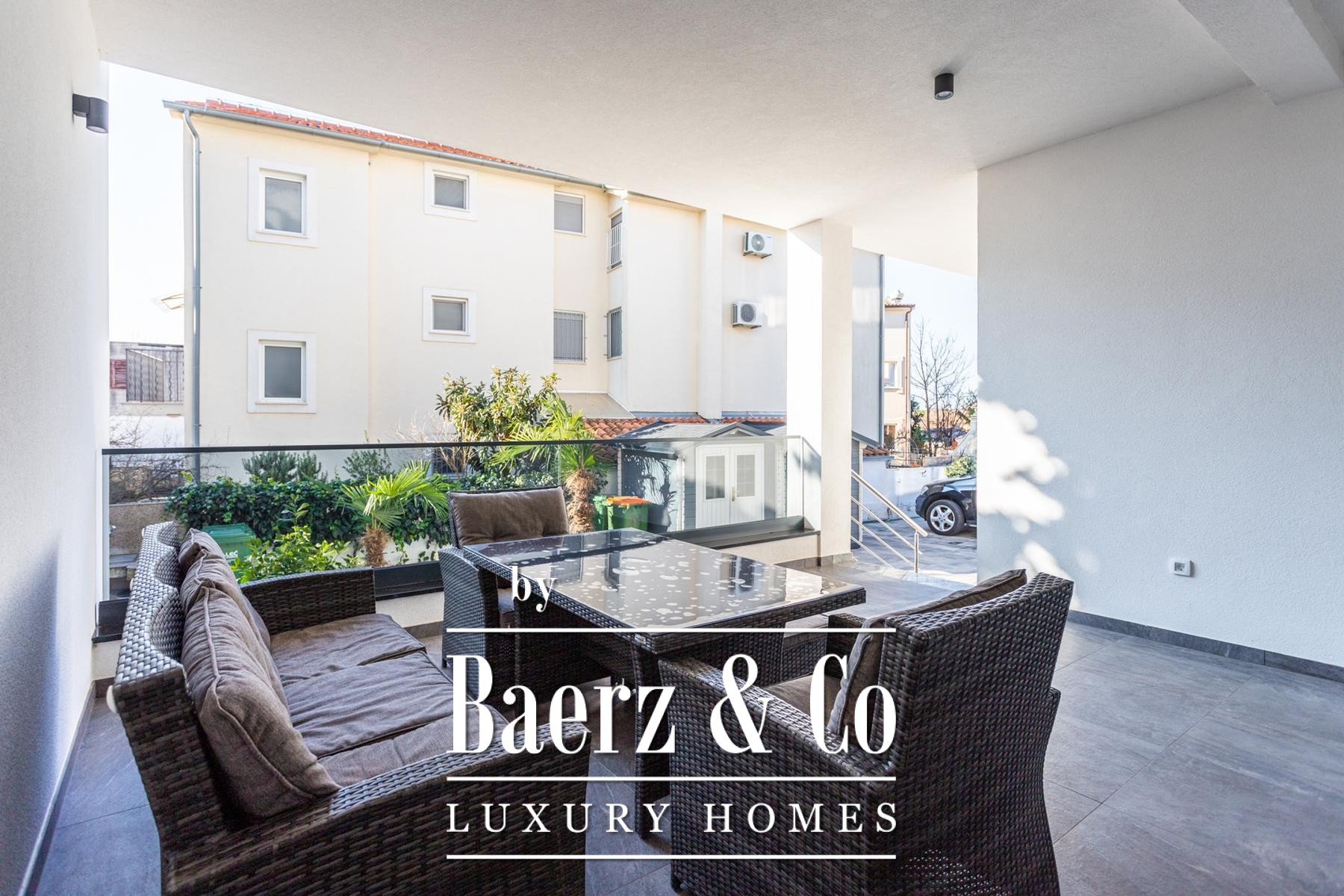 Outdoor living is elevated by generous terraces, including a private rooftop terrace of 110 m² exclusive to the second-floor apartment, extending the living area and drawing in natural light. On the grounds, there are multiple dedicated parking spaces, providing convenience within the private yard. This property offers a flexible layout, nestled in the sought-after setting of Vodice, Croatia.