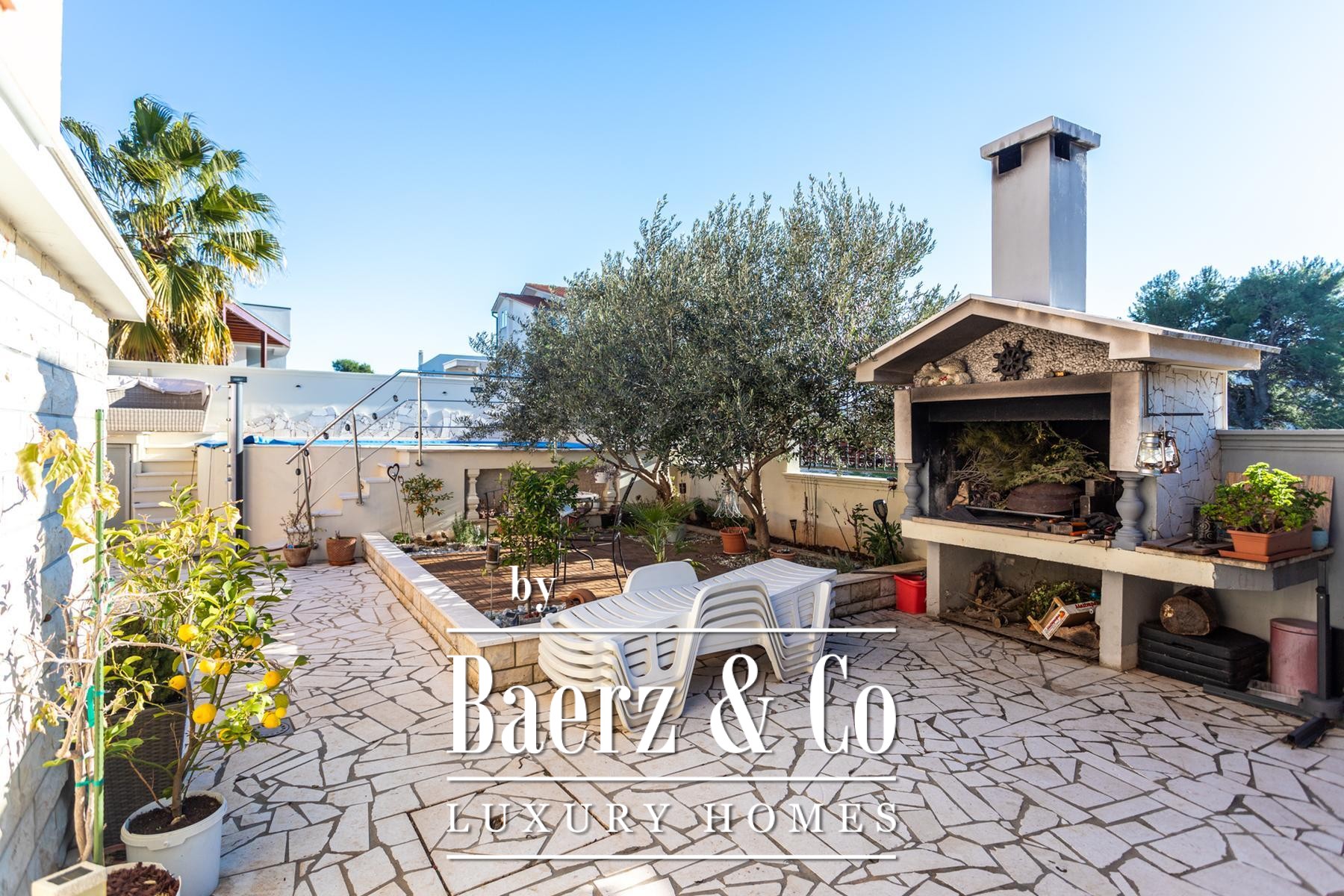Townhouse Vodice presents 391 m² of internal space, thoughtfully arranged for multi-generational living or refined hospitality. The property sits on a 590 m² plot, encompassing a swimming pool, terrace, and outdoor barbecue. Nine bedrooms and nine bathrooms are distributed across four levels, allowing each floor its own pace and privacy.
