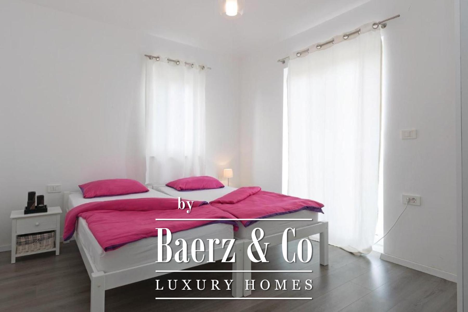 The ground-floor apartment, at 218 m², centers around an open living, dining, and kitchen area, accompanied by four bedrooms. One features its own bath and walk-in closet, while thoughtful amenities include a guest toilet and additional bathrooms for comfort. On the first floor, two more apartments—one 104 m² and the other 86 m²—each have open layouts, two bedrooms, and private balconies. The larger of the upstairs apartments offers a 70 m² terrace with sweeping sea views and access to an upper observation deck, perfect for taking in the Adriatic horizon.