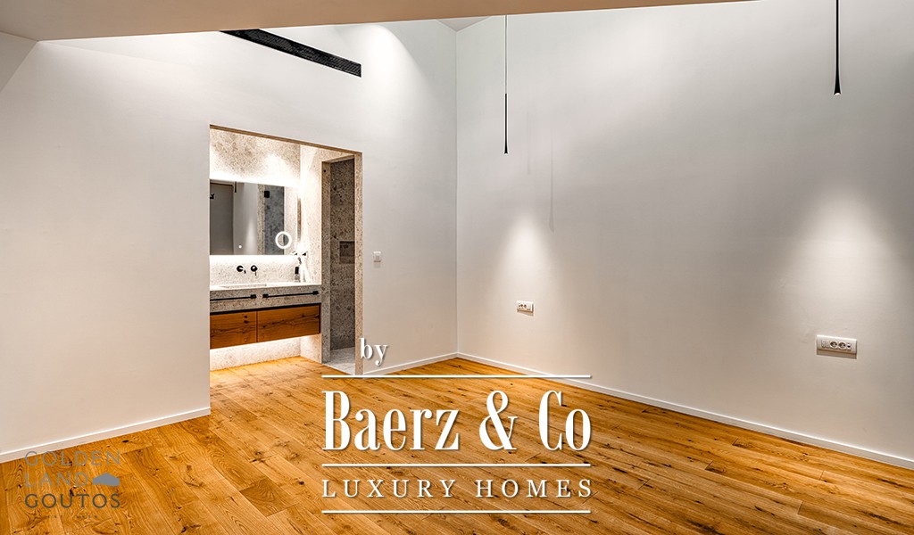 The ground floor is a masterpiece of design, offering a spacious dining area where memorable gatherings can take place. The modern kitchen is a chef's dream, while a comfortable bedroom and an office space provide versatility for living and working. A dedicated laundry room adds to the convenience. The exterior spaces on this level are a true oasis, featuring a large swimming pool, a BBQ area for delightful outdoor meals, a lush garden, and a charming outdoor seating area to enjoy the Mediterranean climate.