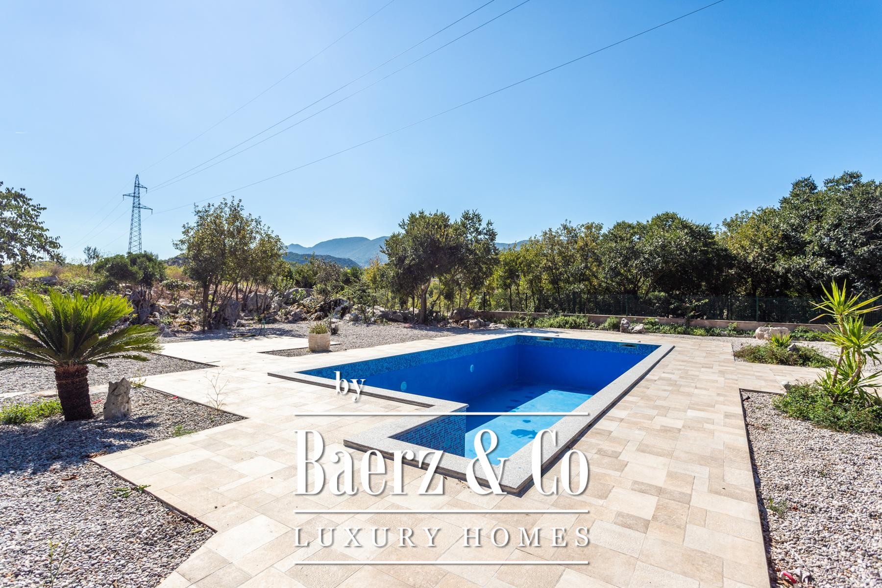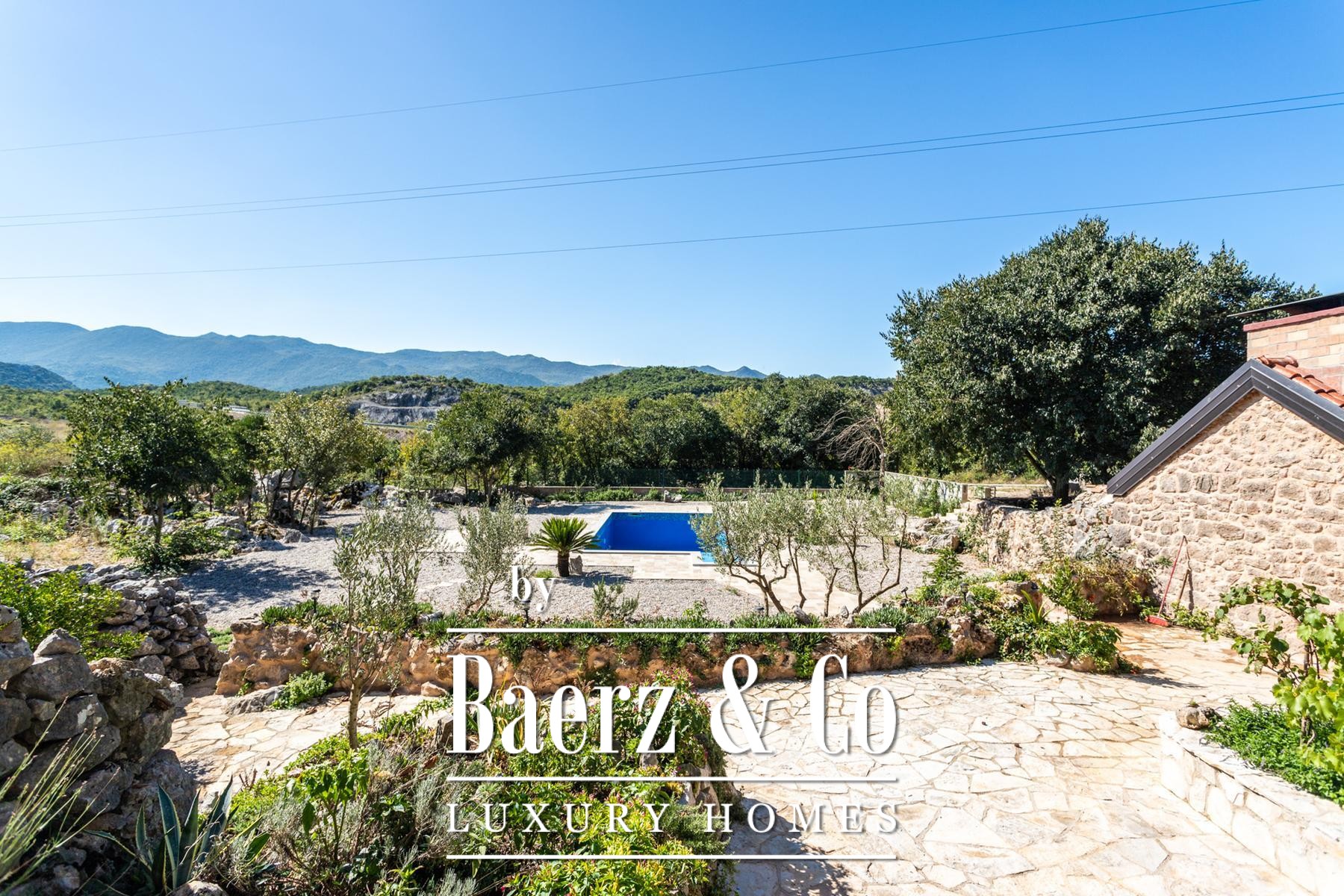 sunbathing area made of natural pebbles. The entire pool area is discreetly enclosed by stone walls and lush natural greenery, ensuring complete privacy.The estate also offers numerous additional amenities for complete enjoyment. There is a modern bocce court, a spacious garden with olive trees, and a dedicated space for animals. Three dilapidated houses offer exceptional potential for further renovation and expansion. For gourmet experiences, there is a furnished tavern, a small wine cellar, and a professionally equipped kitchen. This exceptional property is an ideal opportunity for multiple families or one seeking a spacious home with opportunities for relaxation, entertainment, and creating unforgettable memories in the heart of Dalmatia.
