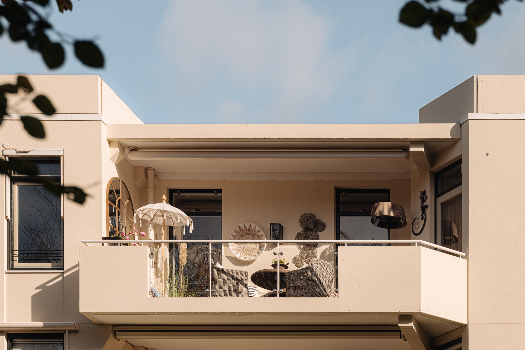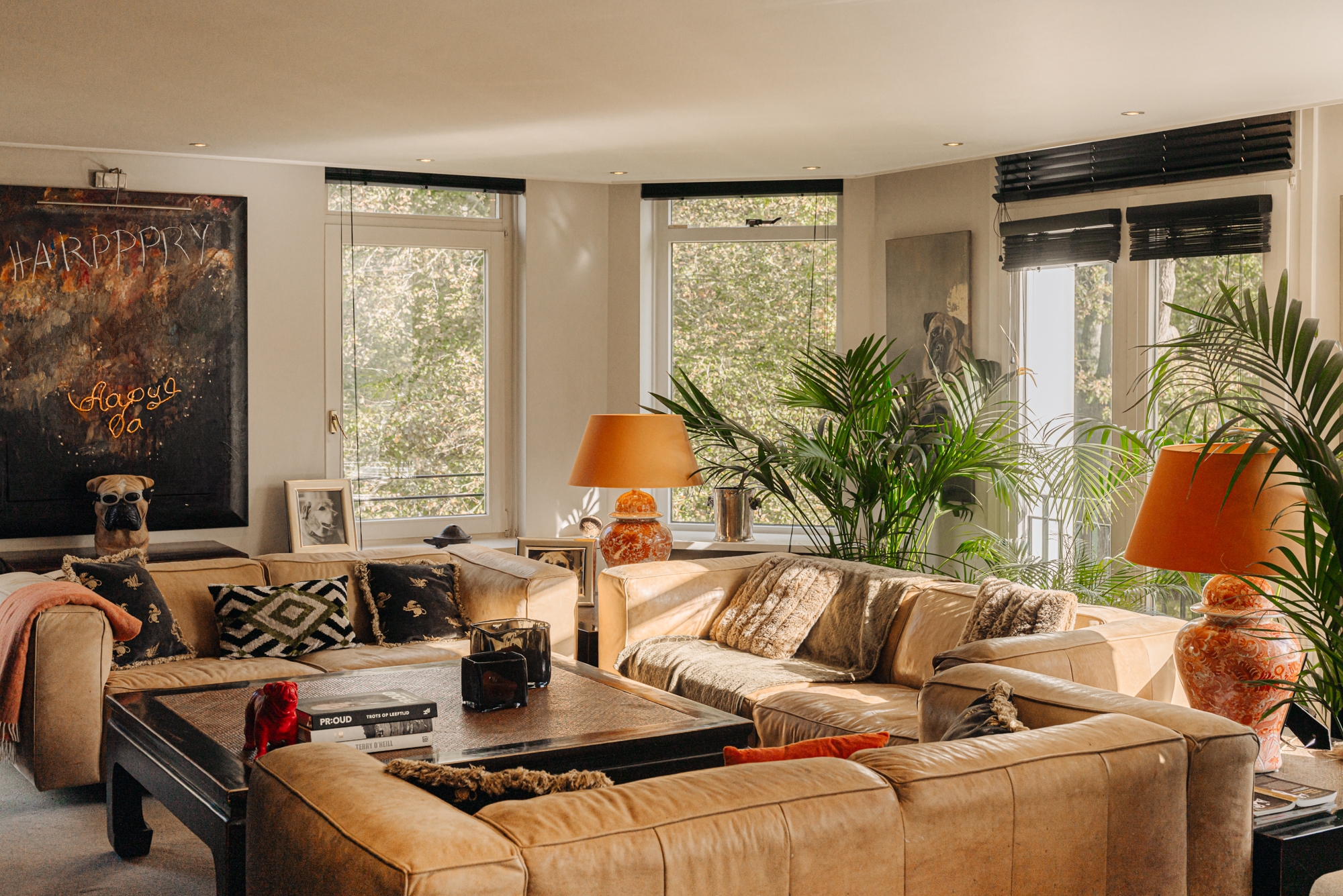 Ruime woonkamer (drie samengetrokken kamers) met gashaard, grote raampartijen en daardoor prachtig uitzicht. Twee balkons omringd door groen.