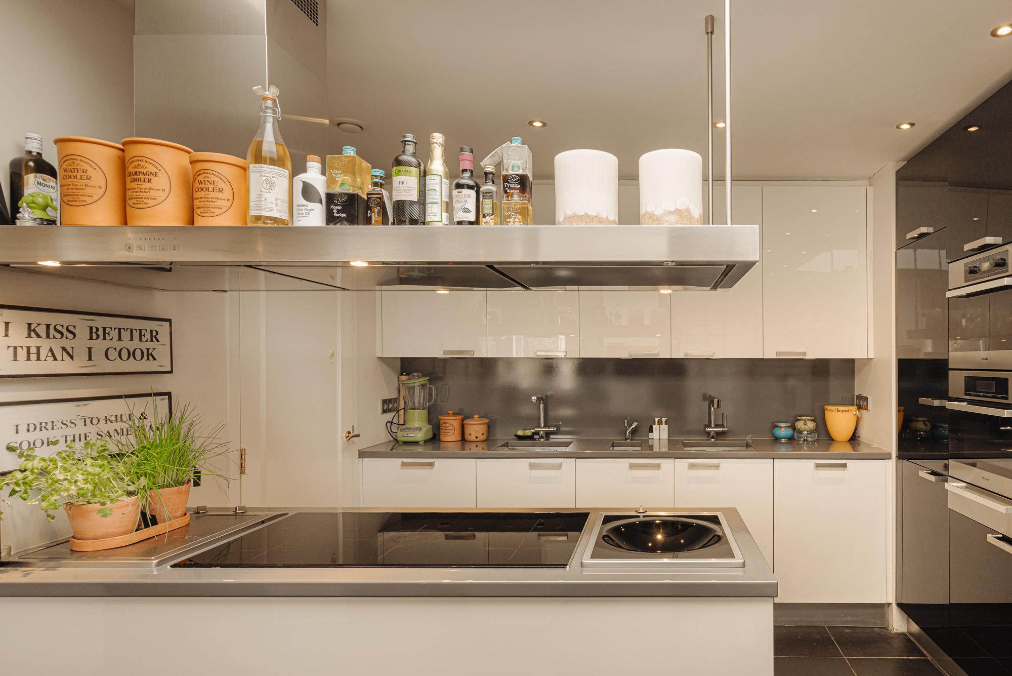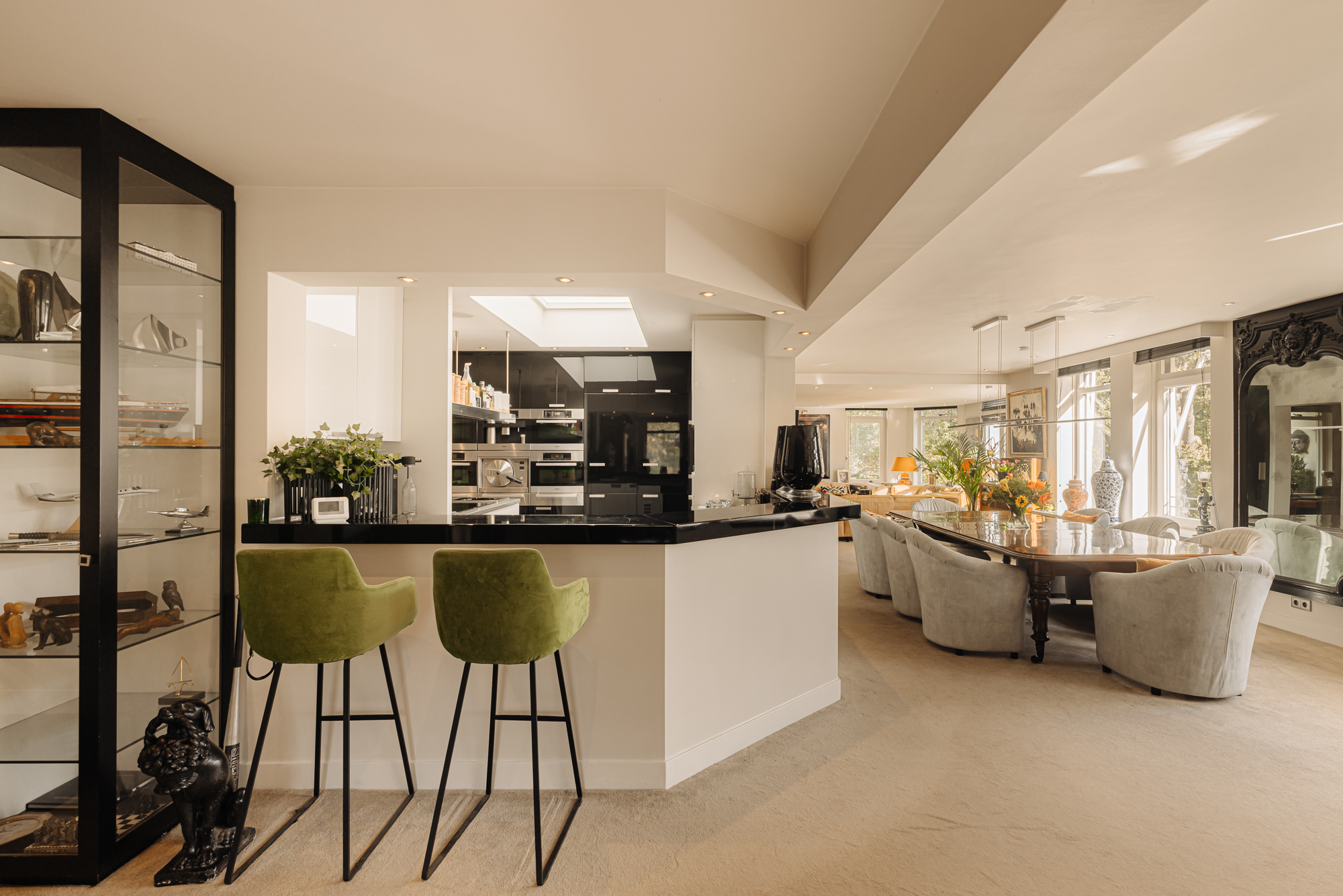 Halfopen designkeuken voorzien van hoogwaardige Miele-apparatuur, waaronder twee ovens en wijnklimaatkasten en een grote bar.