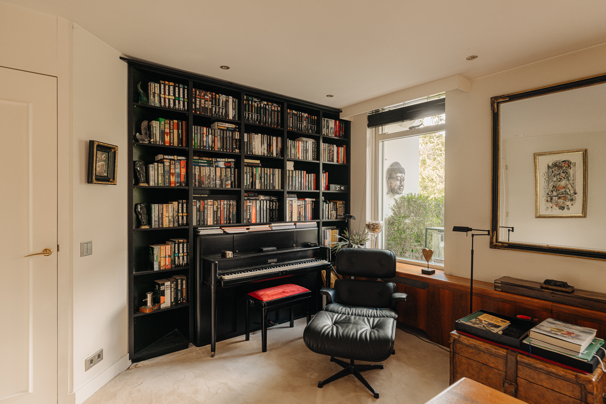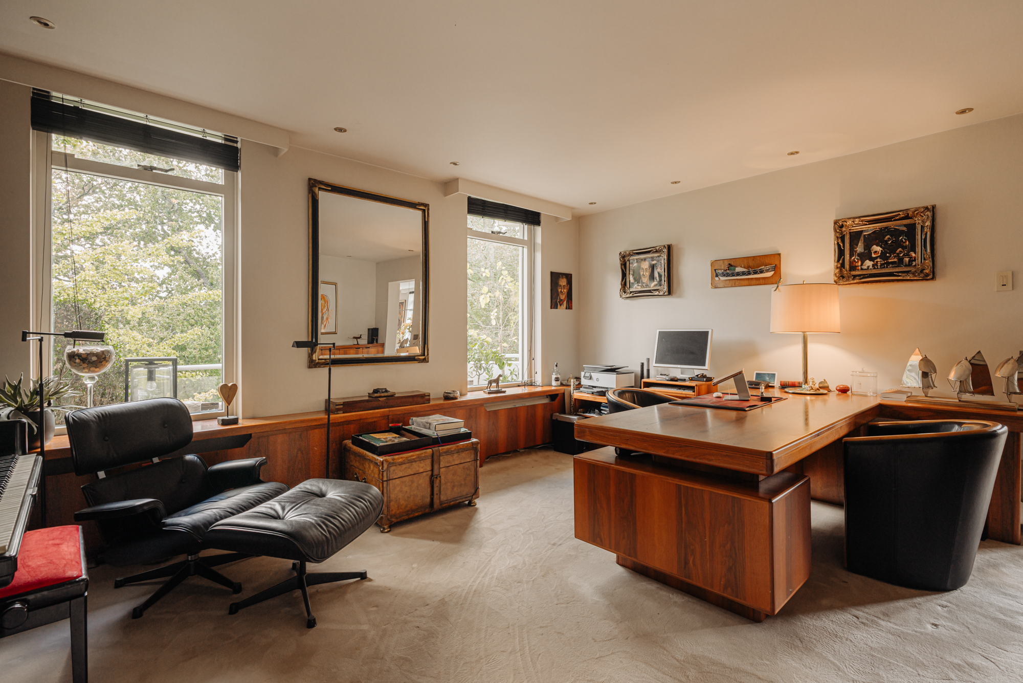 Aparte wasruimte en een aparte berging op de gang. Stijlvolle werkkamer met notenhouten kasten en bureau.