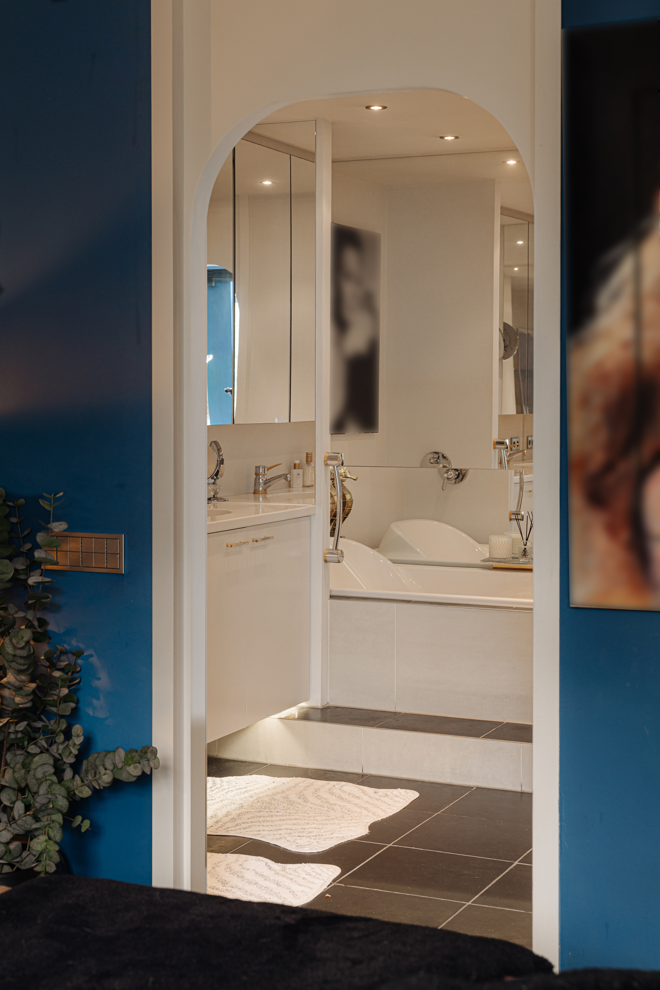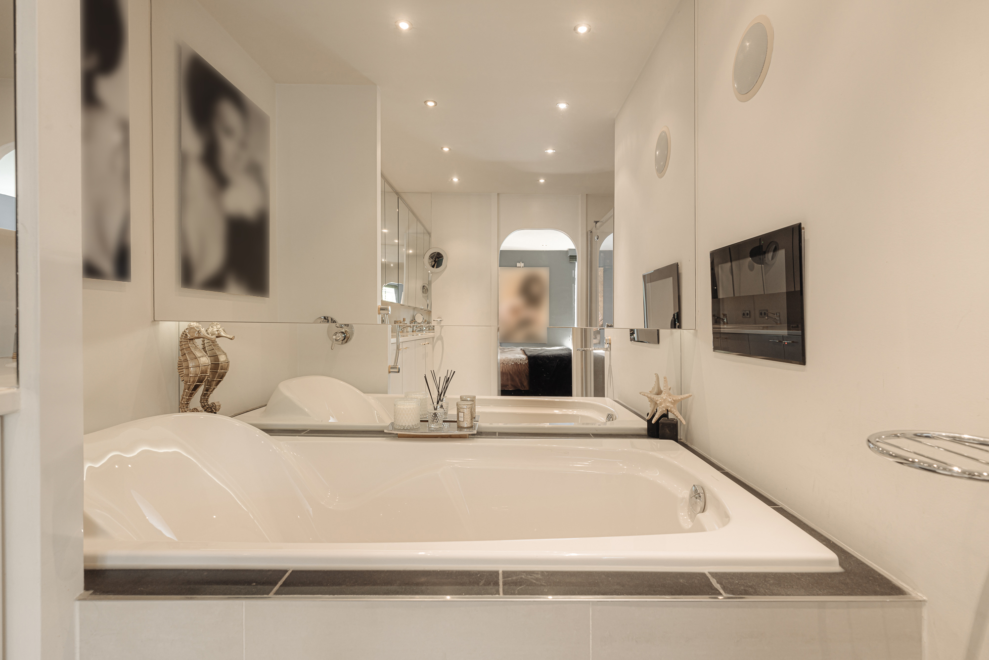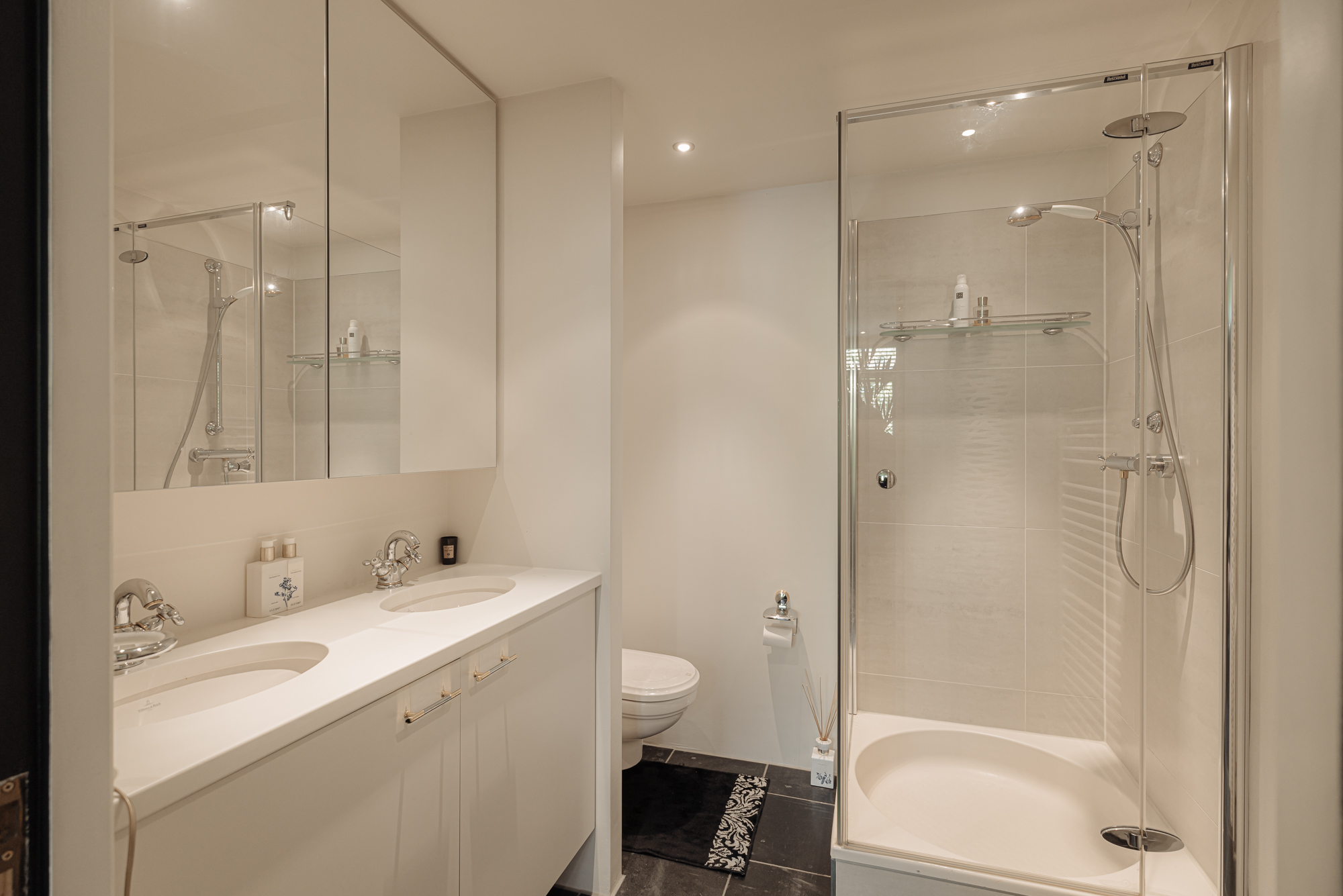 Hoofdslaapkamer aan de achterzijde ensuite badkamer met een stoomdouche, royaal ligbad en een dubbele wastafel. De tweede slaapkamer aan de voorzijde heeft ook een eigen badkamer.