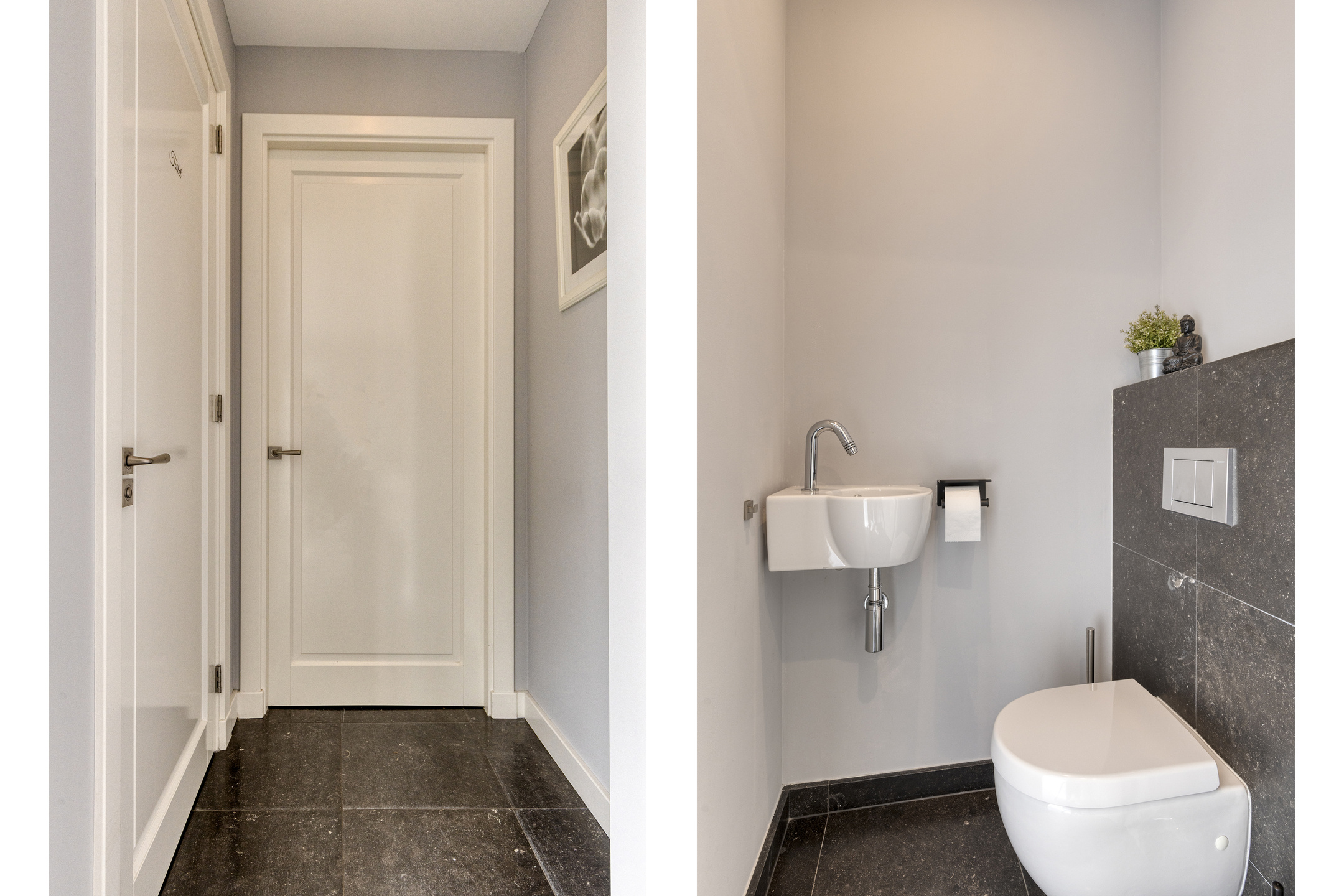 Toilet: separate, with wall-mounted toilet and wash basin; plastered walls finished with natural stone.