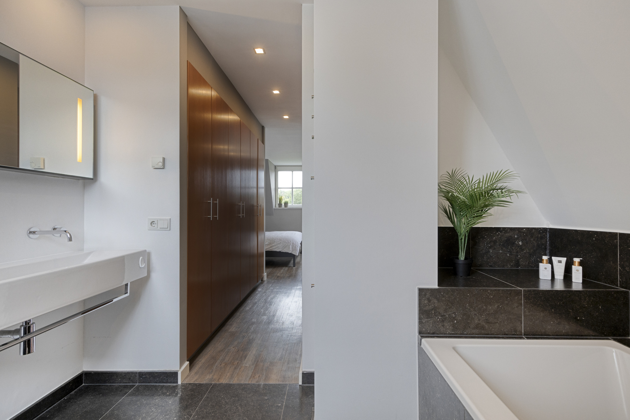 Luxurious en-suite bathroom: finished with natural stone; equipped with large bathtub, walk-in shower, double wash basin and laundry chute to utility room.