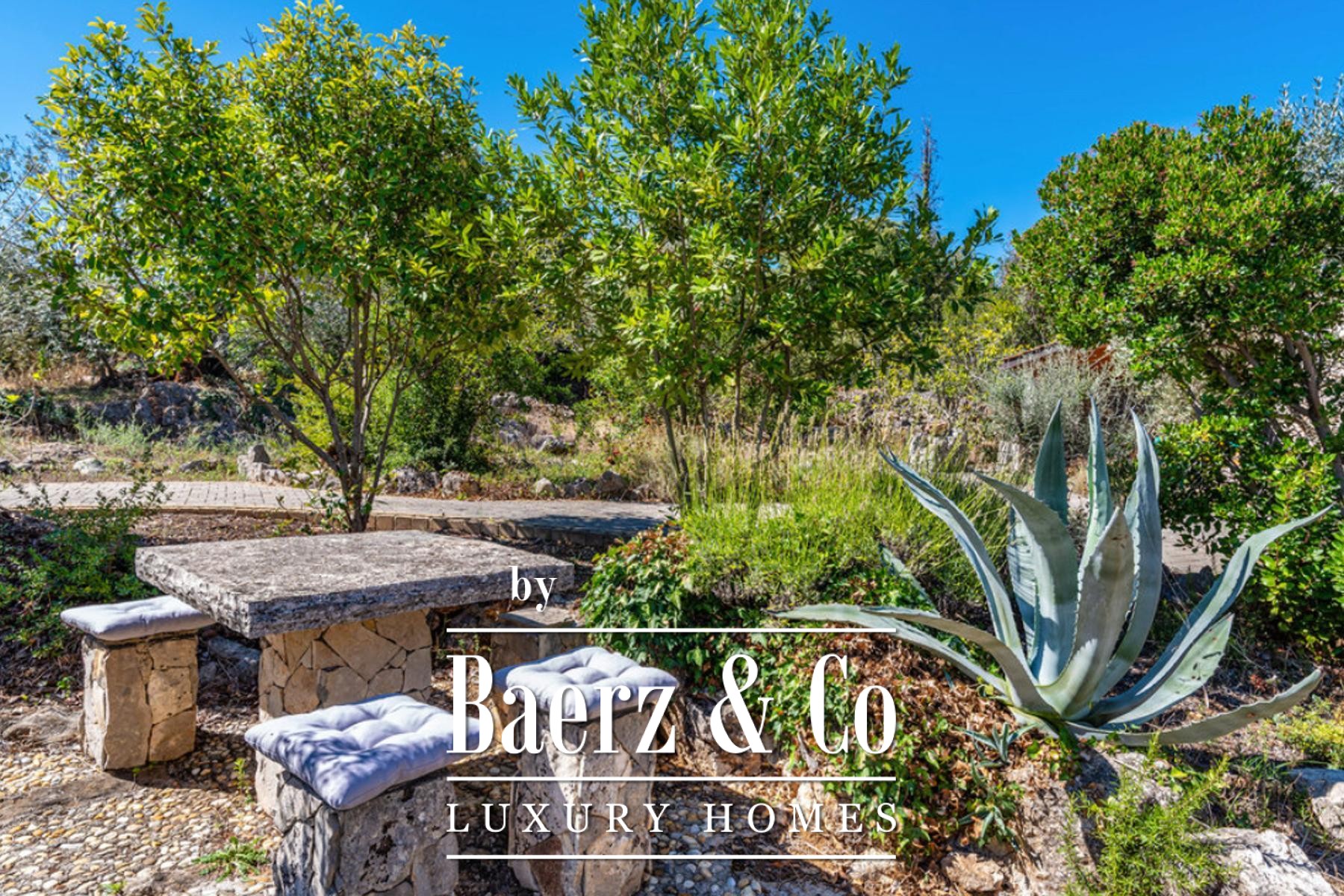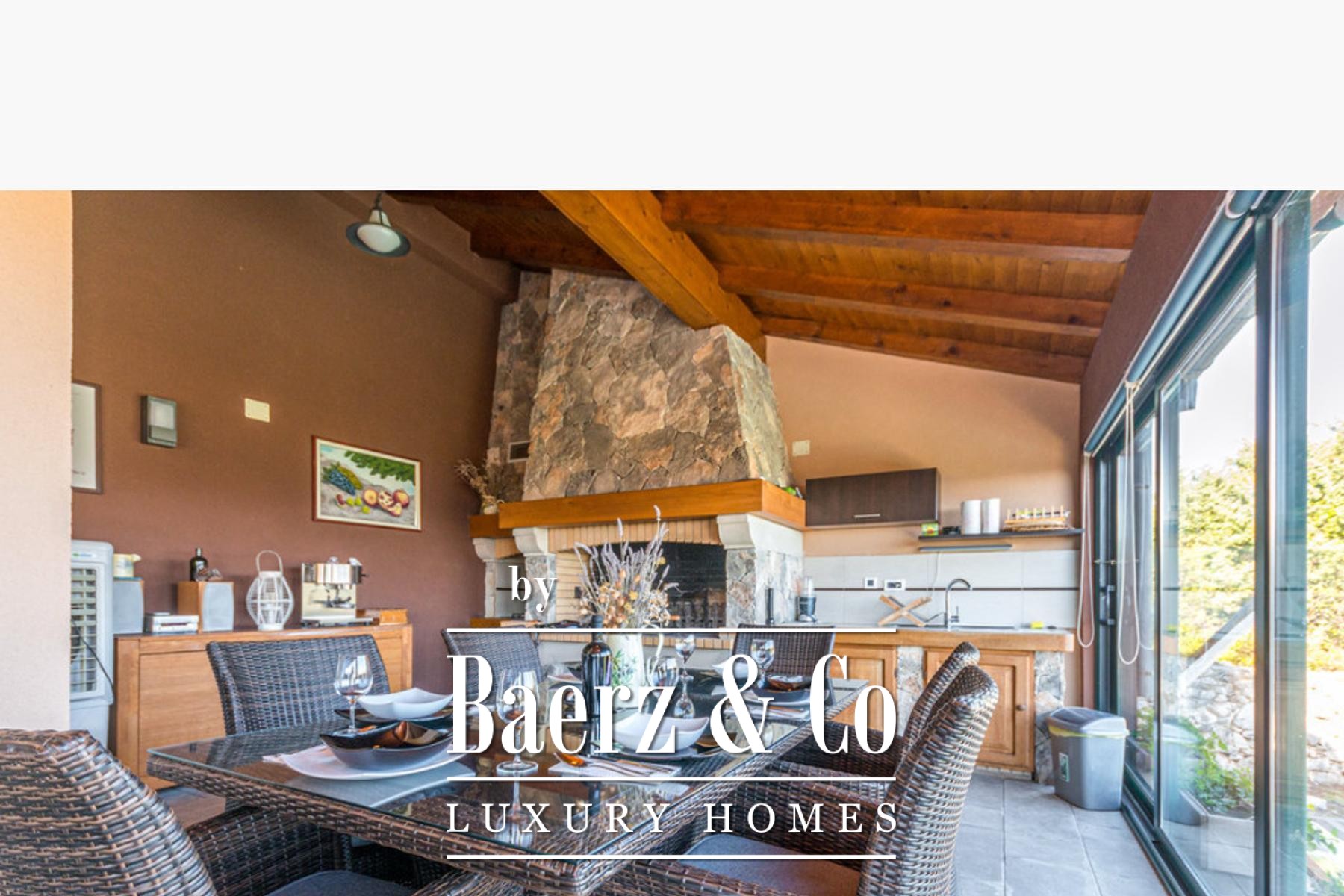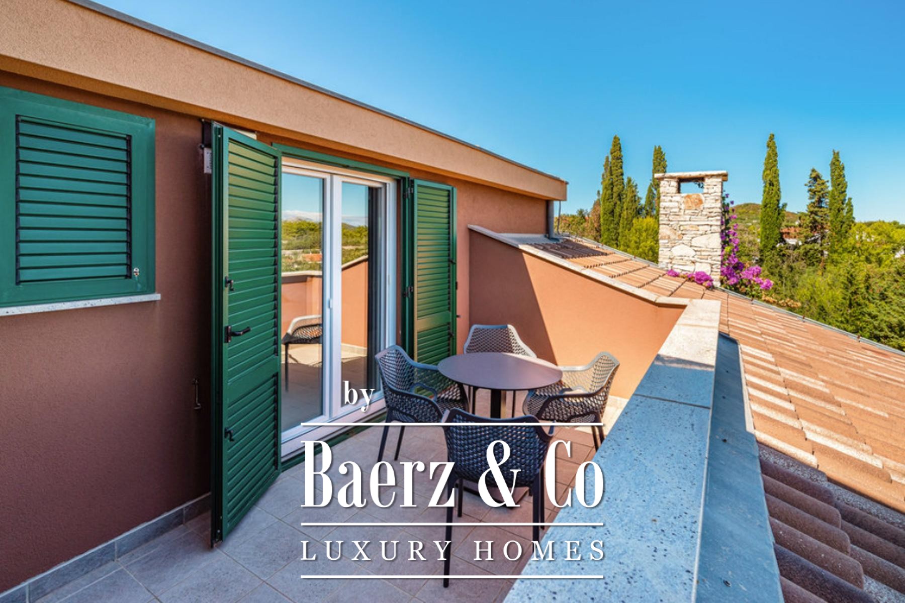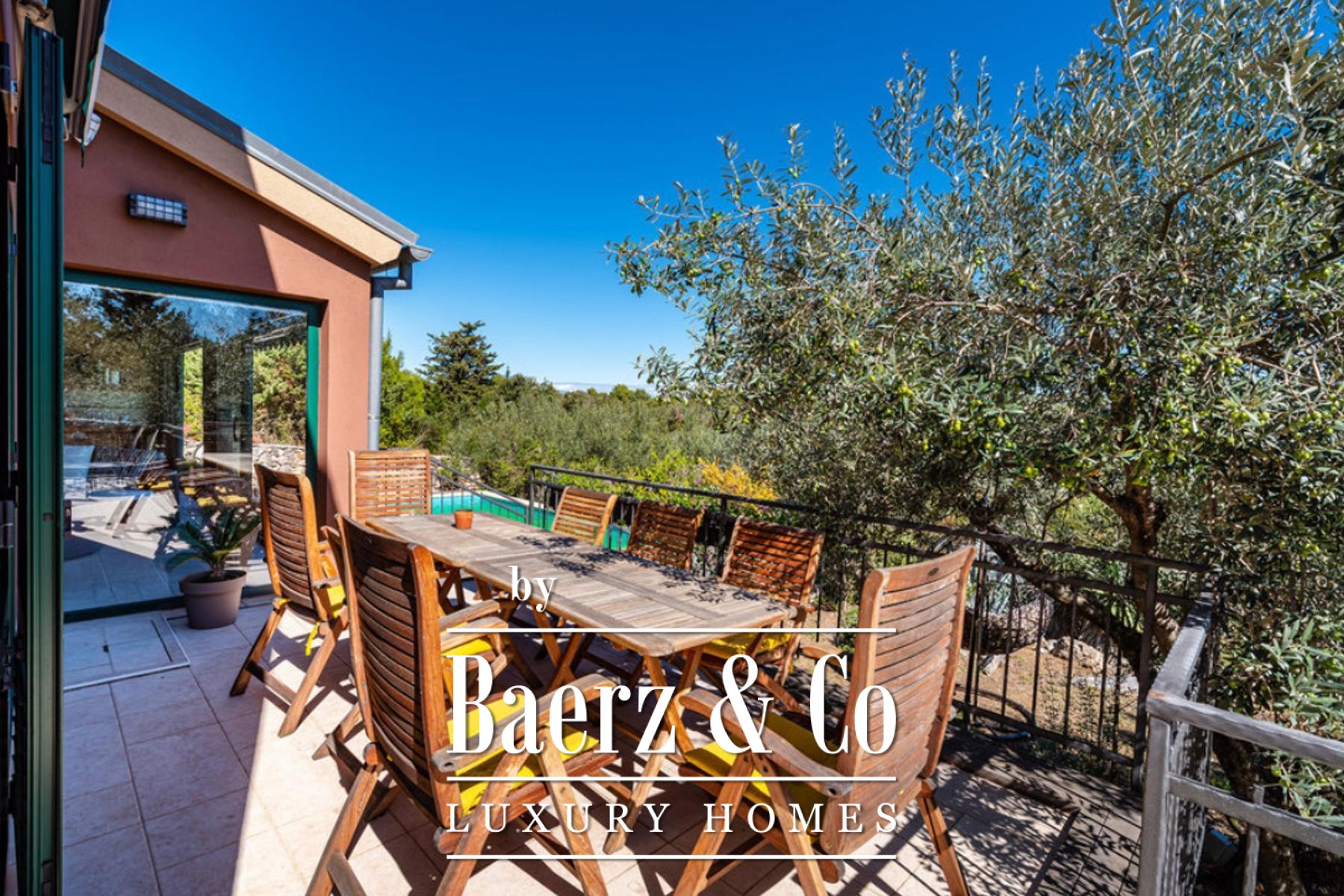 Steps from the sea, private access leads to the beach, flanked by two moorings suited for leisurely days on the water. An additional 330 m² plot houses a 27 m² storage room and garden areas, enclosed by a stone wall and accessed via a gated entrance with secure parking for five cars. The grounds also include an ecological olive grove of 1,100 m², yielding organic extra virgin oil from sixteen mature trees.