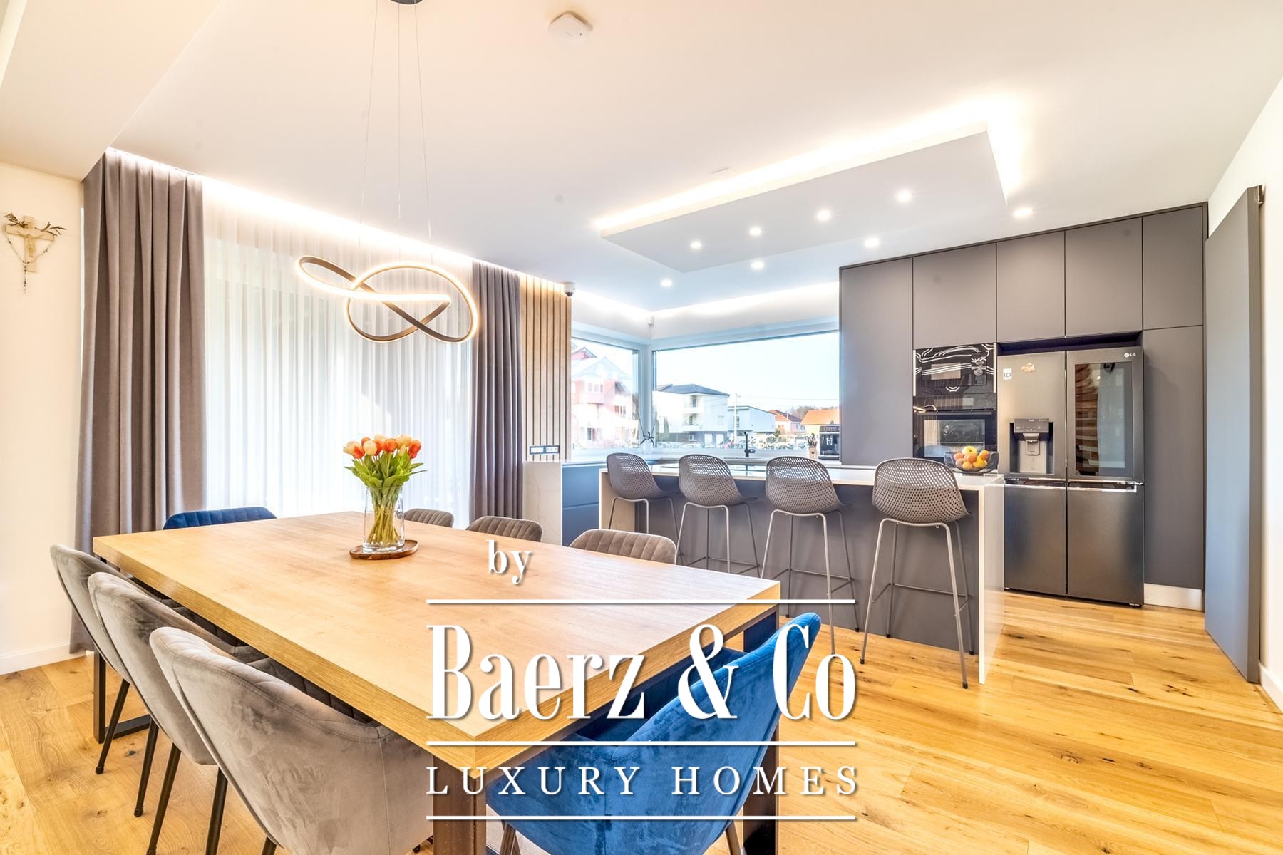 Villa Zaprešić stands as a contemporary five-bedroom residence, offering 330 m² of interior space on a generous 1,050 m² plot in an established residential enclave. This villa Zaprešić for sale is designed for effortless family living, combining privacy with considered architectural detail.