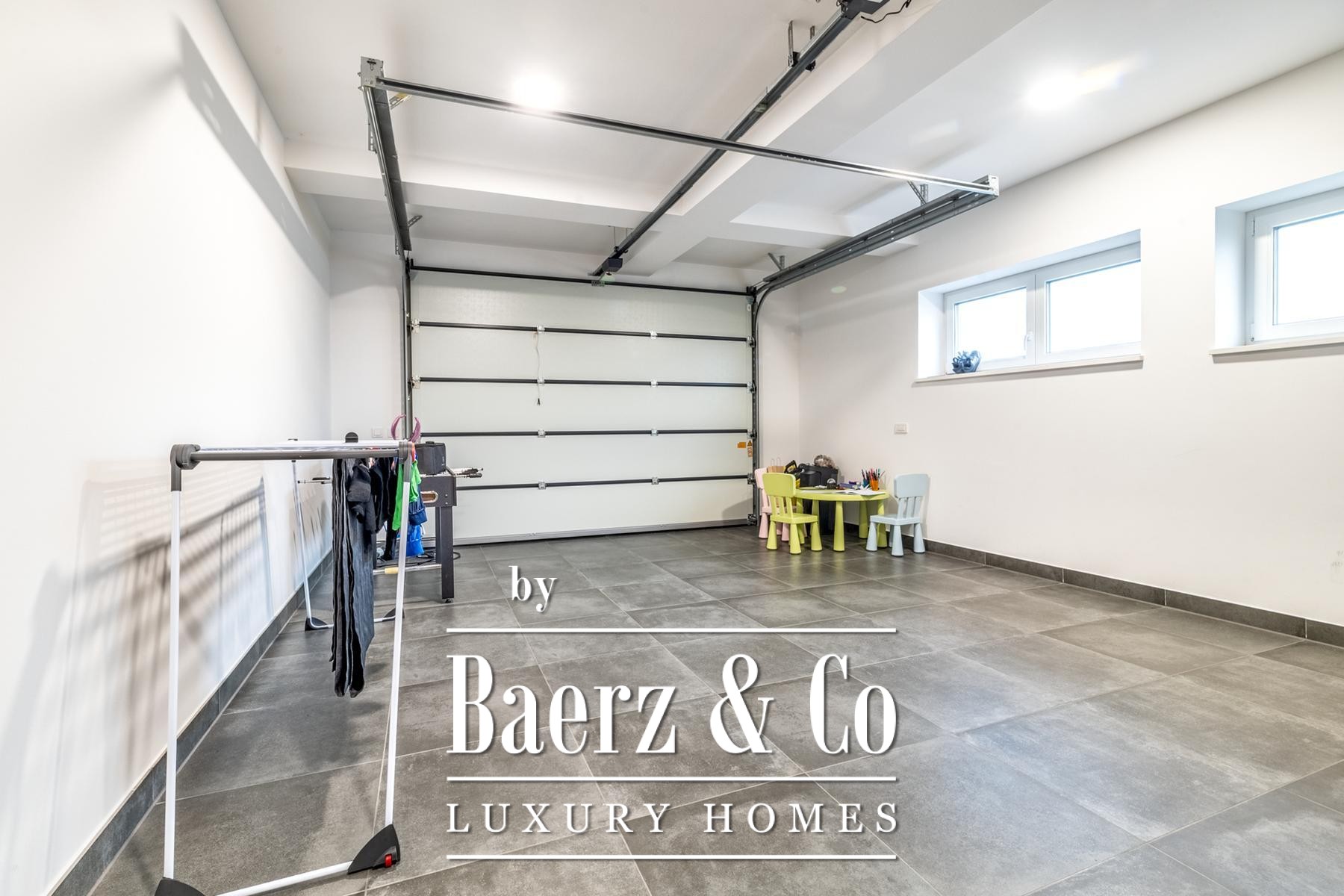 The layout is defined by a sense of flow and proportion. On the ground floor, a living room opens onto a covered terrace and a 700 m² lawn, ideal for gathering or quiet reflection. The adjacent kitchen, pantry, and dining area invite connection, while a bedroom, bathroom, and integrated garage with warm access balance daily rhythms. Upstairs, four large bedrooms each enjoy their own bathroom, and the master suite offers a walk-in closet. Broad balconies on both the north and south encourage moments outdoors.