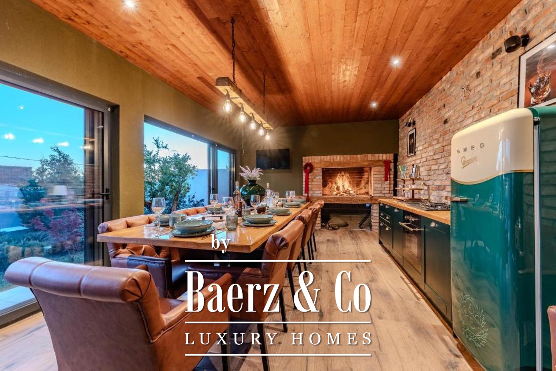Spanning 483 m², the villa is arranged with clarity and purpose. A spacious living room and open kitchen gather the light and flow seamlessly to the garden, where a private swimming pool invites quiet afternoons or convivial evenings. Three thoughtfully appointed bedrooms, each with their own en suite bathroom, allow for privacy and ease across the home. In the grounds, a garden tavern adds a subtle note of tradition, designed for lingering meals or restorative solitude.