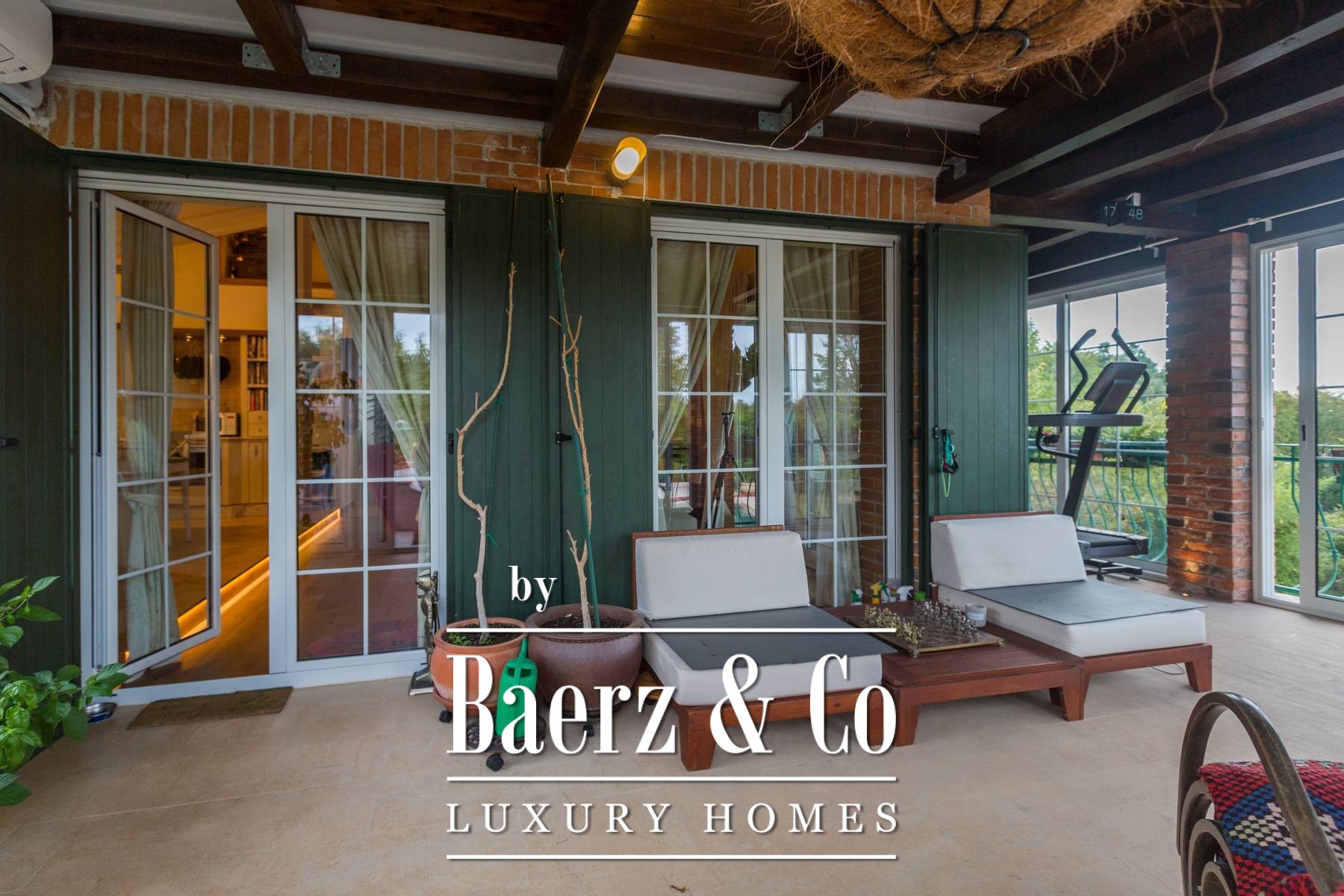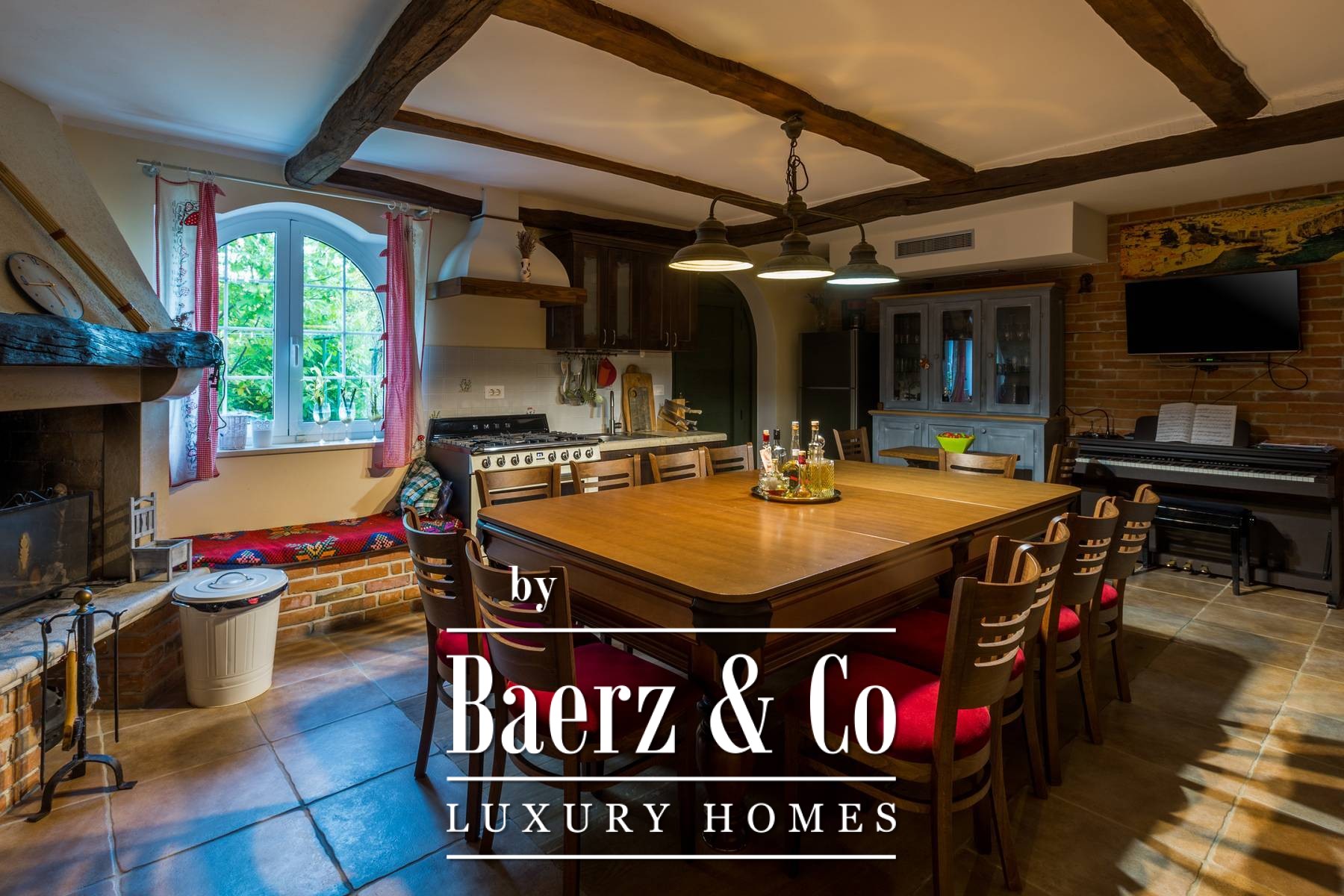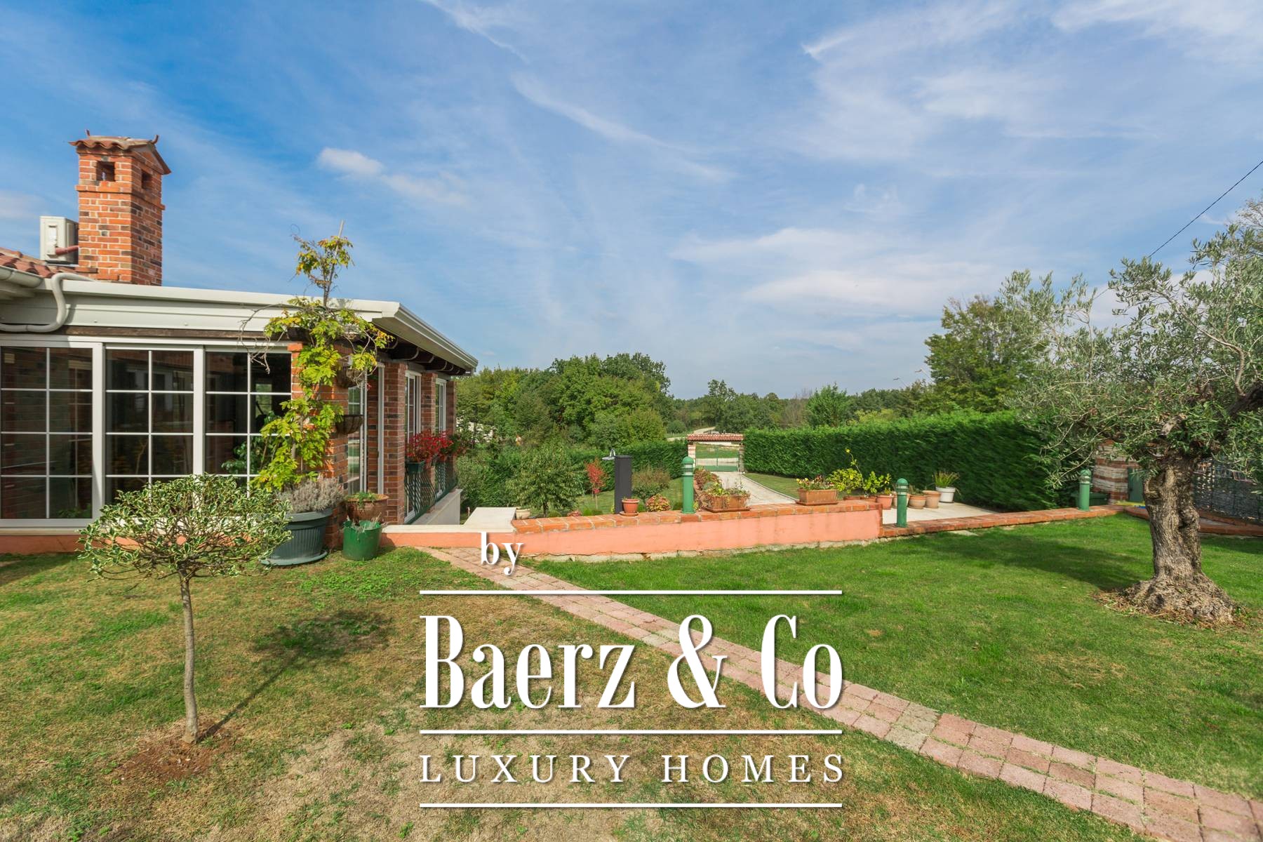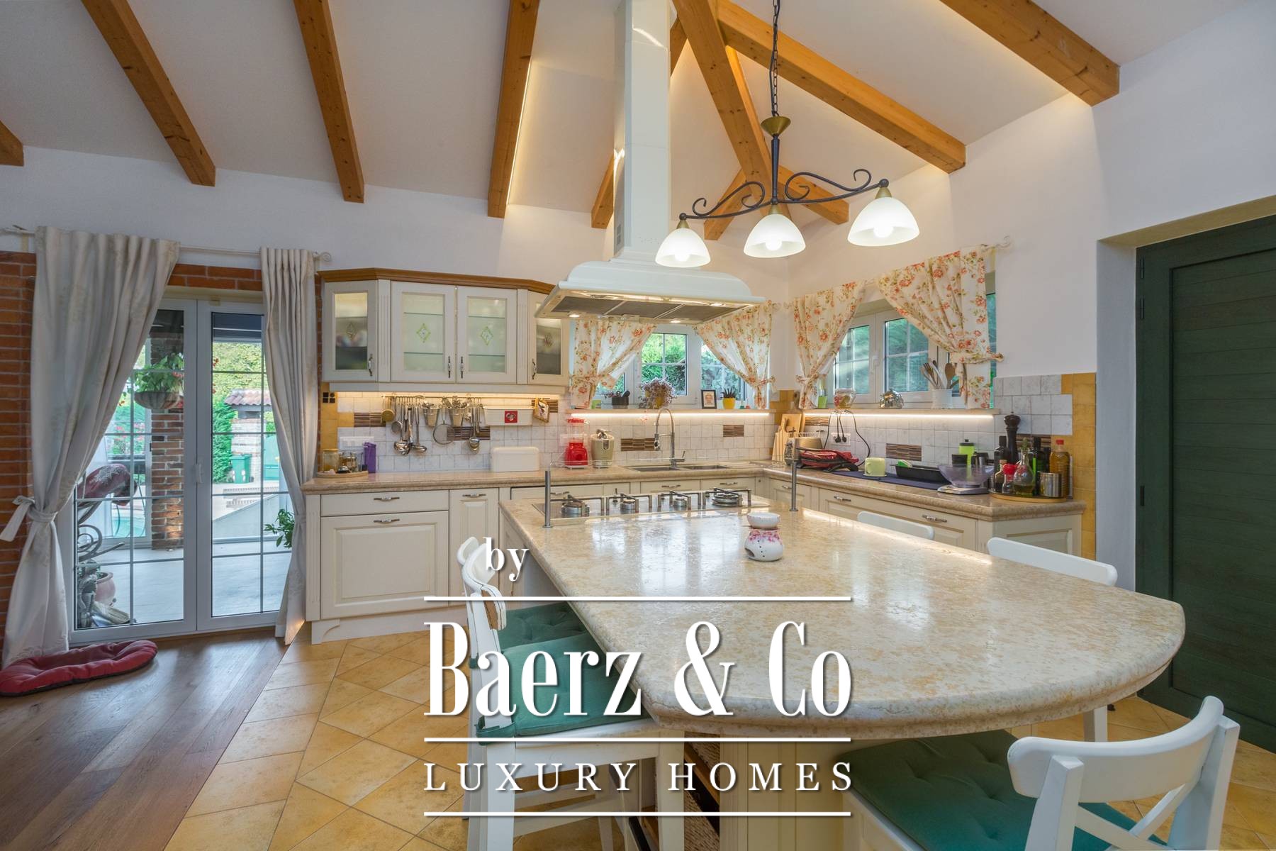 Žminj surroundings, a beautiful villa of 314 m2 on a plot of 1,720 m2. The inspiration of this estate is British architecture, the early period of the 20th century, and at first sight of this beautiful villa it is clear that it is a kind of "Unicorn" in the offer of Istrian real estate. This villa has a timeless design. It has an ideal location, it is located at the end of a quiet village where you can enjoy walking in the forest area, and yet a few minutes' drive from the market, school, restaurants, pharmacy. Also, quick access to the highway leads to major destinations such as Pula, Rovinj, Poreč, Rijeka or Trieste in about 30 minutes' drive. The house is basically on two floors. The residential part is located on the upper floor or on the ground floor. By entering the house, we access a large space with an open floor plan and high ceiling that unites the living room and the kitchen. Then we continue into the hallway with three