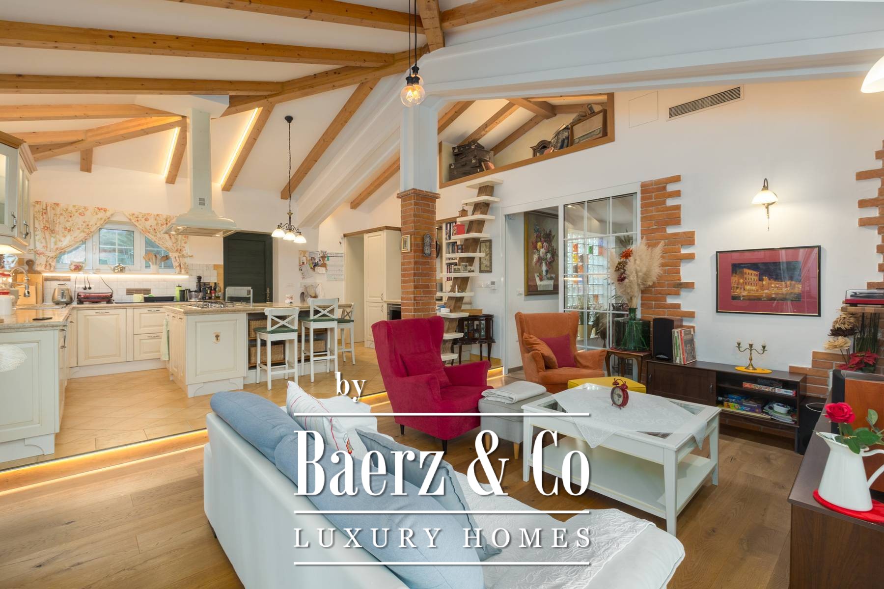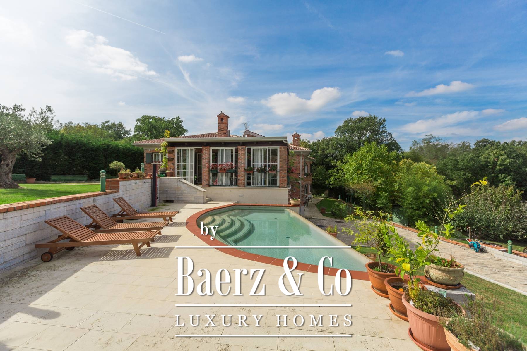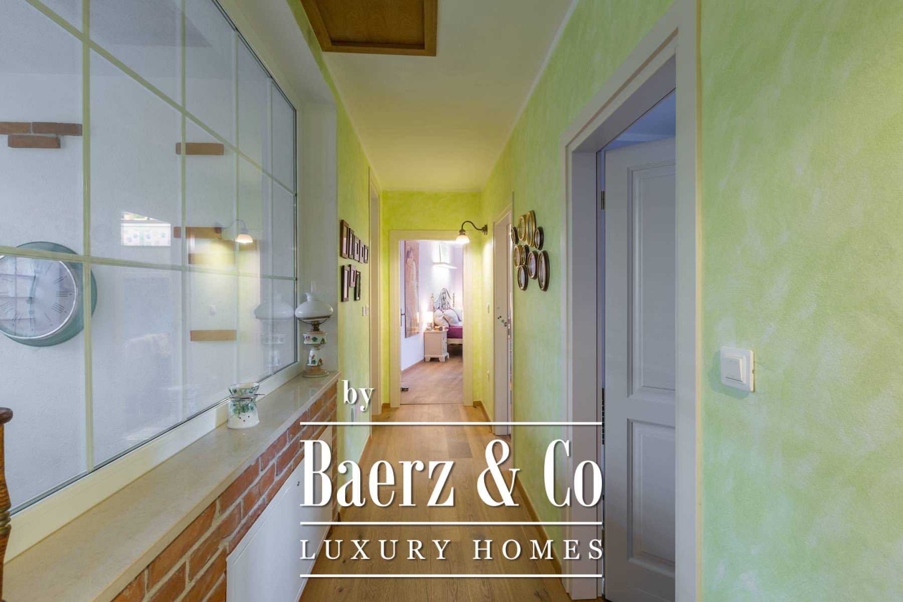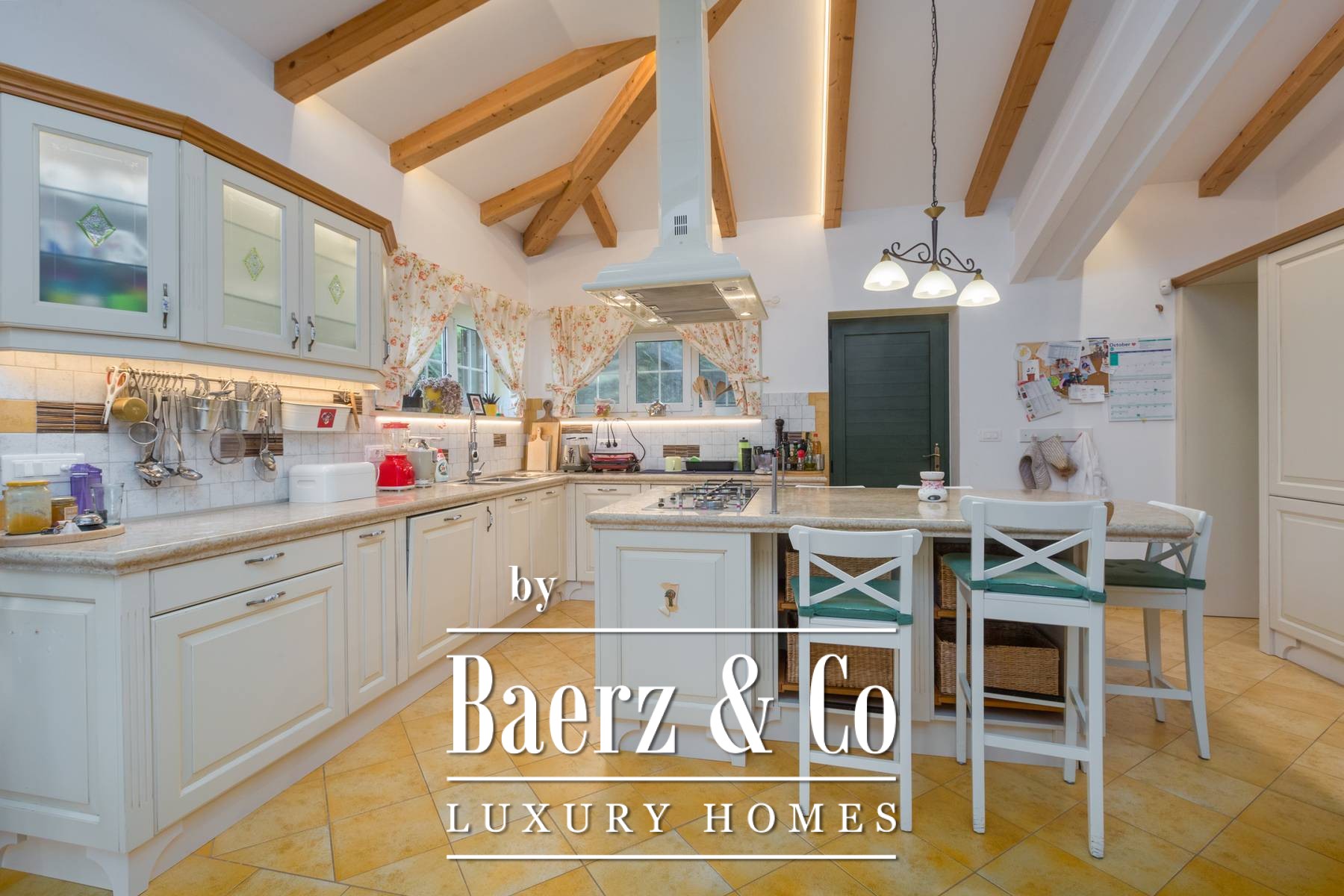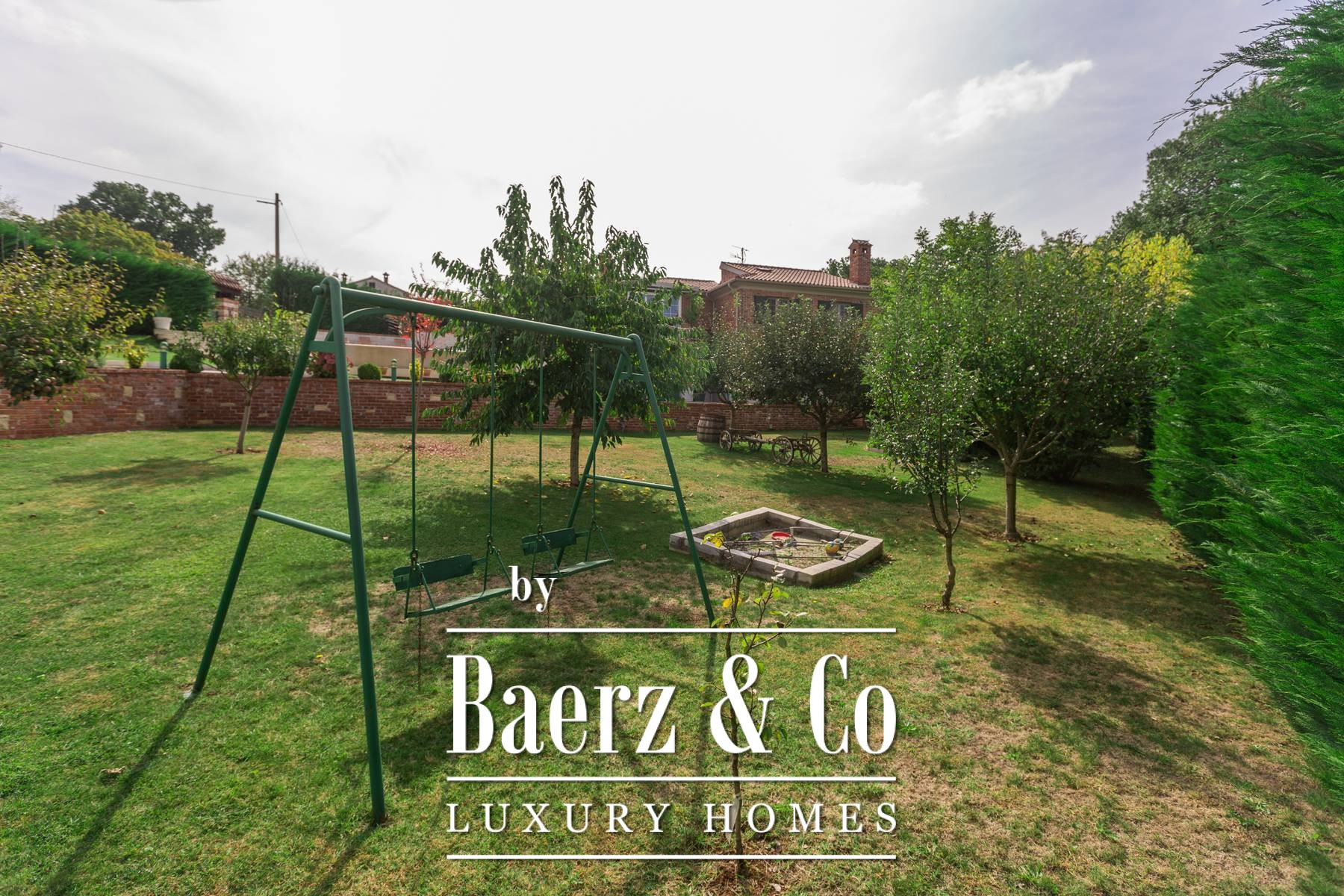 Žminj surroundings, a beautiful villa of 314 m2 on a plot of 1,720 m2. The inspiration of this estate is British architecture, the early period of the 20th century, and at first sight of this beautiful villa it is clear that it is a kind of "Unicorn" in the offer of Istrian real estate. This villa has a timeless design. It has an ideal location, it is located at the end of a quiet village where you can enjoy walking in the forest area, and yet a few minutes' drive from the market, school, restaurants, pharmacy. Also, quick access to the highway leads to major destinations such as Pula, Rovinj, Poreč, Rijeka or Trieste in about 30 minutes' drive. The house is basically on two floors. The residential part is located on the upper floor or on the ground floor. By entering the house, we access a large space with an open floor plan and high ceiling that unites the living room and the kitchen. Then we continue into the hallway with three