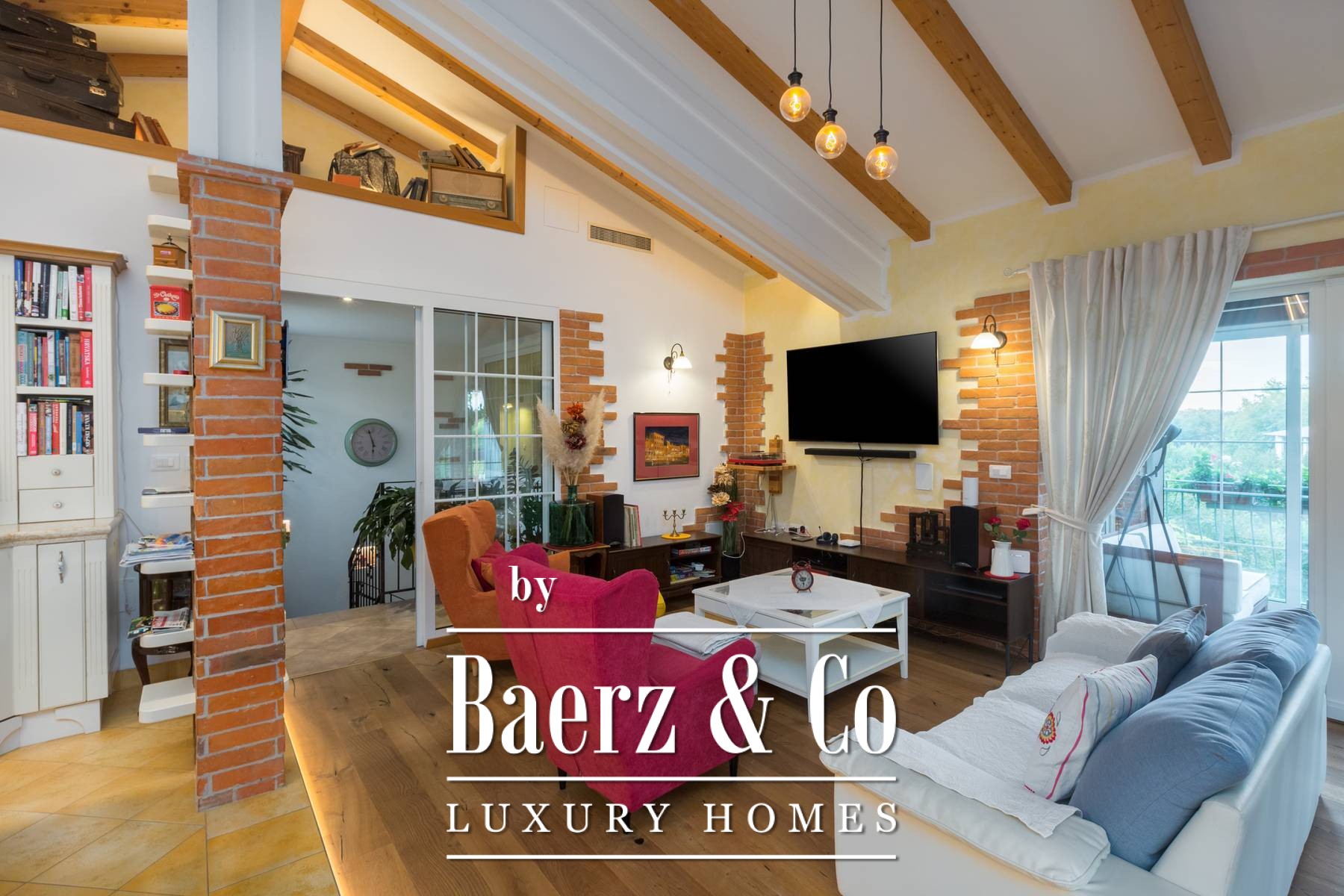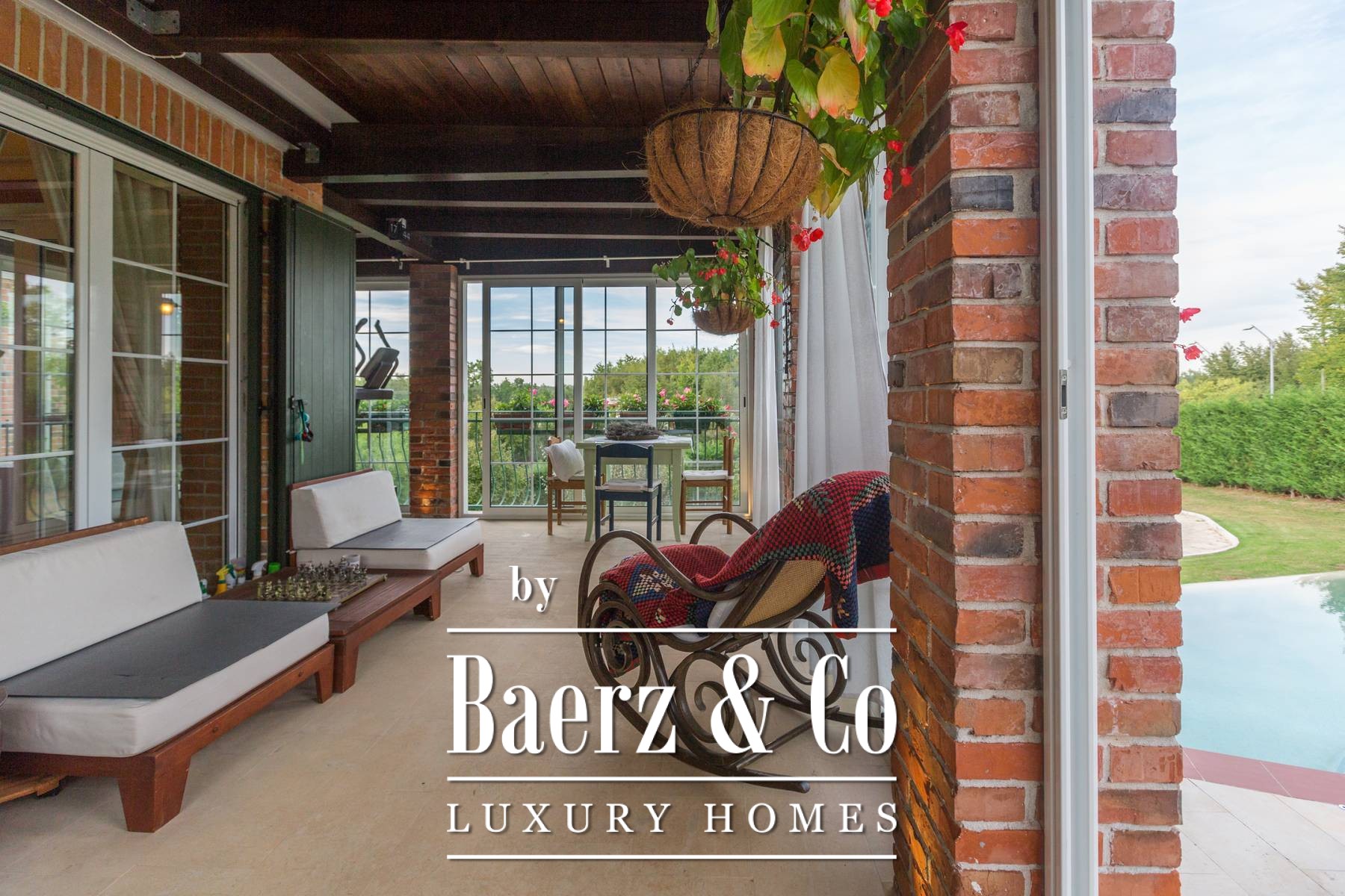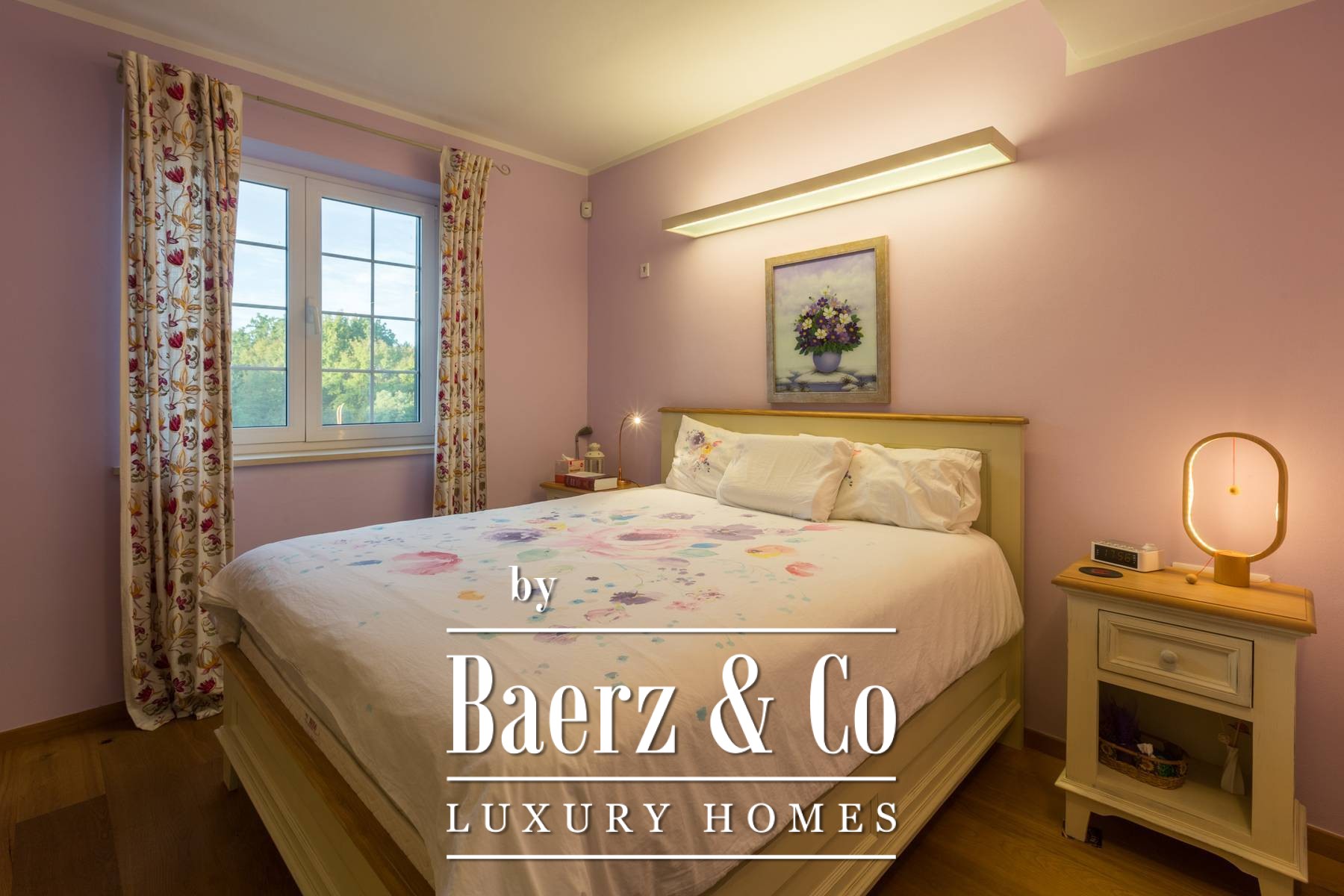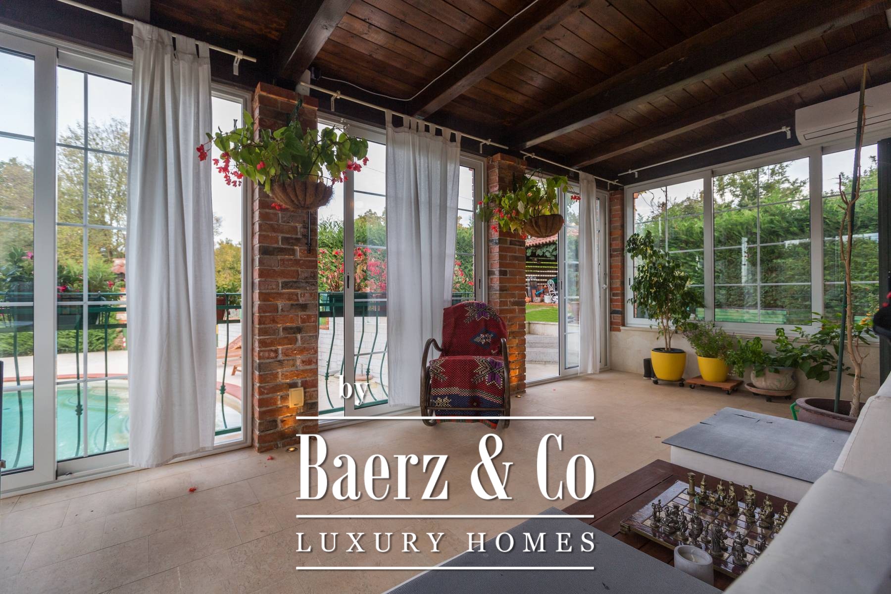Žminj surroundings, a beautiful villa of 314 m2 on a plot of 1,720 m2. The inspiration of this estate is British architecture, the early period of the 20th century, and at first sight of this beautiful villa it is clear that it is a kind of "Unicorn" in the offer of Istrian real estate. This villa has a timeless design. It has an ideal location, it is located at the end of a quiet village where you can enjoy walking in the forest area, and yet a few minutes' drive from the market, school, restaurants, pharmacy. Also, quick access to the highway leads to major destinations such as Pula, Rovinj, Poreč, Rijeka or Trieste in about 30 minutes' drive. The house is basically on two floors. The residential part is located on the upper floor or on the ground floor. By entering the house, we access a large space with an open floor plan and high ceiling that unites the living room and the kitchen. Then we continue into the hallway with three