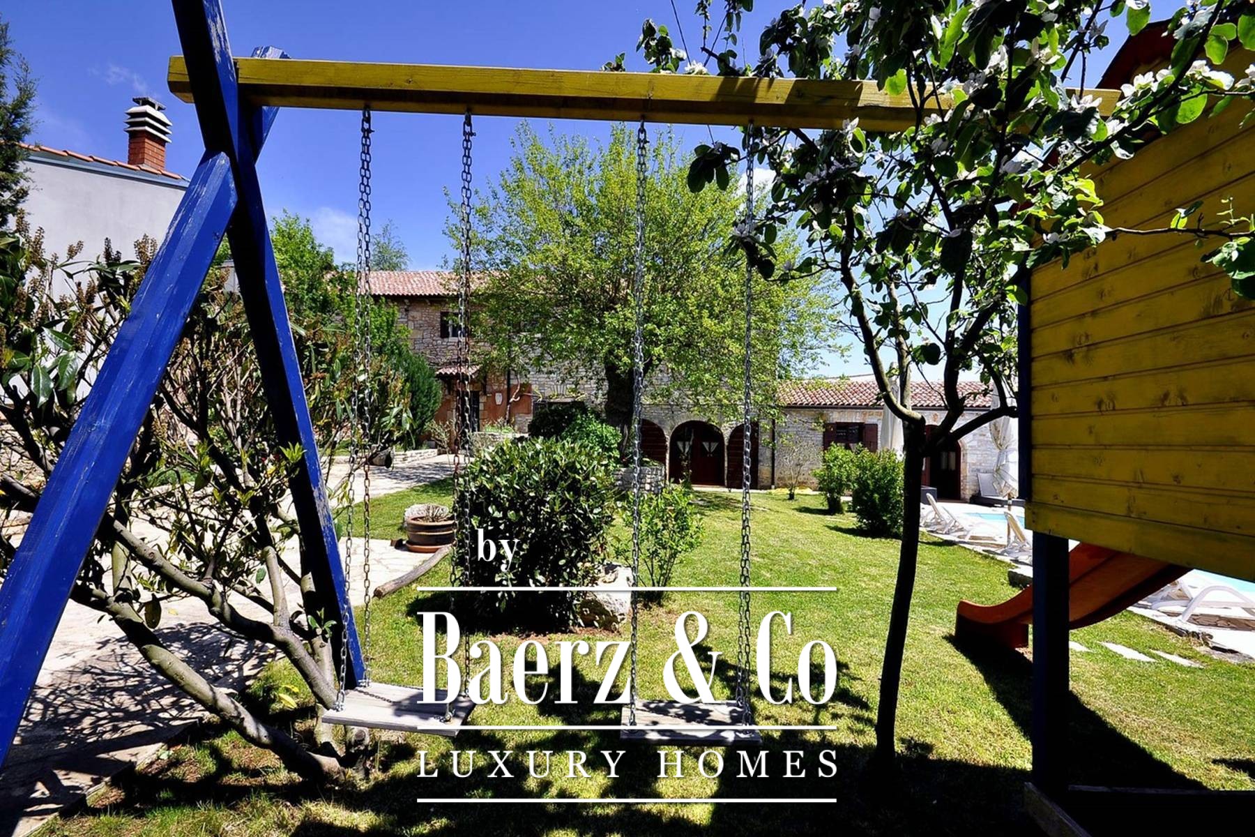 The secured 1,800 m² grounds reveal a covered terrace, stone grill, children’s playground and a 55 m² heated saltwater pool framed by planted borders and lawns. The setting invites both quiet contemplation and convivial gatherings, with shaded outdoor dining and a sunbathing area reinforcing the villa's rhythm of relaxed living. Well connected and private, Villa Žminj offers access to the pace of village life with its agritourism scene and traditional festivities, all while providing a five-star standard ideal for either investment or a spacious family home. The villa's narrative is distinctly Istrian, securely rooted and ready to be quietly enjoyed.