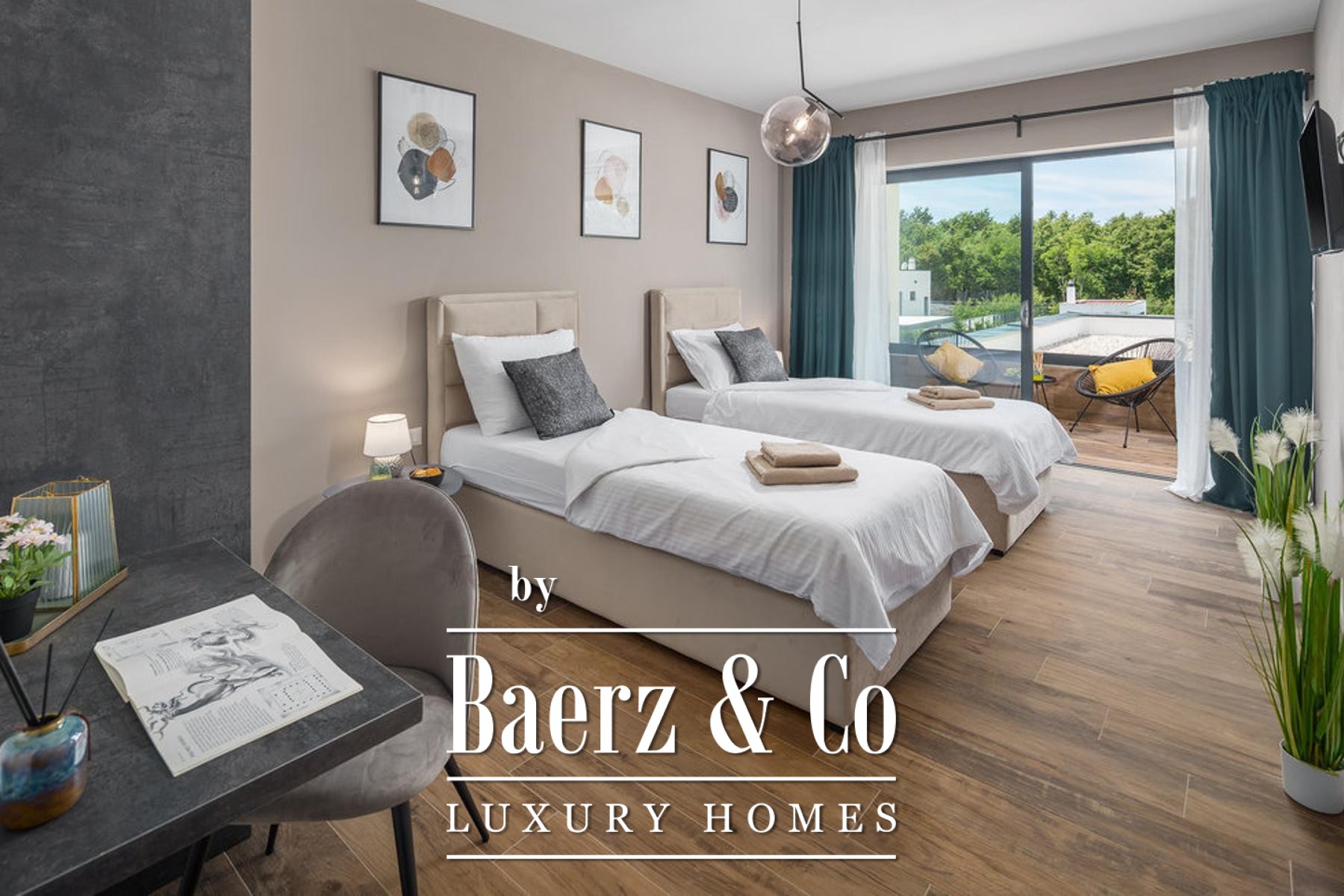 In central Istria, in the small village of Šivati, this modern villa with a total living area of 308 m2 is located, with an additional building of 34 m2, an outdoor pool, a sauna, a jacuzzi on a plot of 1136 m2.The villa is spread over two floors, on the first floor on the ground floor there is one bedroom with its own bathroom, a spacious living room with a kitchen and a dining area in an open space.On the ground floor, we would definitely highlight an additional building of 34 m2 where there is a bedroom with its own bathroom, a sauna and a Jacuzzi for relaxation after a hard day.On the first floor, there are three comfortable bedrooms, each with its own